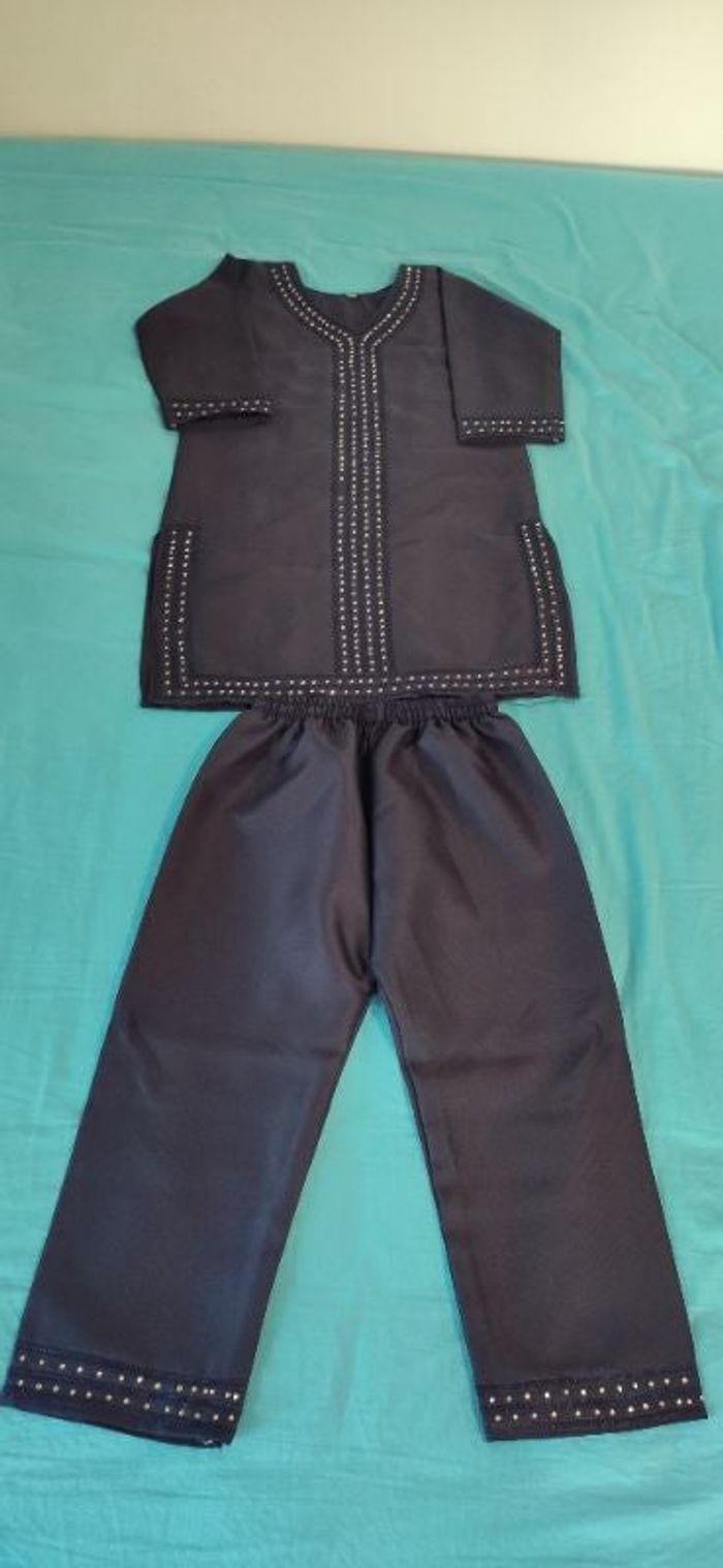 Ensemble marocain fille 5 an neuf sans étiquette, reçu en cadeaux du Maroc. Je pense correspond à un 5 an, voir photos pour les mesures. J'ai remarqué qu'il manquait 2-3 strass en prenant la photo (voir 4eme photo)