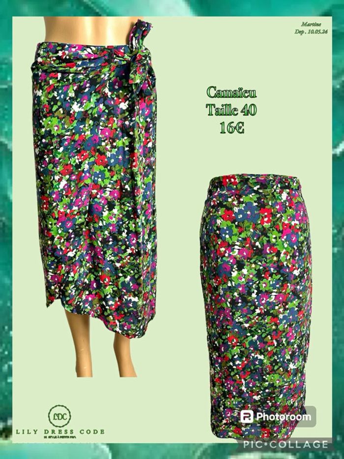 💚 Jupe portefeuille fleurie Camaïeu – fond noir multicolore – Taille 40 SOLDÉ -20% 💚