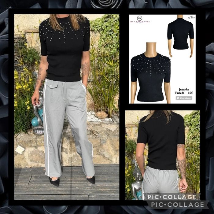 🖤 Taille M – Élégance intemporelle 🖤 🖤 Matière : maille douce stretch, agréable à porter 🖤 Coupe : cintrée, flatte la silhouette 🖤 Détails perles : broderie effet “collier de perles” sur le haut du buste 🖤 Col : ras-du-cou moderne 🖤 Manches : courtes et ajustées 🖤 Look idée : canon porté avec un pantalon fluide ou une jupe crayon 🖤 Occasions : idéal pour un look bureau chic, un dîner ou une sortie habillée 🖤 Prix : 15€ ⸻ #topnoir #perles #chic #modefemme #lookélégant #ootd #vintedpro #lilydresscode #hautcintré #jennifer