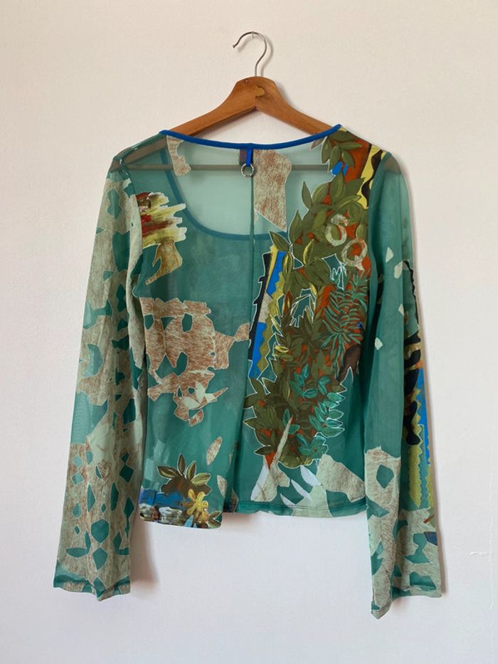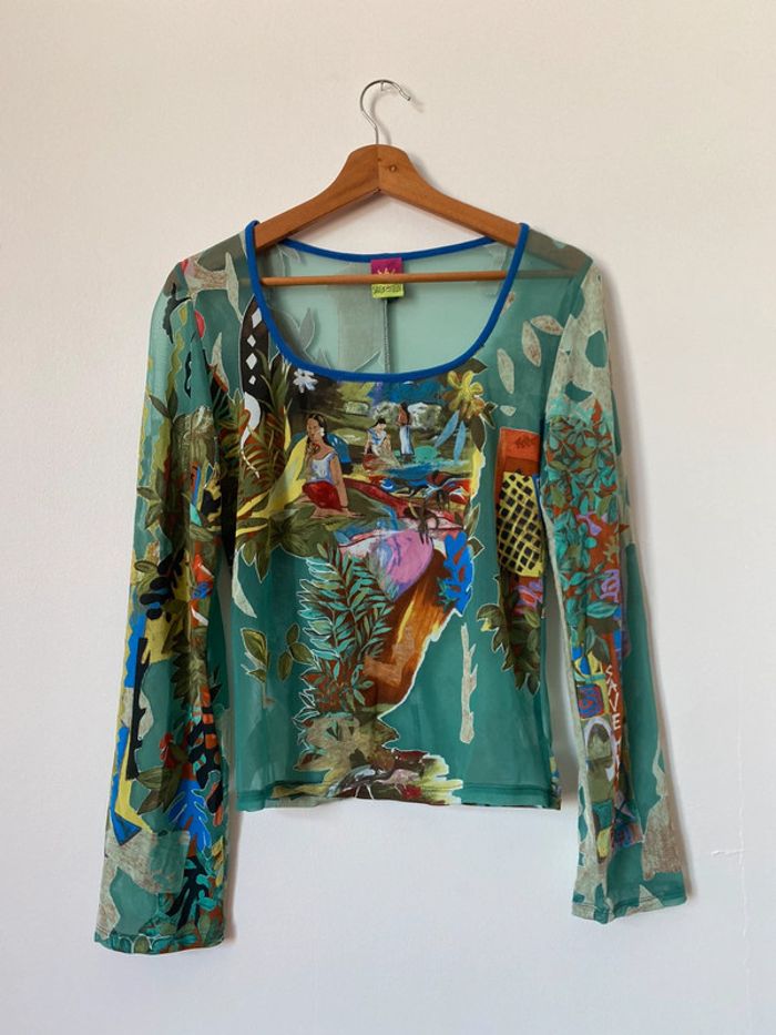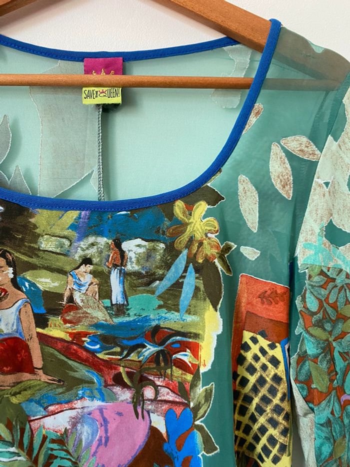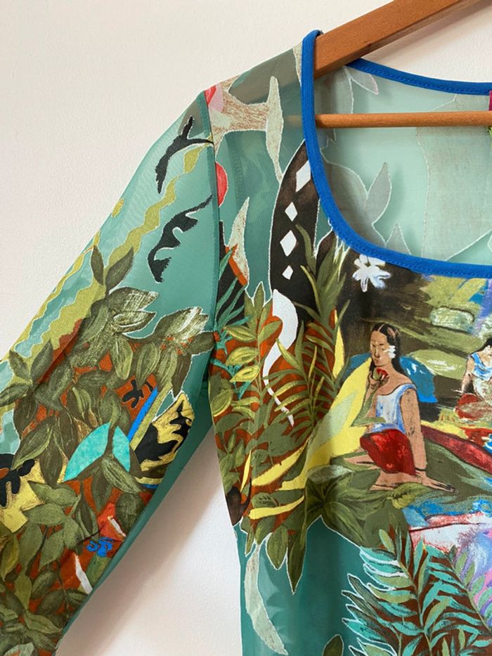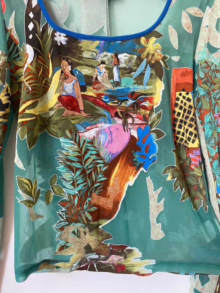 Haut manches longues long sleeves bariolé mesh elasthanne fluide col carré large rond motif visage face tête head femme woman portrait vintage makeup nepo années 50 60 70 80 90 matisse neck magazine tv show autochtone peuple population indigène tribale tribu tradition traditionnel coutumes world monde feuille leaf fleurs flowers floral fleuri hawaii vacances holiday isle île paradis paradise jungle forêt amazonienne Amazonie amazone turquoise bleu blue multicolore colorful coloré vert d’eau aquamarine aqua marine lagoon lagon mer sea ocean rivière fleuve water plant plante art paint painting peinture museum musee french Paris parisian monet