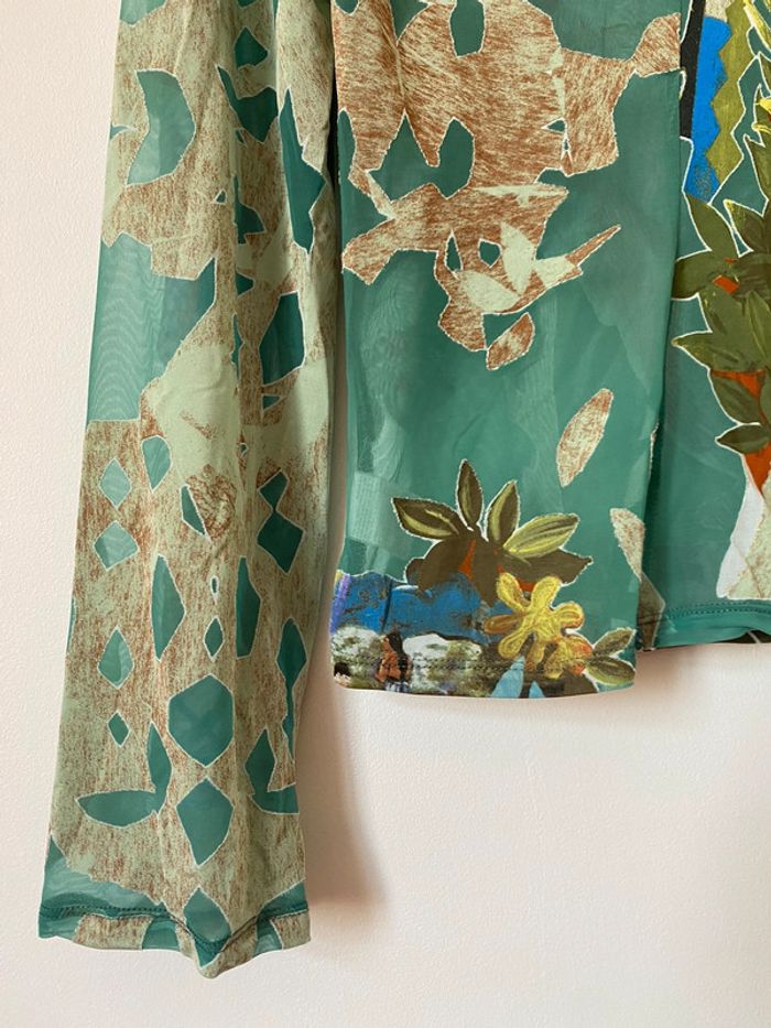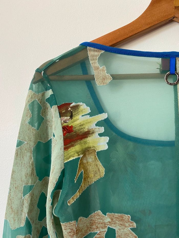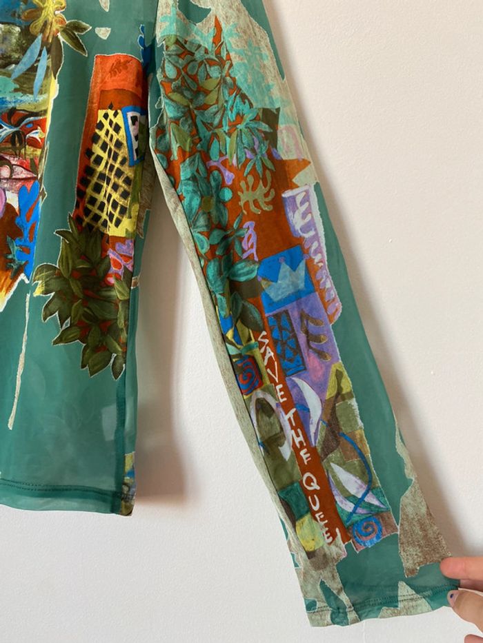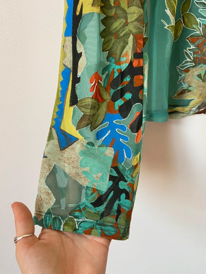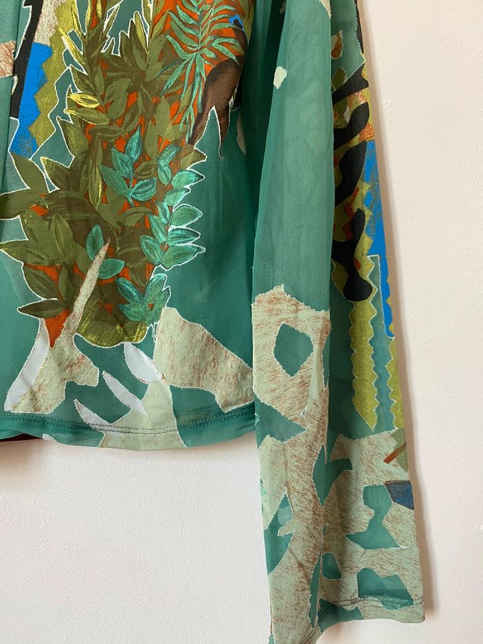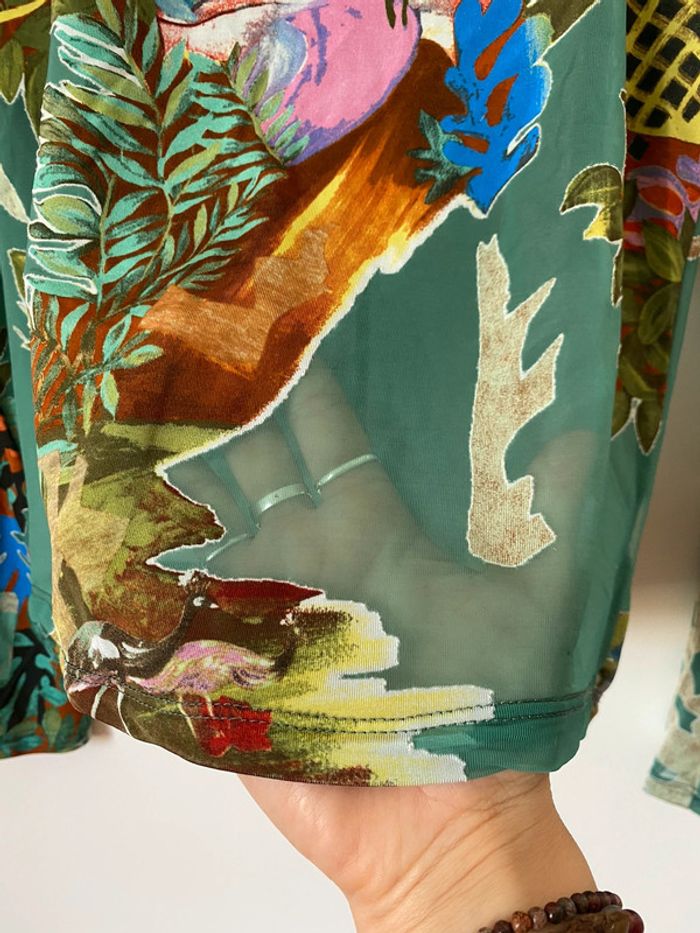 Haut manches longues long sleeves bariolé mesh elasthanne fluide col carré large rond motif visage face tête head femme woman portrait vintage makeup nepo années 50 60 70 80 90 matisse neck magazine tv show autochtone peuple population indigène tribale tribu tradition traditionnel coutumes world monde feuille leaf fleurs flowers floral fleuri hawaii vacances holiday isle île paradis paradise jungle forêt amazonienne Amazonie amazone turquoise bleu blue multicolore colorful coloré vert d’eau aquamarine aqua marine lagoon lagon mer sea ocean rivière fleuve water plant plante art paint painting peinture museum musee french Paris parisian monet