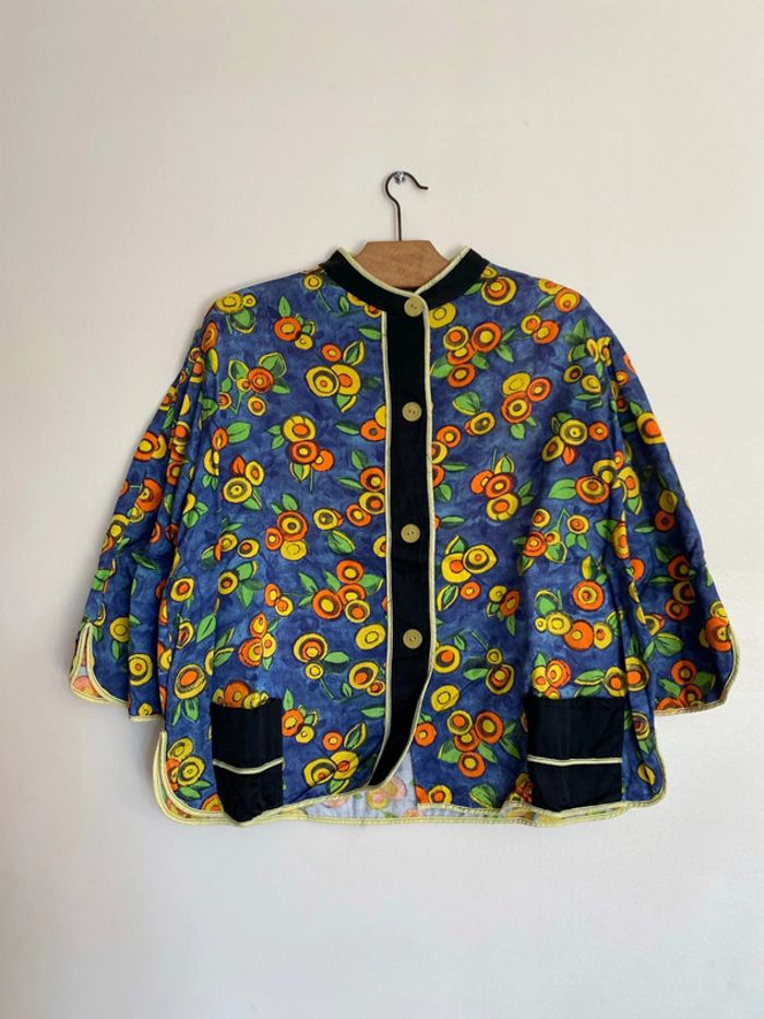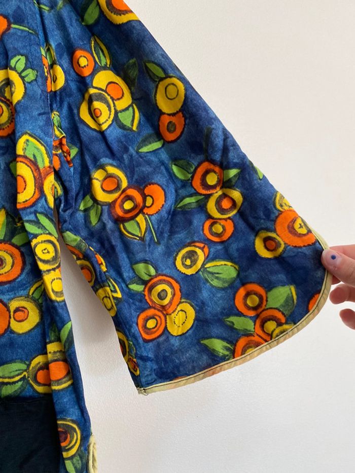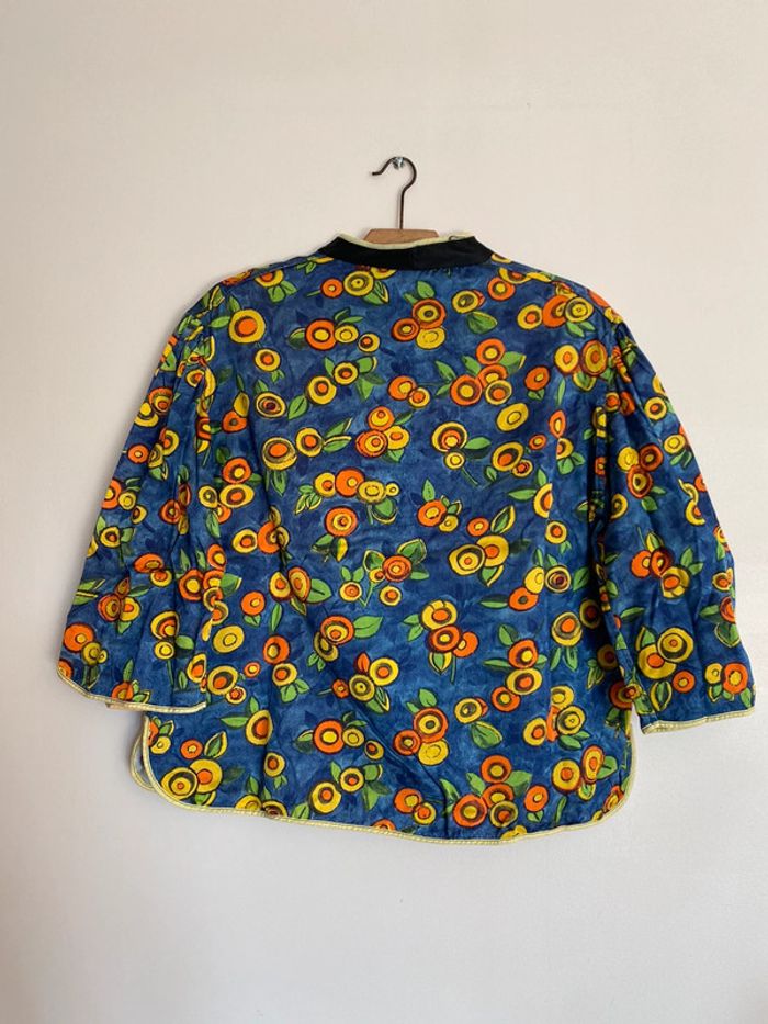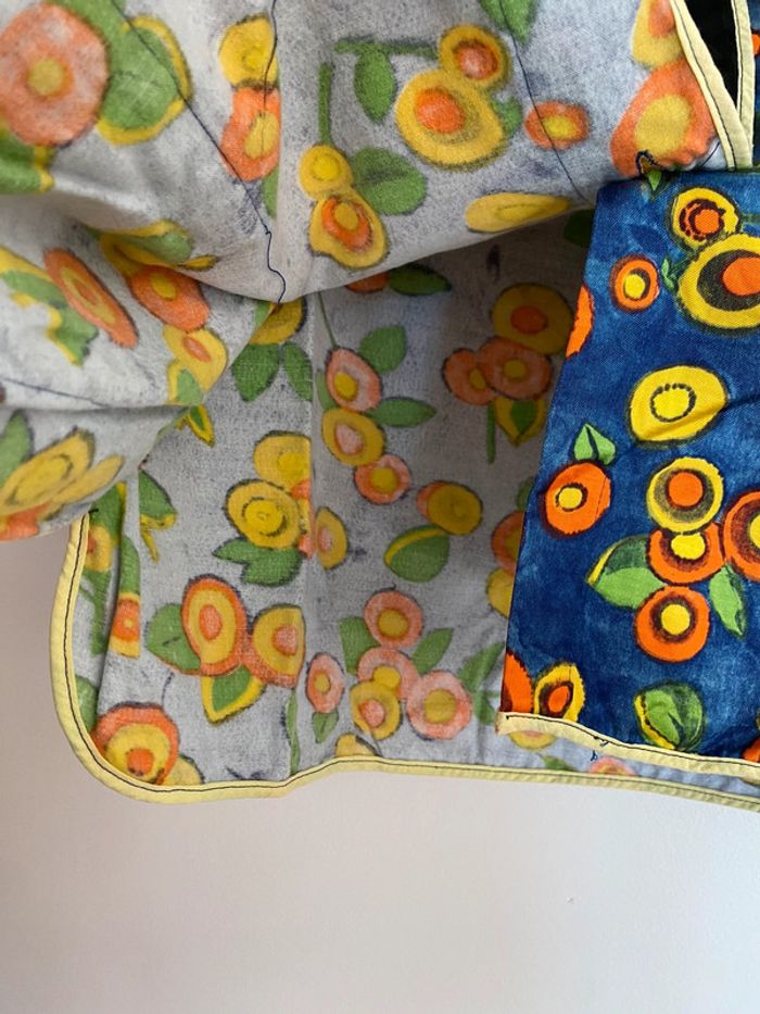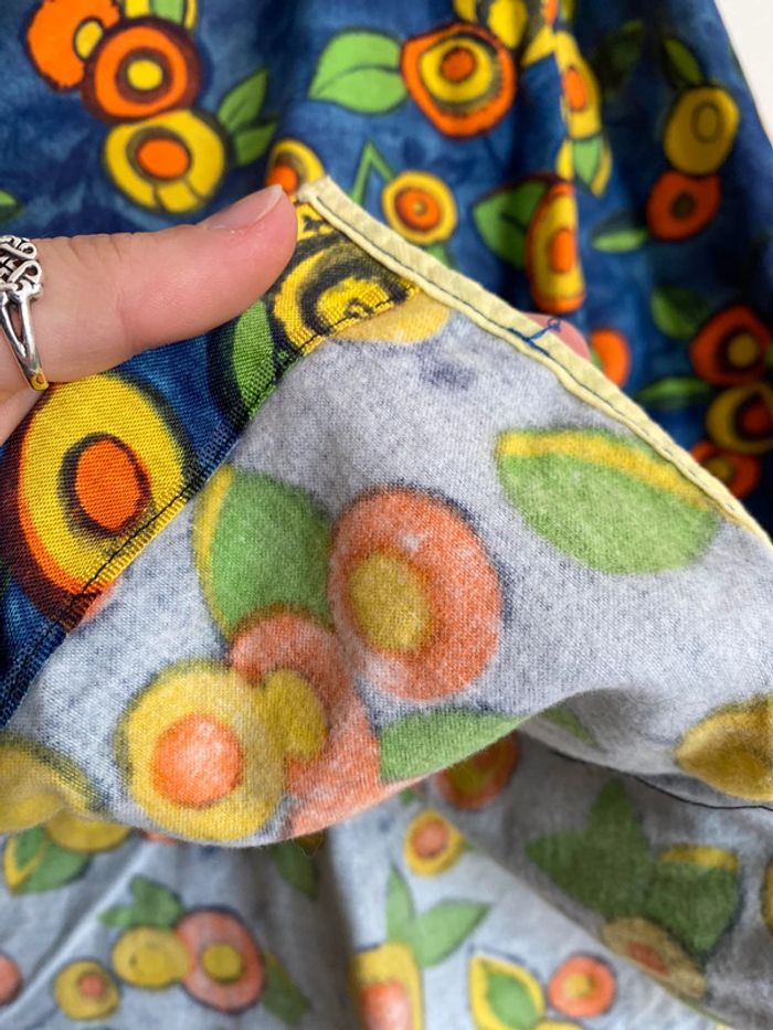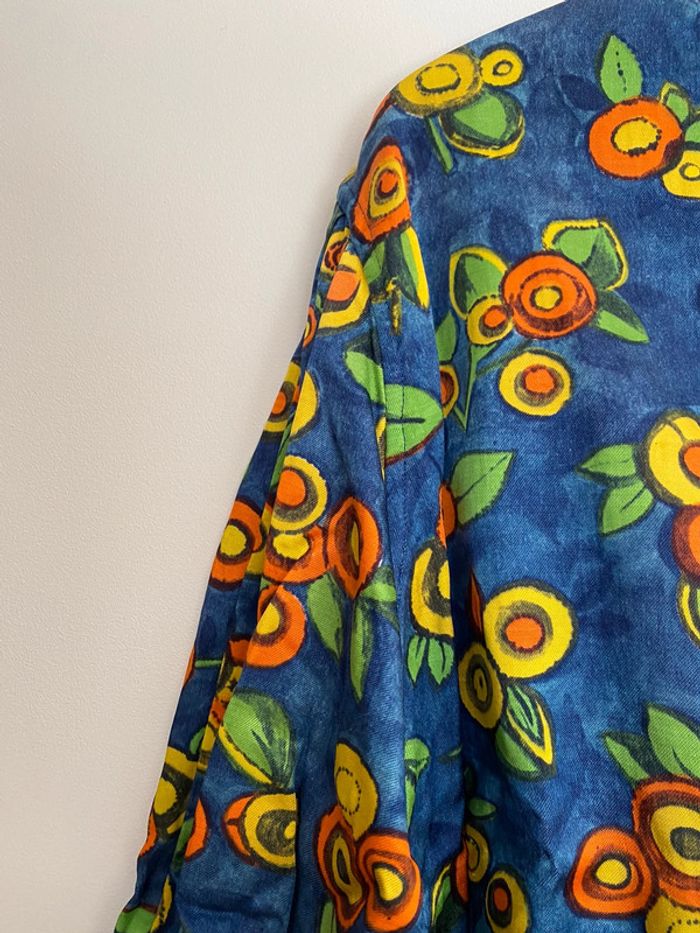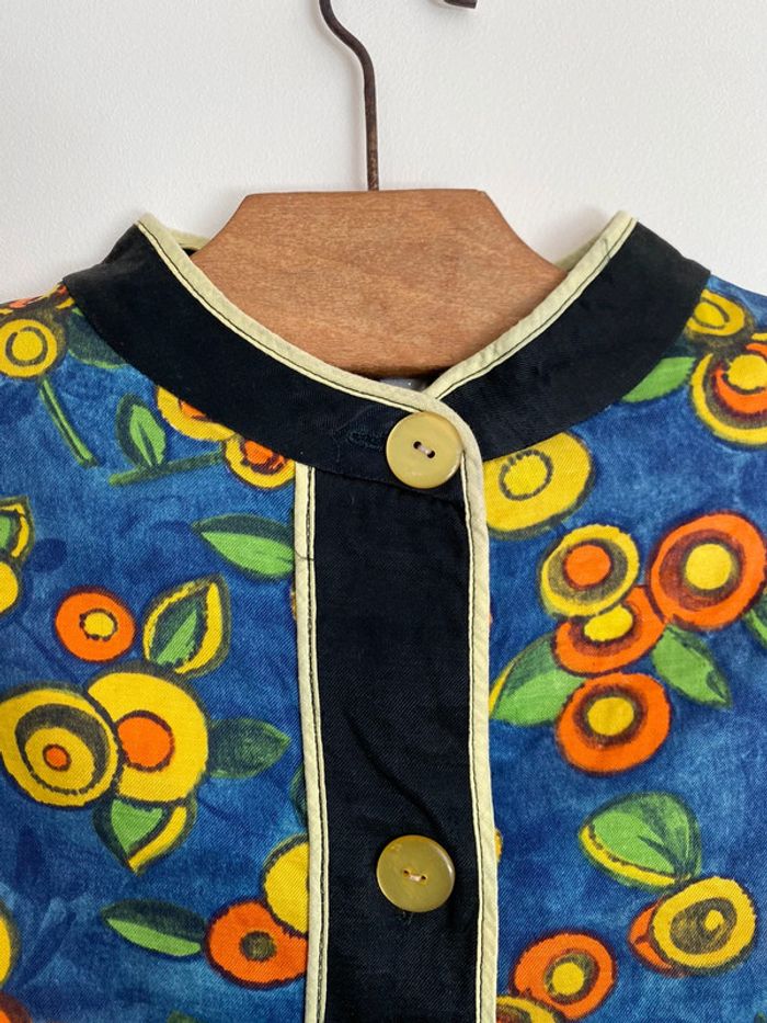 Haut vintage multicolore, taille S/M Haut de travail années 70 70s 70’s seventies work workwear coloré colorful blouse chemise lay-on later boutons buttons up col haut maho rond round shape neck manches mi longues 3/4 trois quarts three quarters sleeves poches pockets 44cm aisselles 56cm haut en bas Bleu orange vert jaune marine green blue yellow fruit mandarine clémentine abricot apricot melon citron citrus lemon feuille leaf leaves feuillage sud Provence wip coupe droite matière coton épais qui se tient bien, doux à l’intérieur étiquette Qualité production d’excellent usage quality use old school fashion mom mommy mother maman mère donna mamma nona grandma granma granny grand mère vieille France foyer maison home rideau curtains marge Simpson camargue summer été fall automn 80 80s 80’s eighties nineties y2k trend tailleur ensemble haut top shirt prairie prairial core cottage money village school italy italie champêtre champs fields film movie fever dream whimsical nostalgie nostalgia statement piece unique époque archive histoire history historical Wapikii
