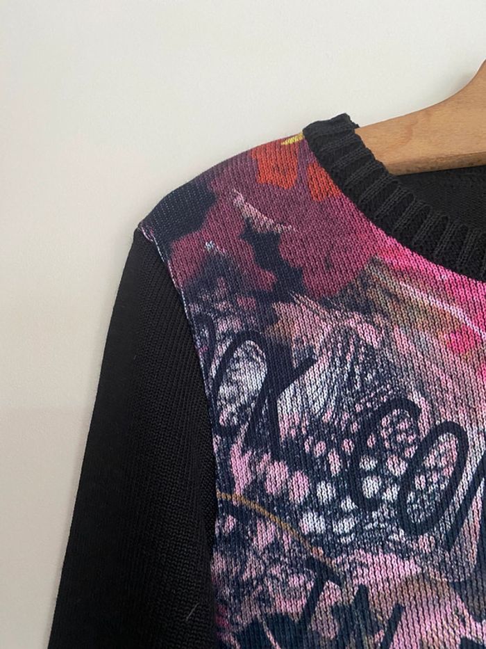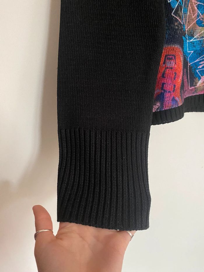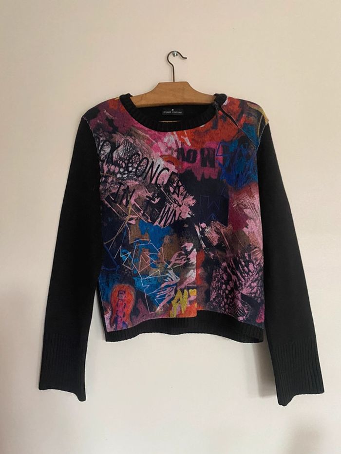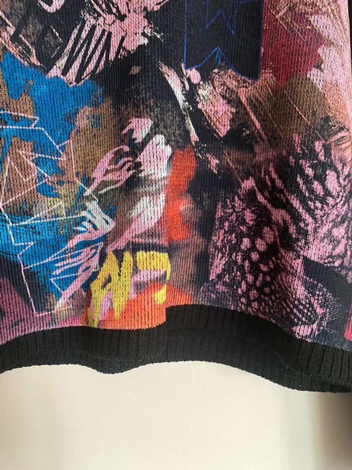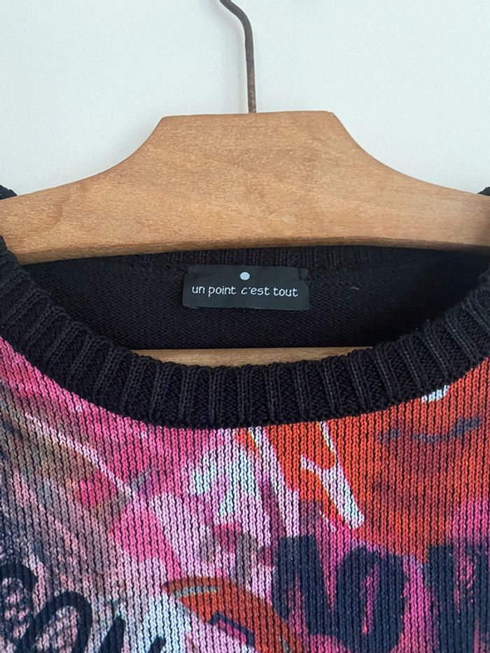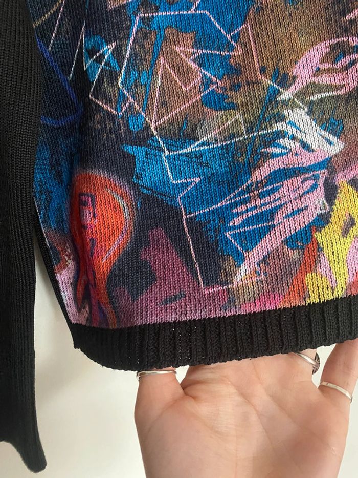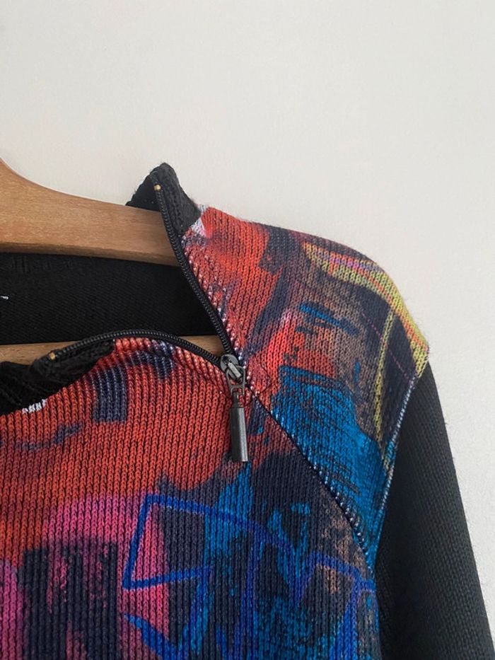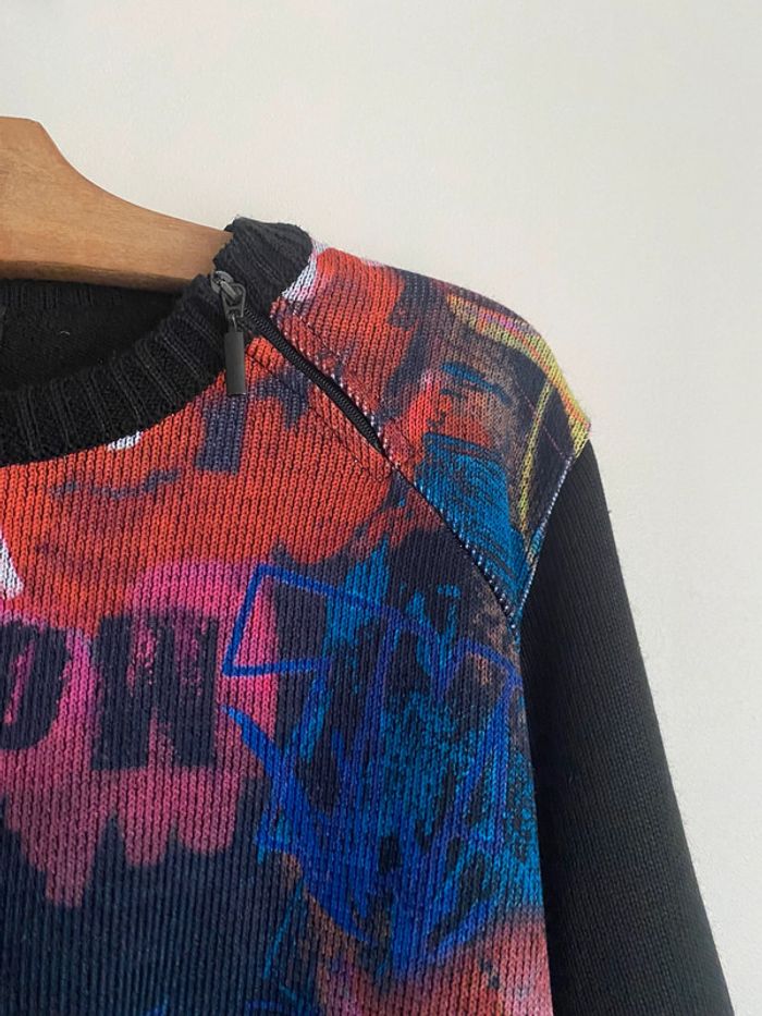 Pull Un point c’est tout, taille M Pull bariolé col rond motif fermeture zip zipper asymétrique asymetrical adaptable effet flou fleurs flowers fleuri floral bouquet ombragé pixel point dot carreaux carré quadrillage square empreinte grille grillage tapisserie fashion mode model rayé rayures stripes street streetwear drawing draw dessin artwear art manches longues long sleeves imprimé y2k 00s 90s 2000 1990 nineties top haut lignes lines surpiqûre surpiqué ref tiret trait destroy dégradé camaïeu rose feuilles feuillage bourgeon tige pétales petal modèle Ombre en coton imprimé écriture phrase prénoms col rond plongeant asymétrique original 3/4 mi-long empiècement surpiqué surpiqûres texte réversible peut se porter des deux côtés mots fleur coeur multicolore unique studio ajouts craft études personnage silhouette espagnol anglais jersey élastique élasthanne pièce forte charme caractère marquant maîtresse outstand outstanding strong embroidered broderie brodé patch patchwork bi matière artwear art Custo Barcelona Gaultier layer Playboy Miss Sixty Miss Side Car Save the Queen Xanaka Portugal Britto vibe core aesthetic layering Wapikii