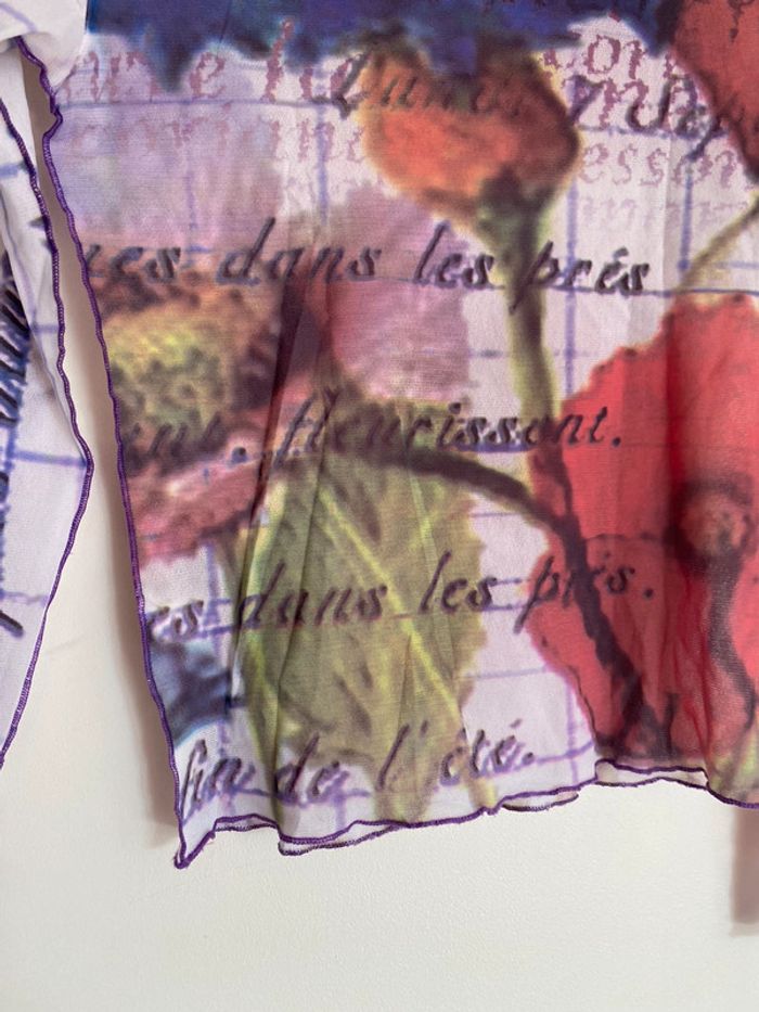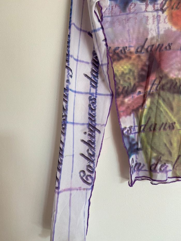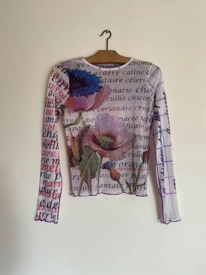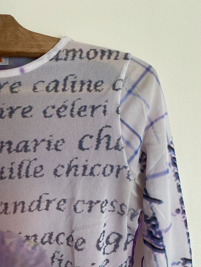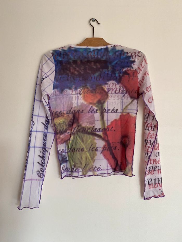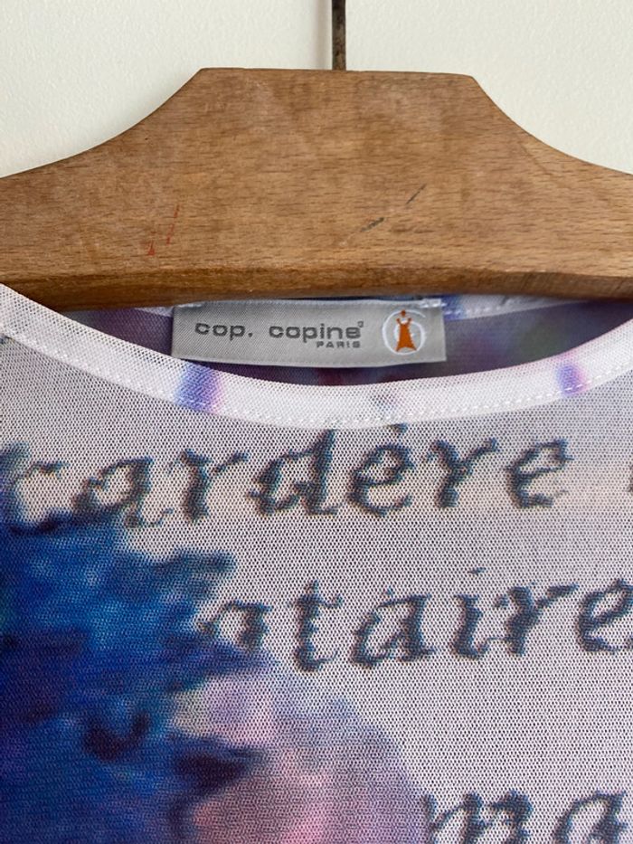 Haut Cop Copine, taille S Made in France Paris bariolé en mesh elasthanne transparent fluide col rond motif phrase mots lettre texte femme woman coquelicots fleurs flowers floral fleuri colchiques dans les prés fleurissent c’est la fin de l’été céleri marie feuille chicorée coriandre plantes herbes médecine printemps spring prairie cottage poème poésie poetry french français libre book pavot plantain botanique botaniste botanic botanist bio biologie nature imprimé vintage top pastel ligne quadrillage carreaux cahier école écriture enfant draw drawing dessin artwear 3/4 manches imprimé y2k 00s 90s 2000 1990 nineties modèle ombre en coton Motif imprimé écriture col rond plongeant asymétrique asymetrical original empiècement surpiqué surpiqûres texte réversible mots fleur multicolore unique studio ajouts craft études personnage silhouette espagnol anglais jersey élastique élasthanne pièce forte charme caractère marquant strong maîtresse outstand outstanding embroidered broderie brodé patch patchwork bi matière artwear art best Custo Barcelona Cop Gaultier Playboy Miss Sixty Miss Side Car Save the Queen Xanaka Portugal Britto vibe core esthetic copine lucky found luck find weird weirdo goofy fashion out trendy aware bratz barbie boheme archive skate skatewear skater skate wear grunge rock emo punk rocker rave raver indie indiesleaze drain drainer draingang drain gang emo cottage core norm normal fun funny funky groove modern Wapikii