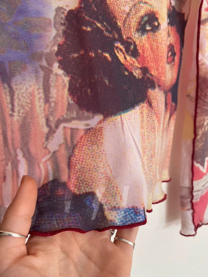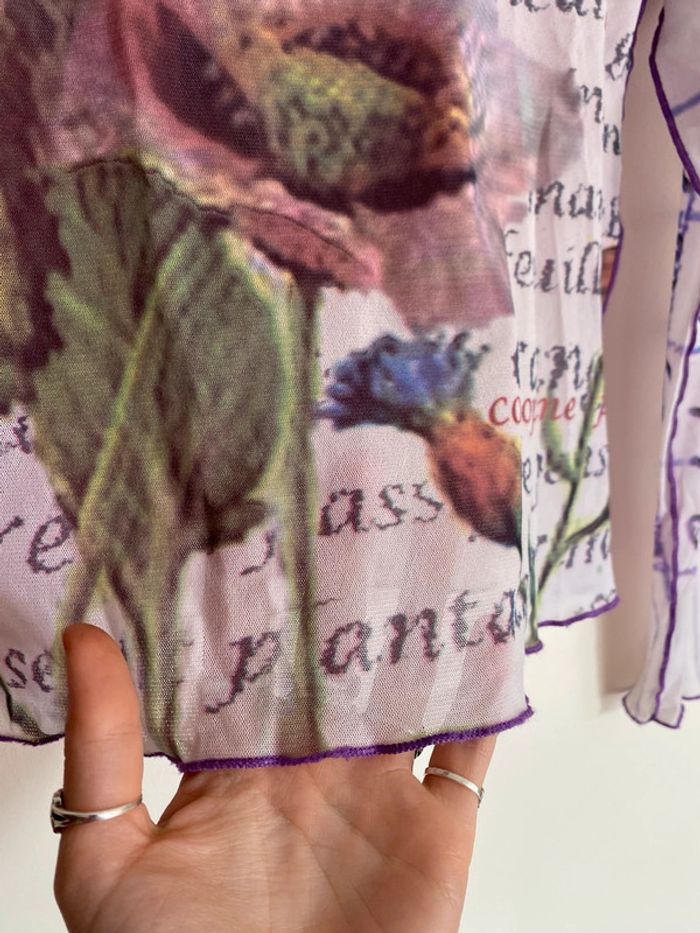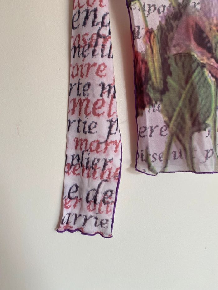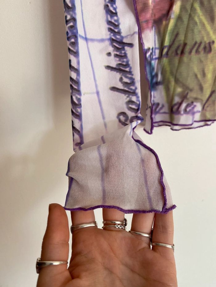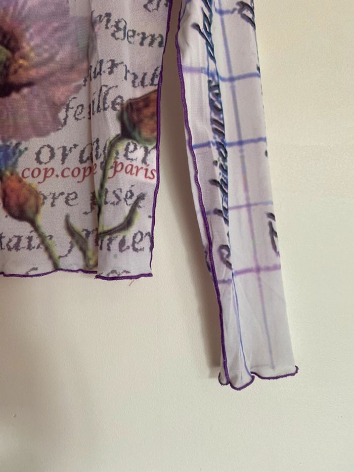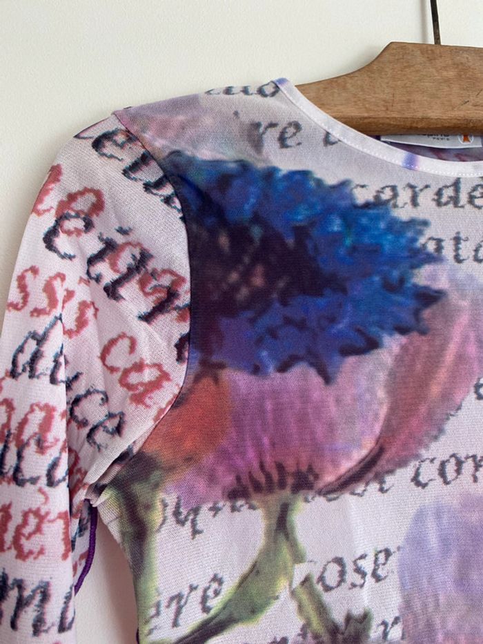 Haut Cop Copine, taille S Made in France Paris bariolé en mesh elasthanne transparent fluide col rond motif phrase mots lettre texte femme woman coquelicots fleurs flowers floral fleuri colchiques dans les prés fleurissent c’est la fin de l’été céleri marie feuille chicorée coriandre plantes herbes médecine printemps spring prairie cottage poème poésie poetry french français libre book pavot plantain botanique botaniste botanic botanist bio biologie nature imprimé vintage top pastel ligne quadrillage carreaux cahier école écriture enfant draw drawing dessin artwear 3/4 manches imprimé y2k 00s 90s 2000 1990 nineties modèle ombre en coton Motif imprimé écriture col rond plongeant asymétrique asymetrical original empiècement surpiqué surpiqûres texte réversible mots fleur multicolore unique studio ajouts craft études personnage silhouette espagnol anglais jersey élastique élasthanne pièce forte charme caractère marquant strong maîtresse outstand outstanding embroidered broderie brodé patch patchwork bi matière artwear art best Custo Barcelona Cop Gaultier Playboy Miss Sixty Miss Side Car Save the Queen Xanaka Portugal Britto vibe core esthetic copine lucky found luck find weird weirdo goofy fashion out trendy aware bratz barbie boheme archive skate skatewear skater skate wear grunge rock emo punk rocker rave raver indie indiesleaze drain drainer draingang drain gang emo cottage core norm normal fun funny funky groove modern Wapikii