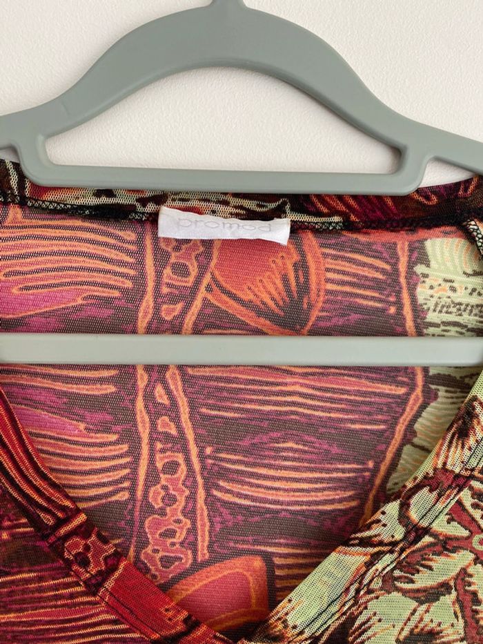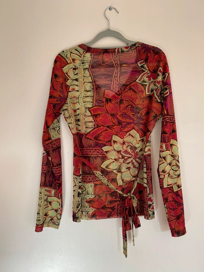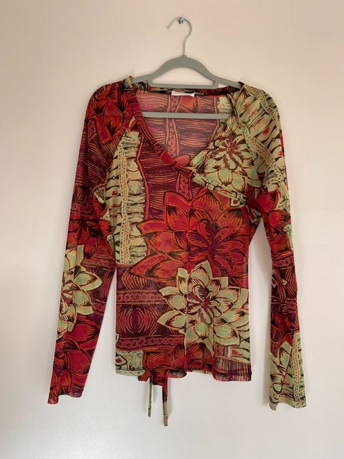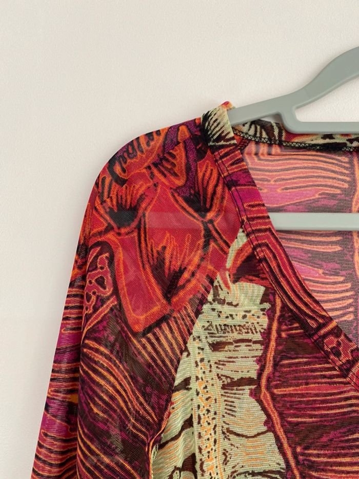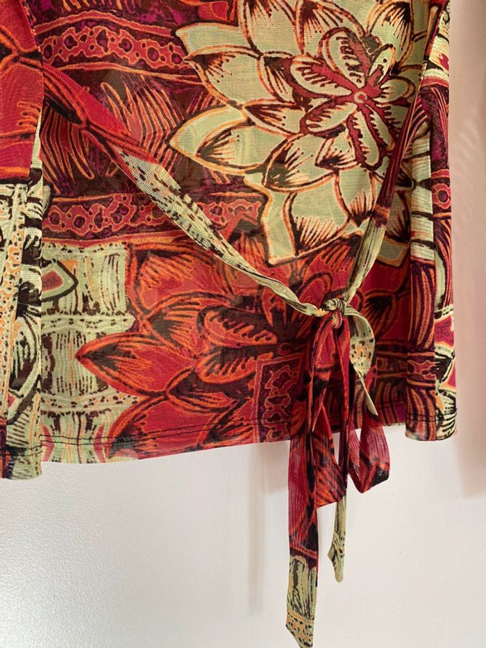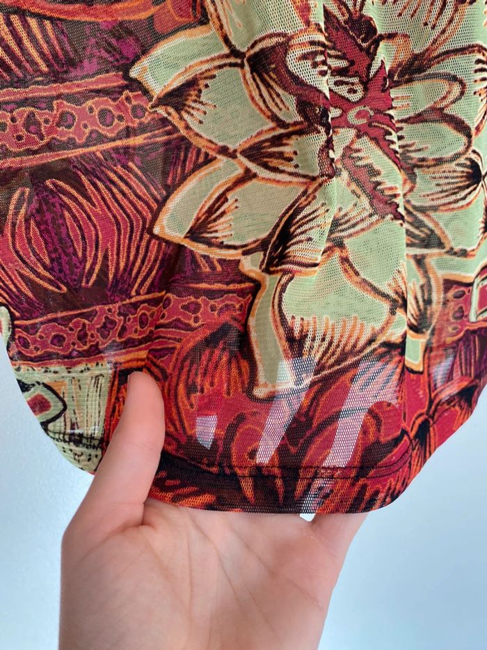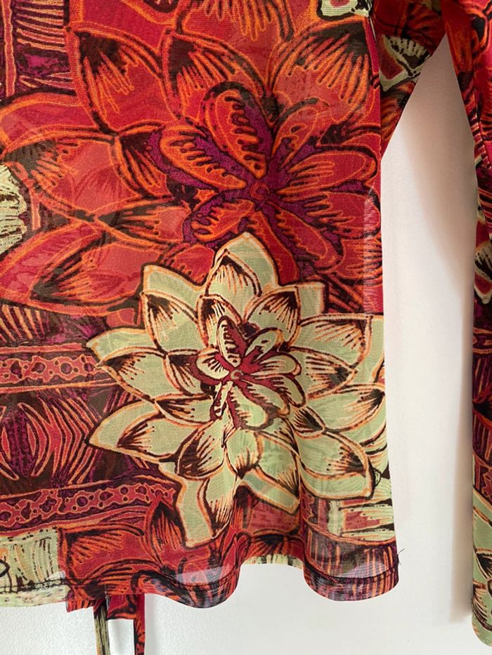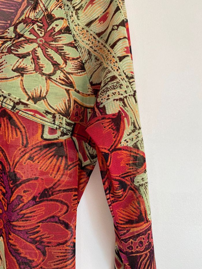 bariolé en mesh elasthanne transparent fluide col en V motif fleuri fleurs floral flowers tribal cache coeur noeud manches longues ruban rouge vert multicolore green red ombre rayé rayures serré cintré taille décolleté évasé moulant