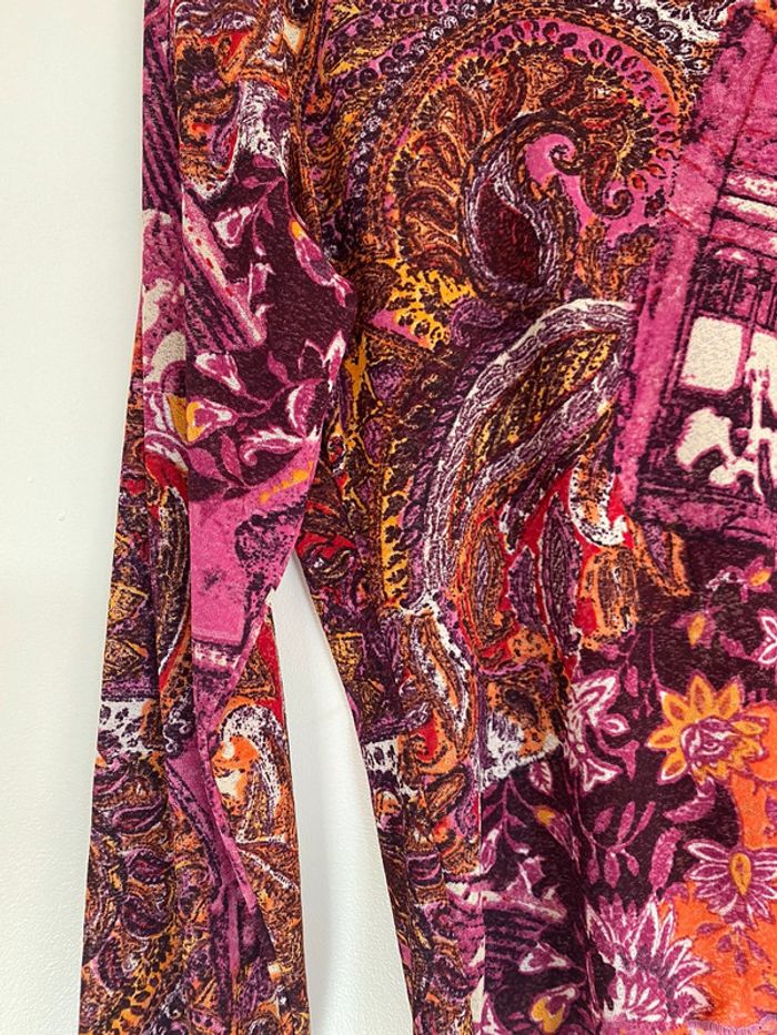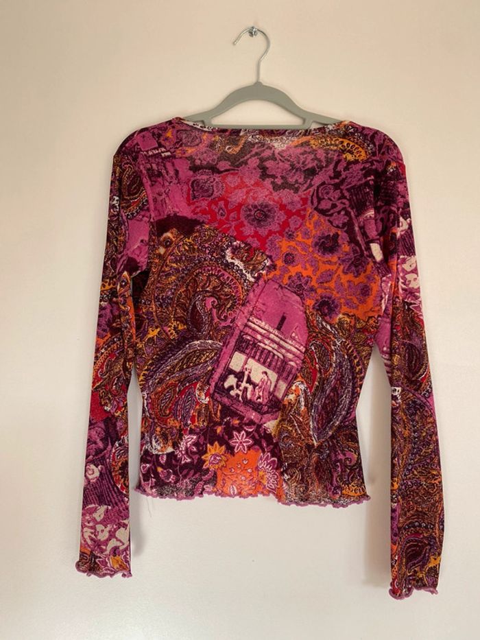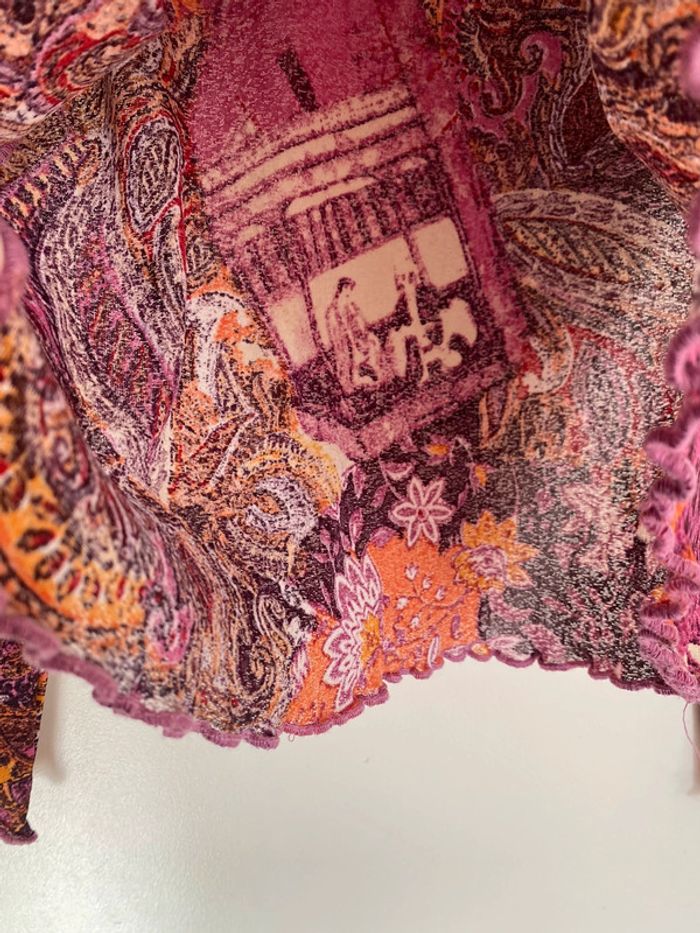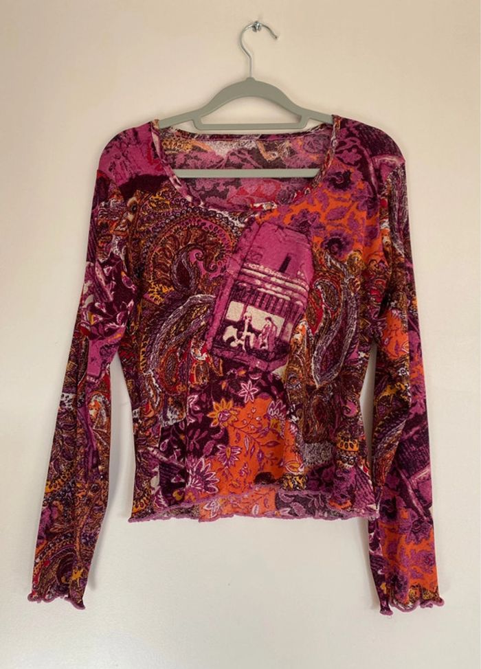 Haut rose violet orange, taille S bariolé mesh transparent fluide col rond décolleté motif patch patchwork collage empiècement surpiqûres cachemire fleurs fleuri floral flowers feuille feuillage tableau edward hopper café coffee nighthawks pink purple dorure entrelaces ramage draw drawing dessin artwear manche imprimé y2k 00s 90s 2000 1990 nineties game Made in France Paris modèle Ombre en coton écriture plongeant asymétrique original 3/4 mi-long Nadia Stéphanie Sophie Johanna patry Paloma Ben orange empiècement surpiqué surpiqûres texte réversible peut se porter des deux côtés mots fleur multicolore unique studio ajouts craft études personnage silhouette espagnol anglais jersey élastique élasthanne pièce forte charme caractère marquant maîtresse outstand outstanding strong embroidered broderie brodé patch patchwork bi matière artwear art Custo Barcelona Cop Gaultier Playboy Miss Sixty Miss Side Car Save the Queen Xanaka Portugal Britto vibe core esthetic copine Wapikii