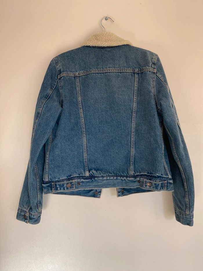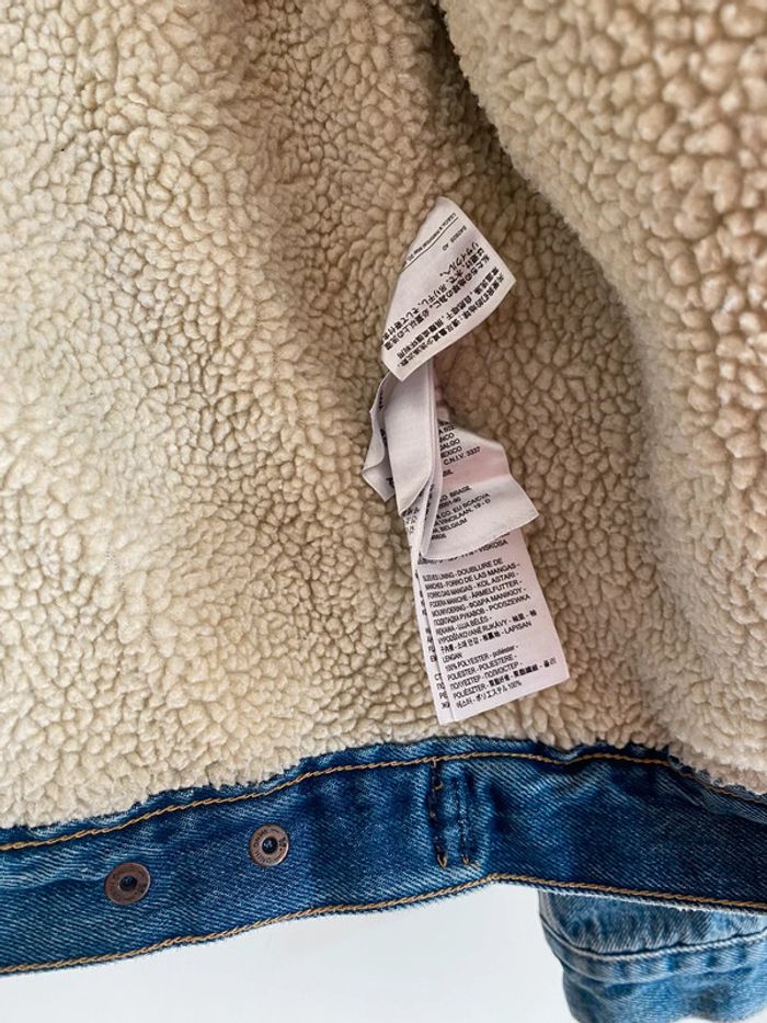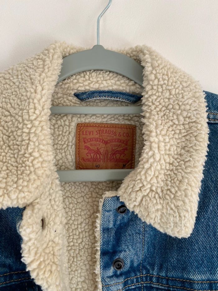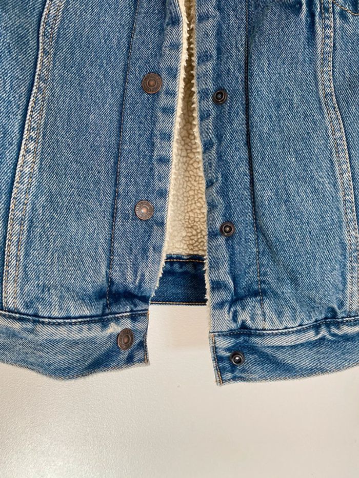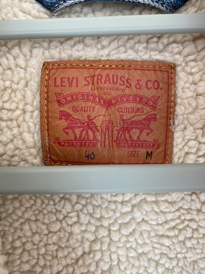 Veste en jeans Levi’s Strauss molletonnée, taille M mais convient plutôt à un S/M Mouton chaud épais doublé fourrure moumoute col poches coupe droite manches longues intemporel mixte original bleu blue blanc beige crème boutons denim Portée 2 fois Wapikii