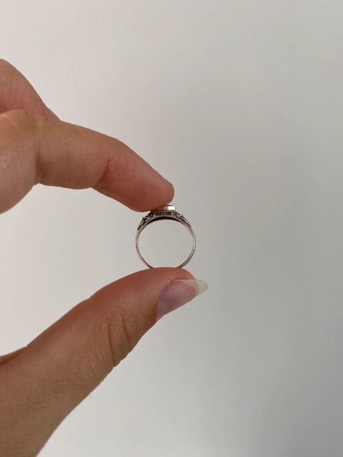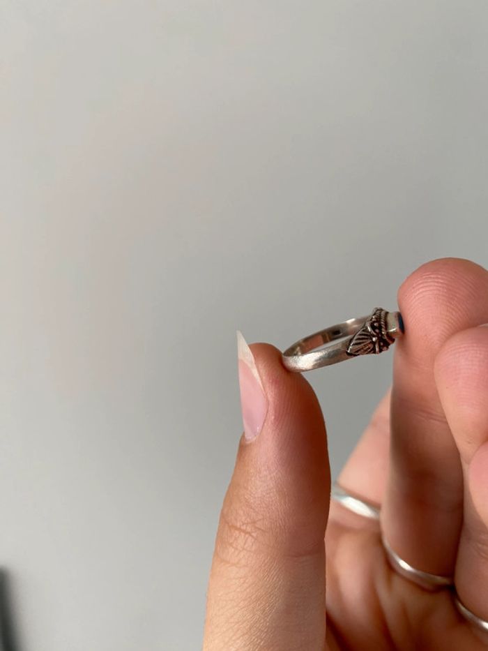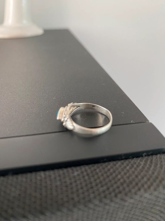 Bague en argent avec pierre semi précieuse turquoise Taille 14,5mm 14.5 mm Détails poinçon ornement boule tresse liseré forme ovale oeil de chat amande almond cat’s eye royal royauté spirale cercle laurier feuille fleur floral fleuri couronne flower