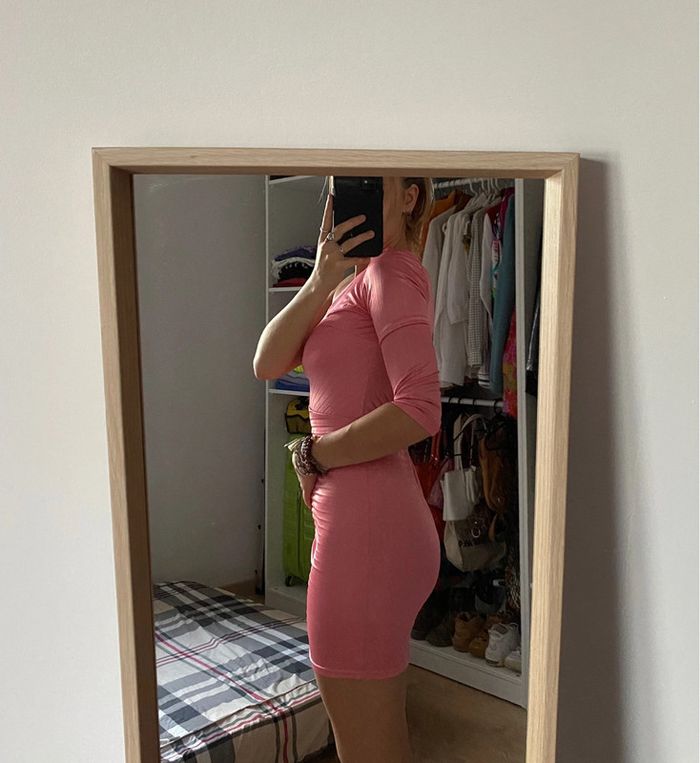 Robe rose Manoukian Moulante asymétrique, 1 seule manche, rayée côtelée, fermeture, très qualitative Avec étiquette, 99€ Barbie slay aesthetic vibe cosplay design modern asymetrical alternative colorful art unique original