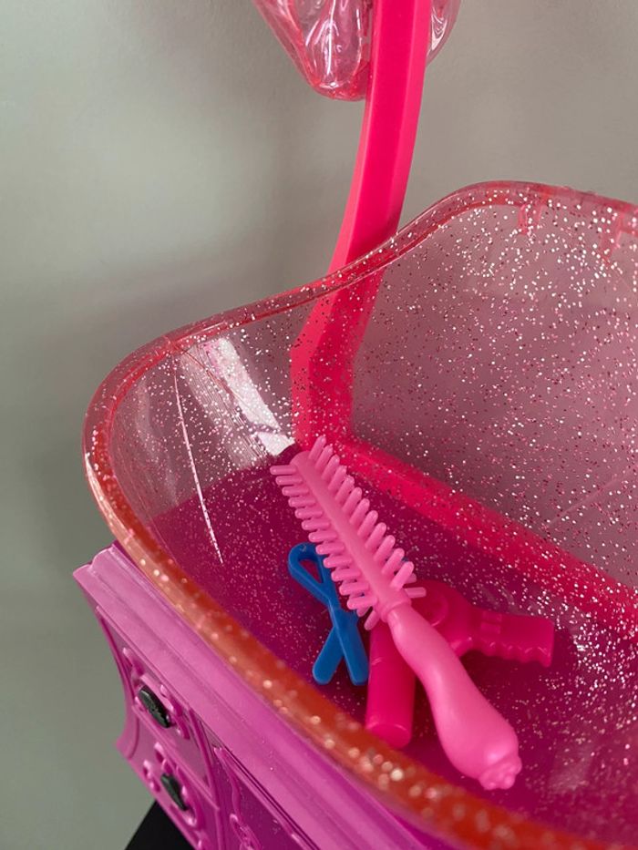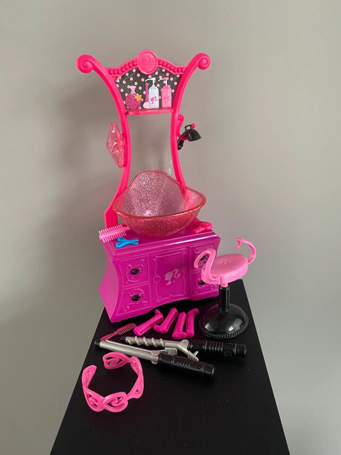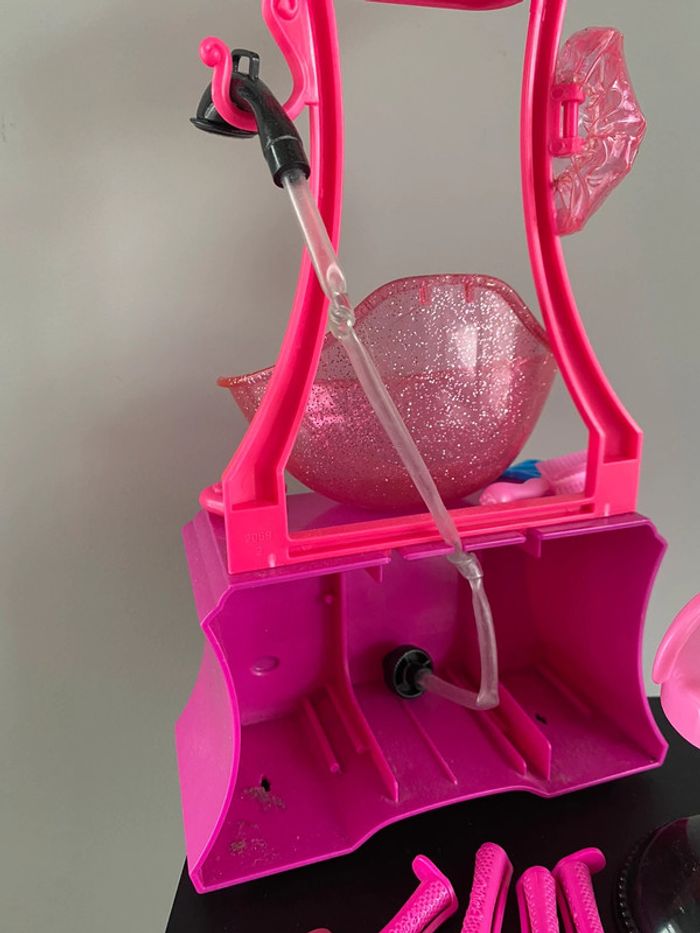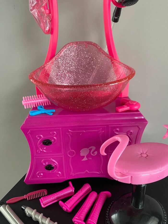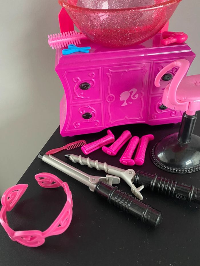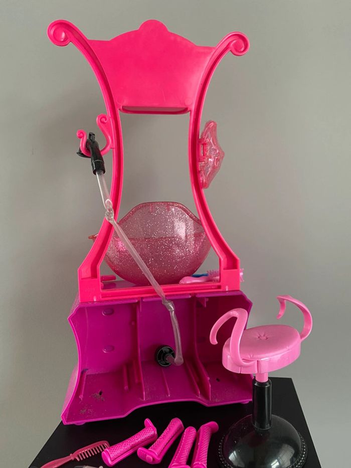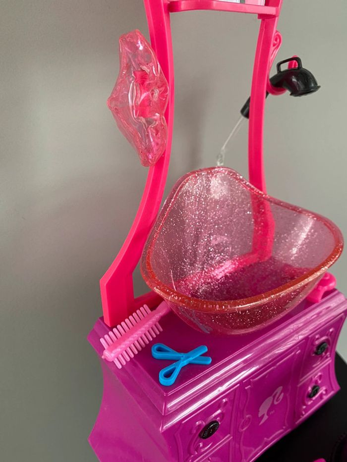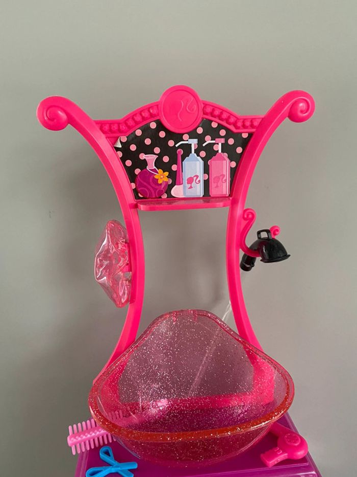 Barbie Style Salon N6889 Mattel Salon de coiffure beauty bonnet de douche bain eau qui coule vraiment du tuyau robinet coiffeur coiffeuse beauté produits shampoing gel douche tabouret meuble bigoudis lisseur boucleur appareil bracelet ciseaux sèche cheveux peigne doll brush brosse 2010 2009 2008 color shampoo factory wash curl