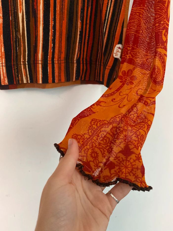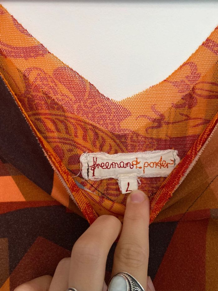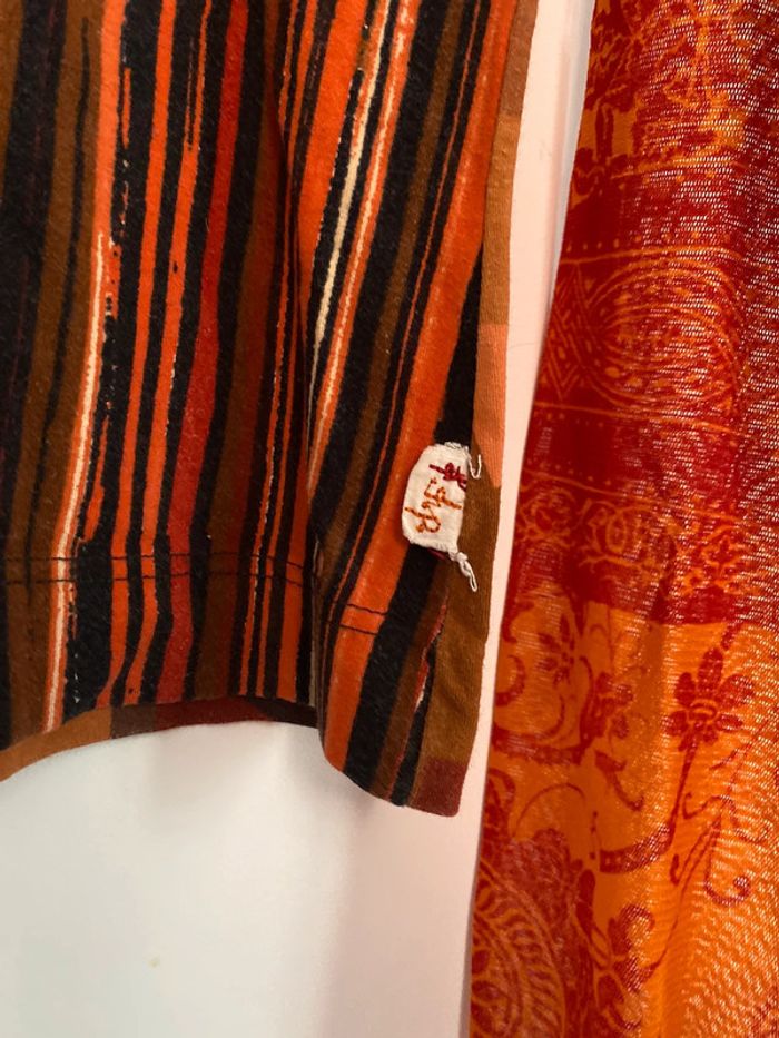 Haut Freeman T. Porter, taille S bariolé mesh transparent fluide col v décolleté motif patch patchwork collage empiècement poche à l’avant rayé rayures réversible draw drawing dessin artwear 3/4 manches imprimé y2k 00s 90s 2000 1990 nineties game Made in France Paris modèle Ombre en coton Motif imprimé écriture col rond plongeant asymétrique original 3/4 mi-long Nadia Stéphanie Sophie Johanna patry Paloma Ben orange empiècement surpiqué surpiqûres texte réversible peut se porter des deux côtés mots fleur multicolore unique studio ajouts craft études personnage silhouette espagnol anglais jersey élastique élasthanne pièce forte charme caractère marquant maîtresse outstand outstanding strong embroidered broderie brodé patch patchwork bi matière artwear art Custo Barcelona Cop Gaultier Playboy Miss Sixty Miss Side Car Save the Queen Xanaka Portugal Britto vibe core esthetic copine Wapikii Wapikii
