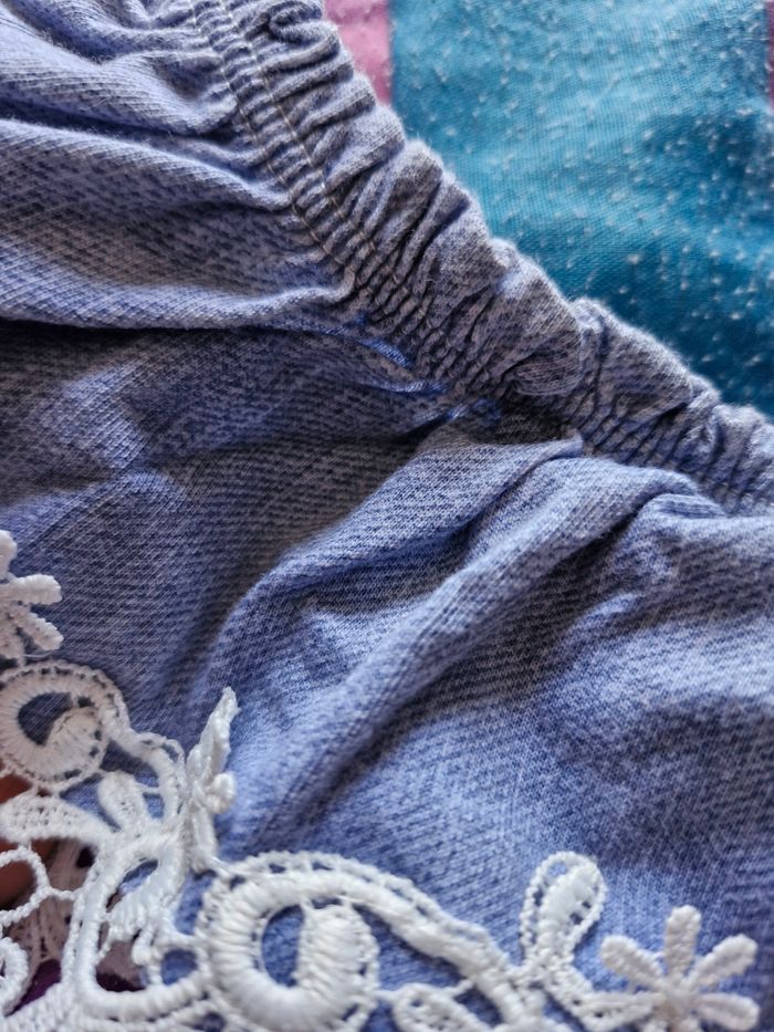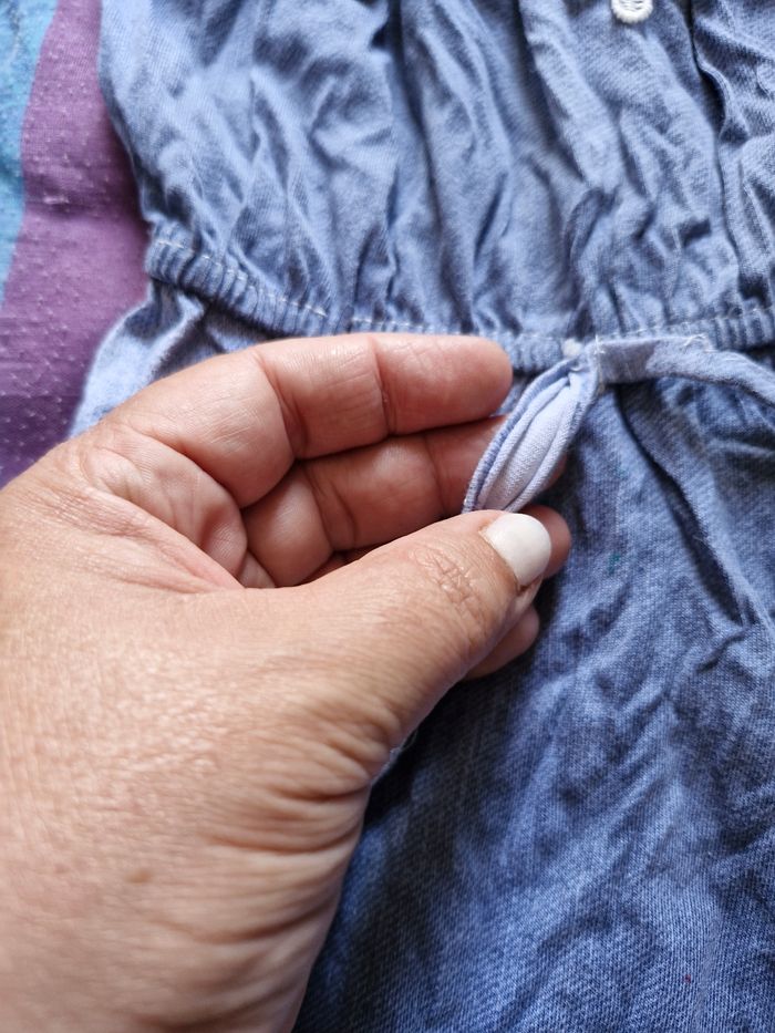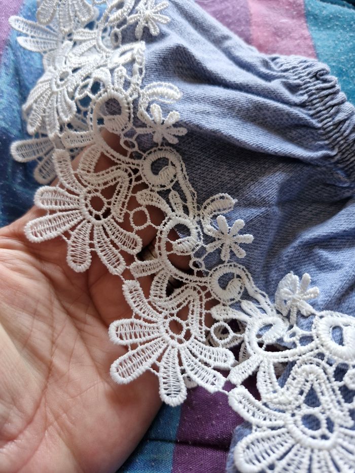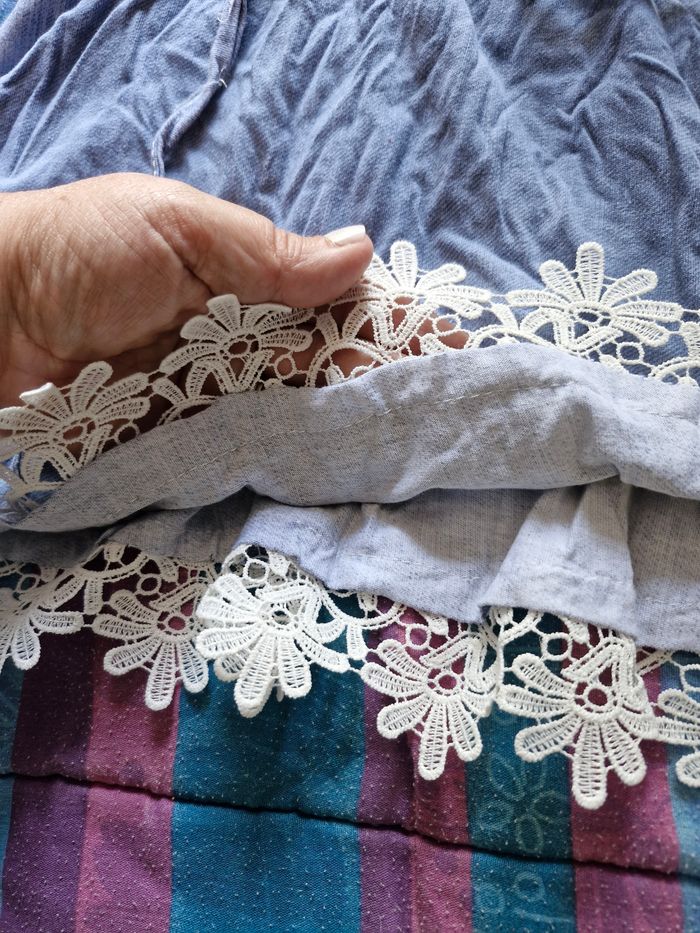 Jolie petite robe en tissu léger couleur jean clair et dentelle blanche ajoute sur le bas et le col Bardot Élastiquée au col et a la taille pour s'ajuster parfaitement a la taille de votre enfant. Pas de taille mais cela correspond a un 2/3ans (voir les mesures👇) Mesures Aisselles à plat : 30 a 35cms en tirant (tissu extensible) Taille à plat : 20 a 30cms en tirant Hauteur totale : 58cms Le petit cordon est un peu décousu (voir photo) Je n'ai pas remarqué d'autre anomalie