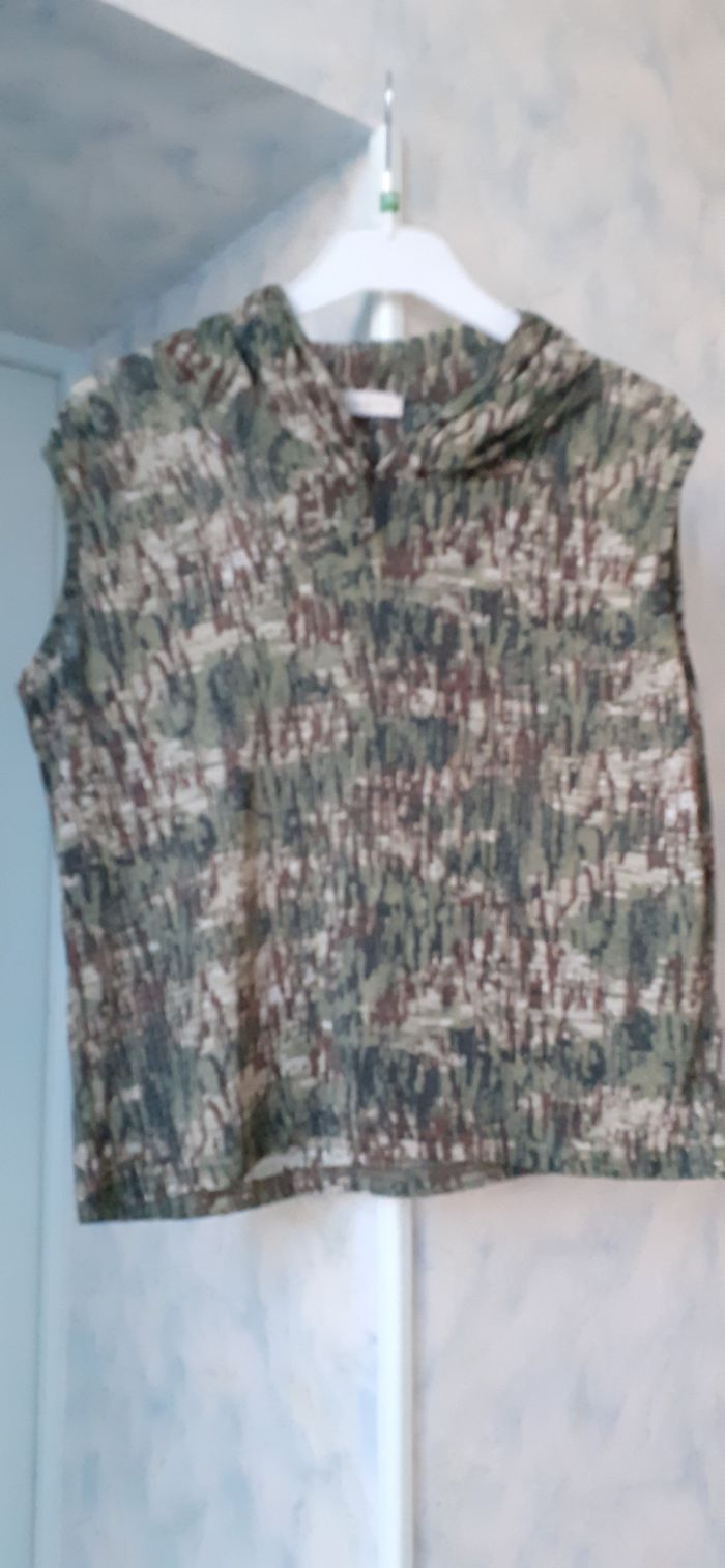 Vends un débardeur à capuche en tissu synthétique fin, transparent, couleur kaki et beige, marque Sélectif, taille 40-42. Longueur dans le dos : 48 cm Largeur aisselle à aisselle : 49 cm.