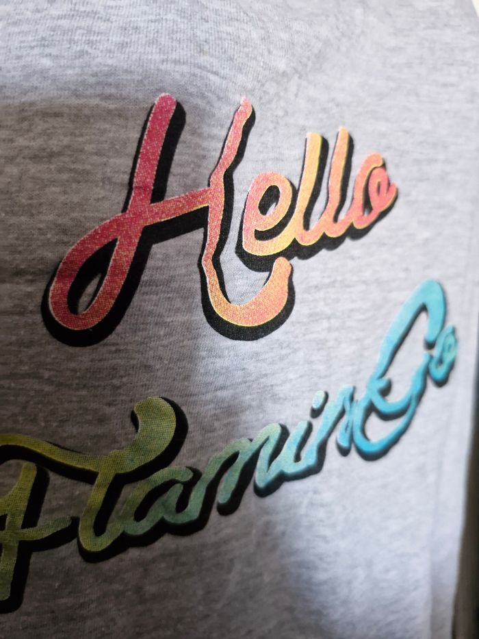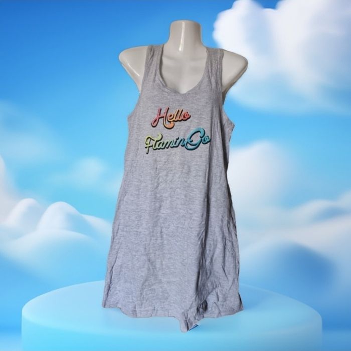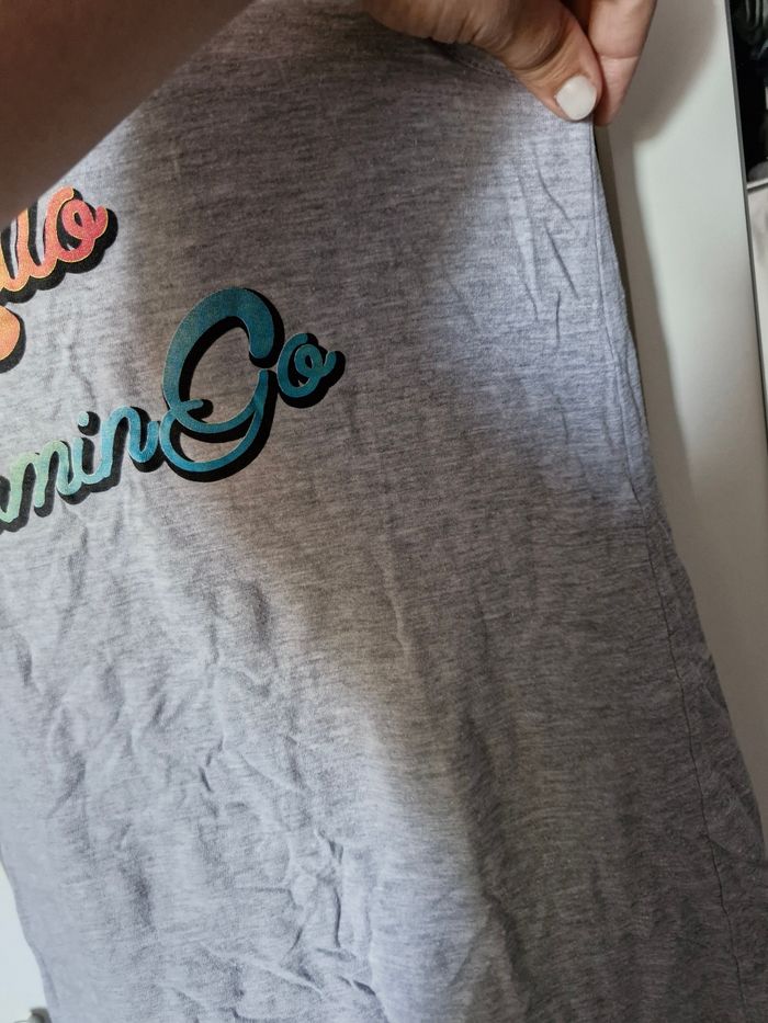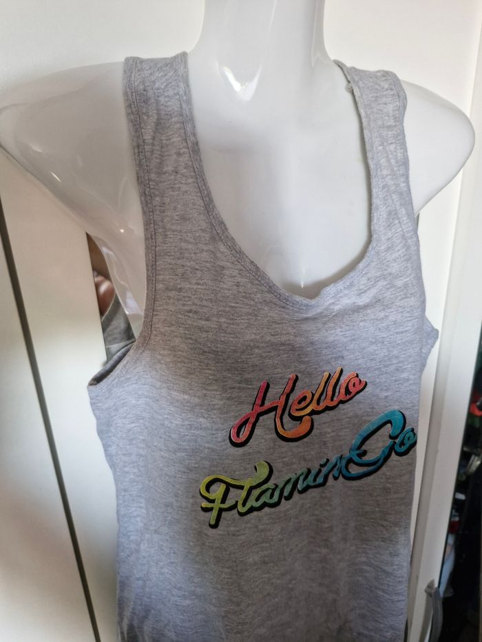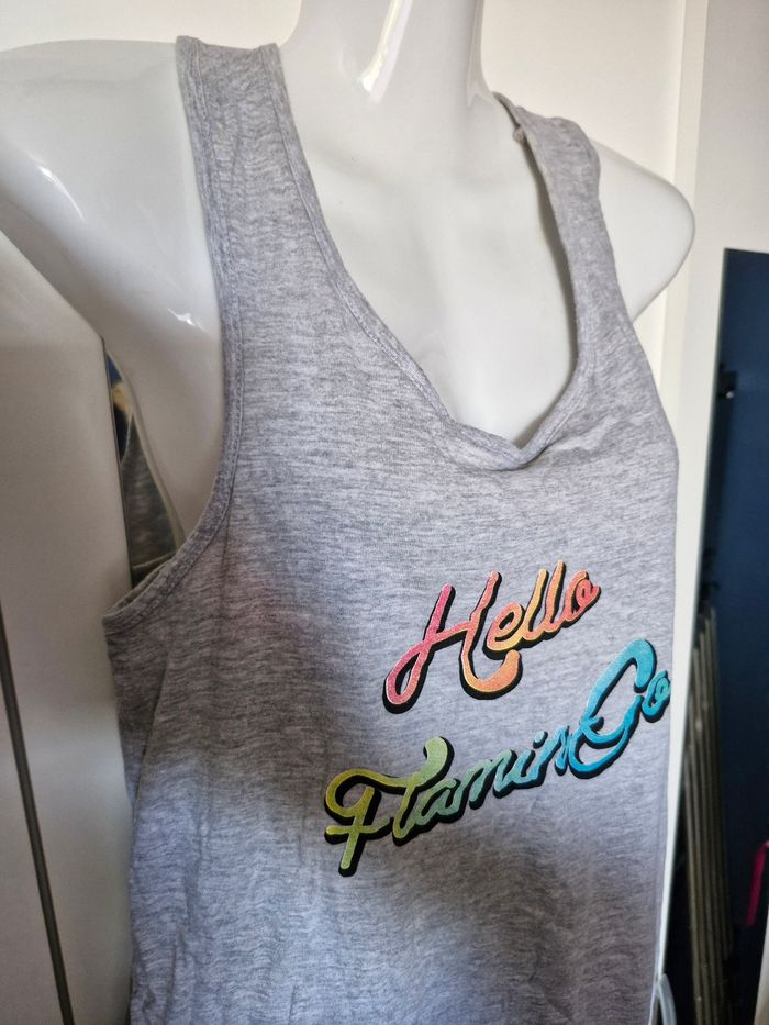 Cette jolie robe en maille t-shirt sera idéale pour être a l'aise, chez vous en mode détente, pour faire du sport (sa coupe sport le permet sans souci) mais aussi pour sortir, sa coupe évasée reste très féminine. Petite sérigraphie effet graff sur l'avant : Hello FlaminGo En dégradé de couleur Mesures : Aisselles à plat : de 39cms a plat a 47cms en tirant (tissu extensible) Hauteur : 81cms Je n'ai pas remarqué d'anomalie