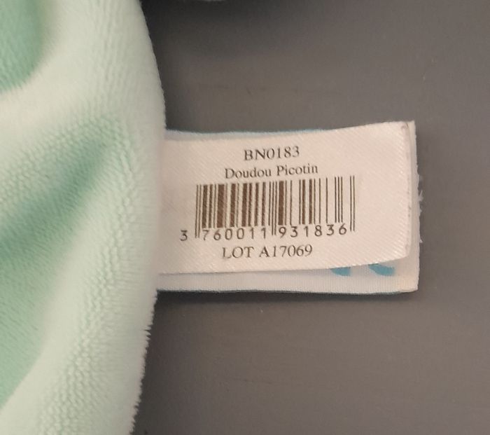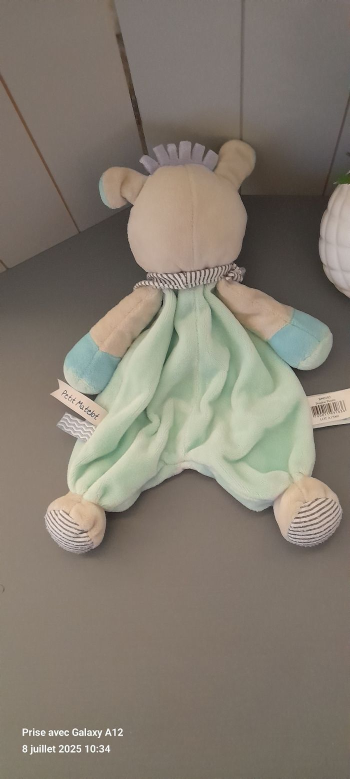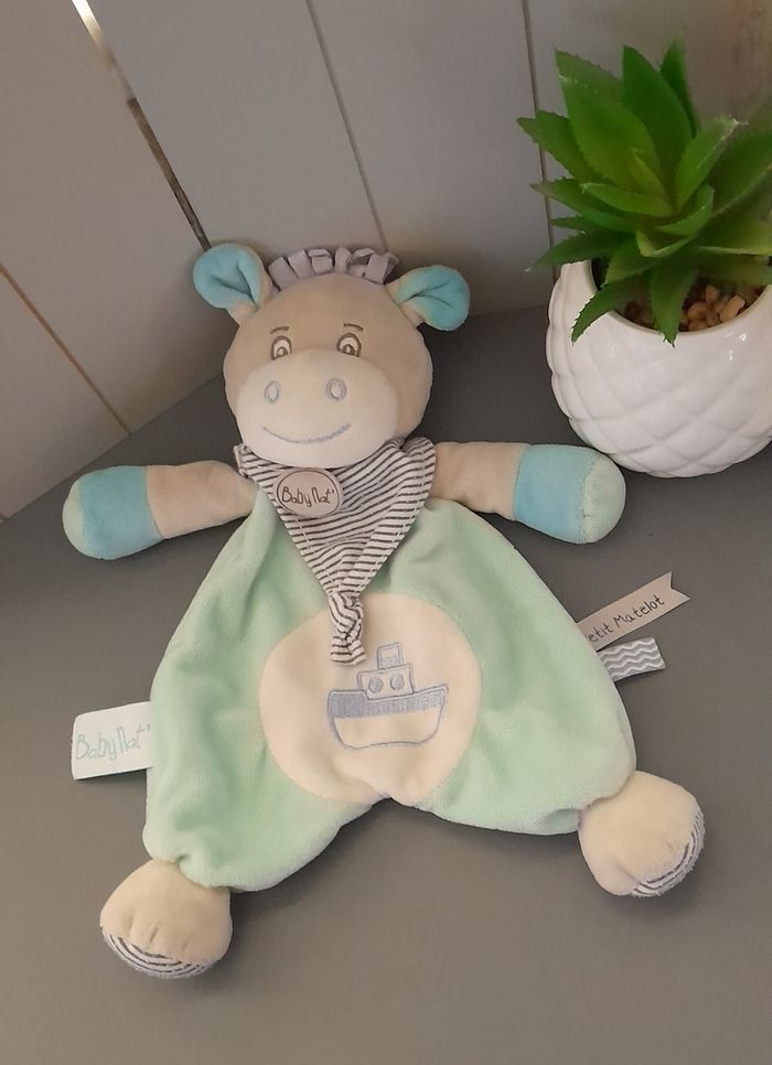 Doudou semi-plat âne Picotin petit matelot, gris blanc turquoise, petit bandana rayé, bateau brodé, réf BN0183, en velours tout doux et en parfait état Non négociable
