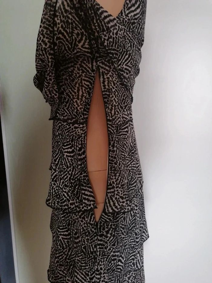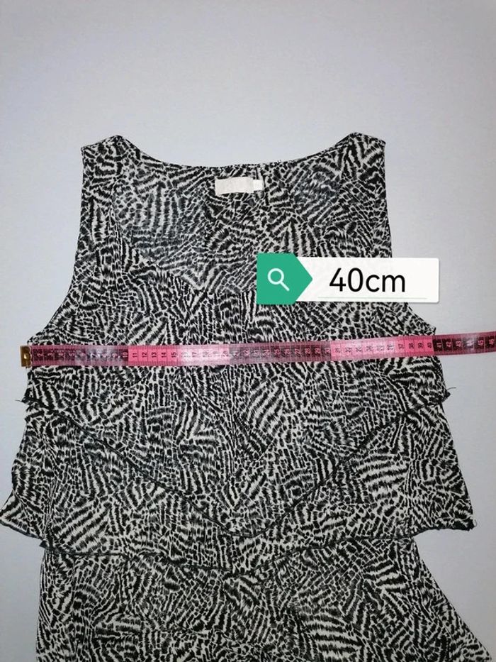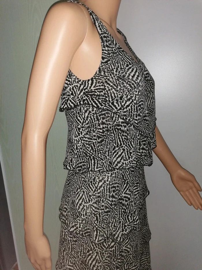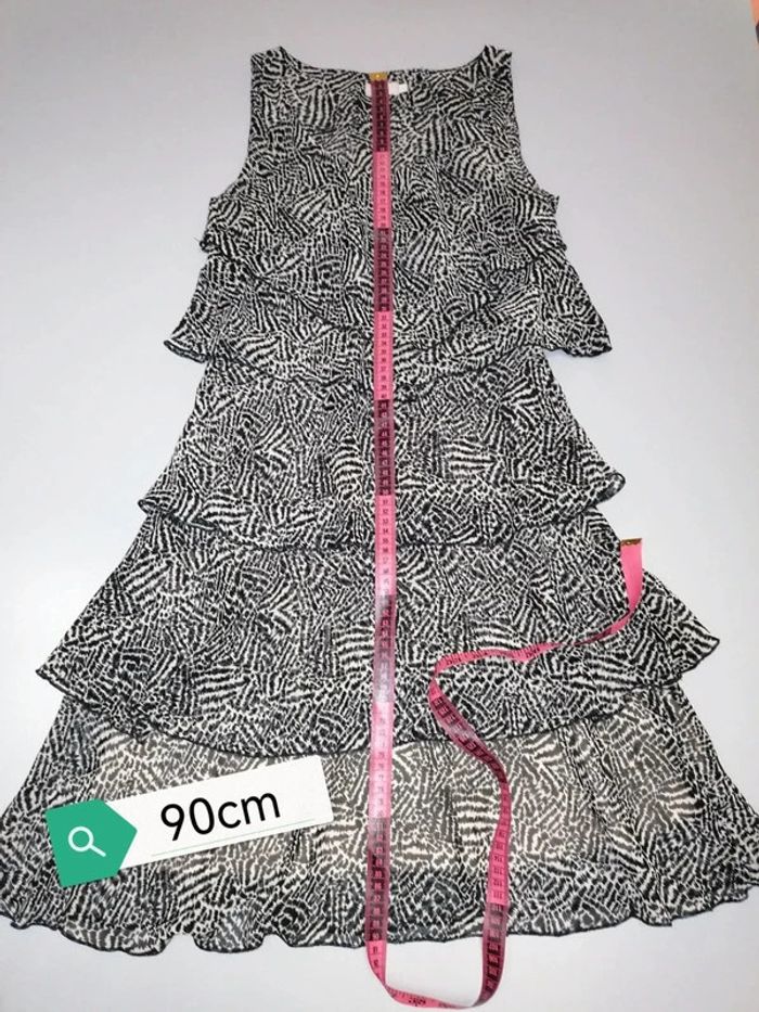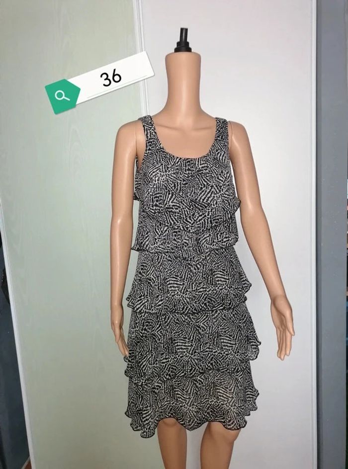 #familimimifemme36 Rarement portée, en excellent état. Une très bonne matière, entièrement doublée. Noir et écru. Elle est zippée sur un côté, non visible car il est caché par un des volants superposés. Toutes les mesures sont en photos. Toutes les catégories sont rangées par #, n'hésitez pas à jeter un œil et pourquoi pas faire un lot
