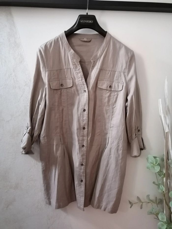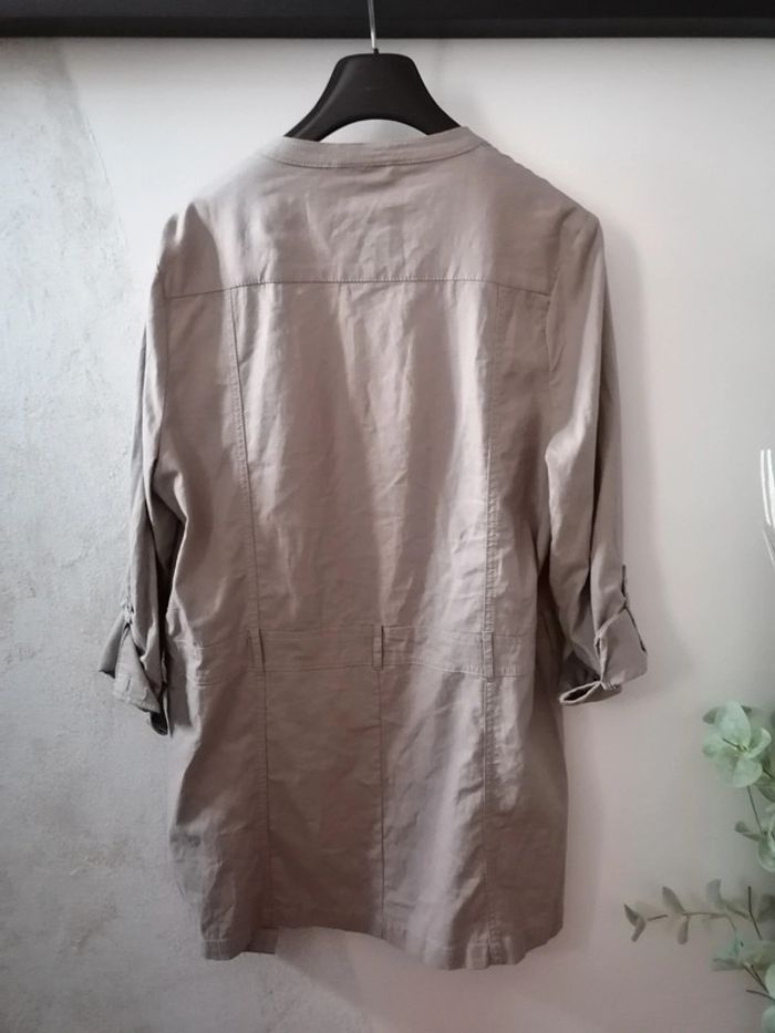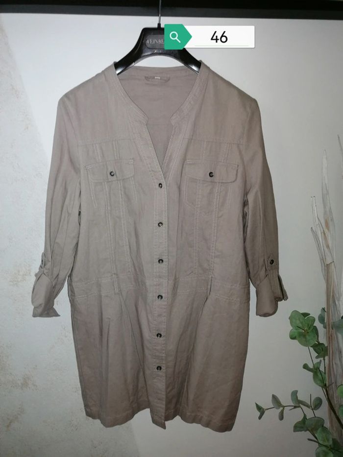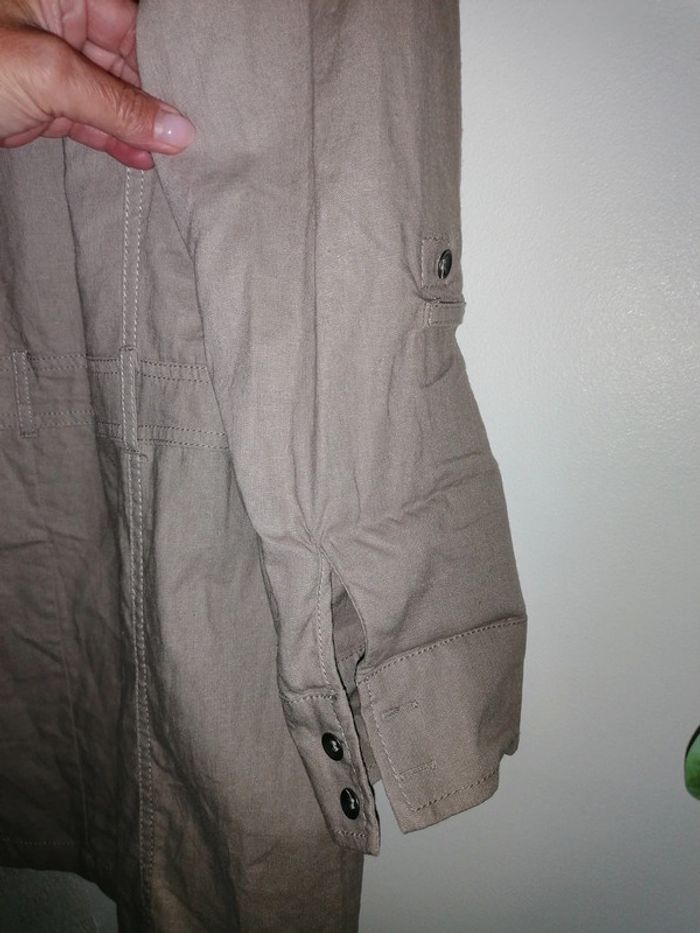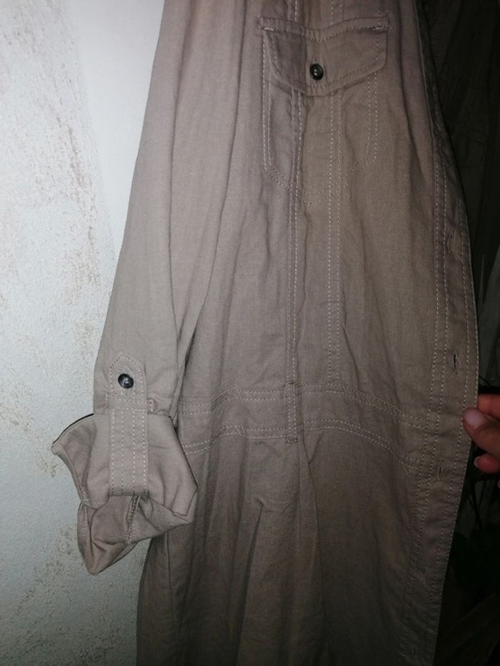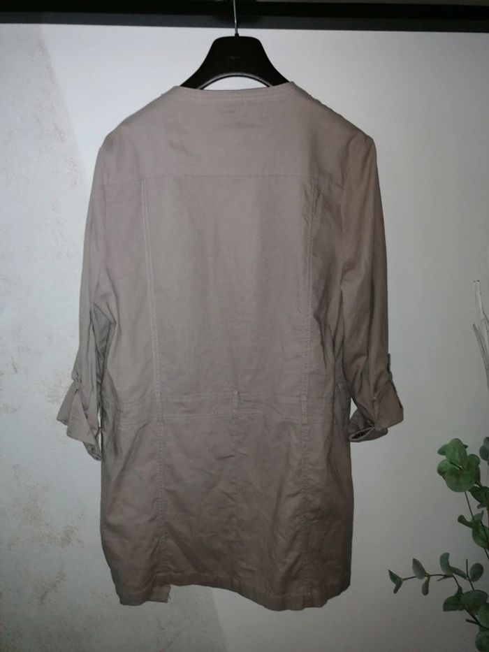 Portée 1fois, en état neuf.. Se porte en tunique ou en petite veste ouverte 😍 seul la ceinture est manquante.. Colori lin, se boutonne entièrement, manches retroussables. 2 poches.