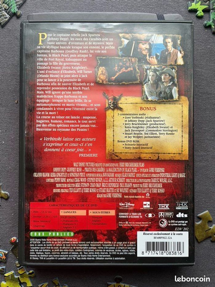 Vends DVD « Pirates des Caraïbes, la malédiction du Black Pearl ». Le boîtier est en très bon état général. Présence de traces d’usure mais rien d’important. Le DVD présente une légère marque mais fonctionne parfaitement. Il pèse 84g. Idéal pour les amateurs de cinéma ou du film, collectionneurs