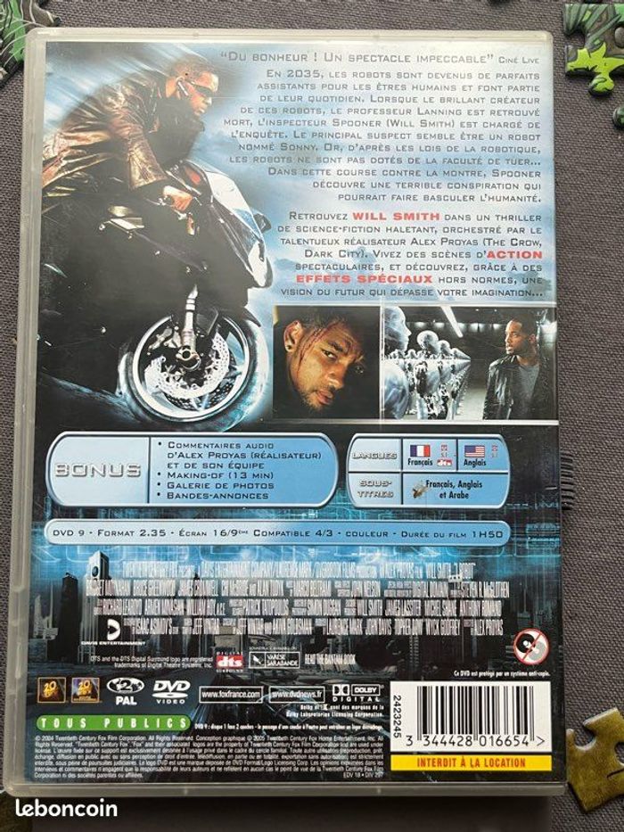 Vends DVD « I, Robot » édition 1, avec Will Smith. Le boîtier est en très bon état général. Légères traces d’usure mais rien d’important. Le DVD présente de légères traces mais rien d’important, fonctionne parfaitement. Il pèse 110g. Idéal pour les amateurs de cinéma, du film, de l’acteur ou collectionneurs.