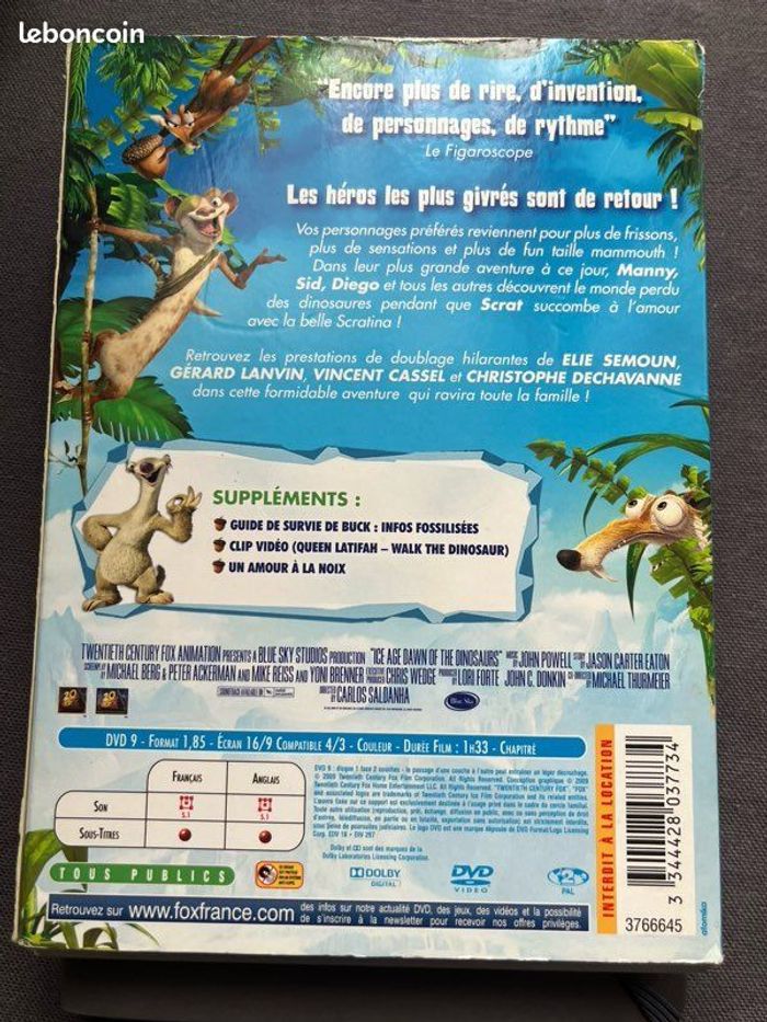 Vends DVD du film « l’âge de glace 3 : le temps des dinosaures ». La jaquette est en bon état. Présence de traces d’usure mais rien d’important. Le boîtier est en très bon état. Le DVD présente des traces mais fonctionne parfaitement. Il pèse 113g. Idéal pour amateurs de cinéma, enfants ou collectionneurs.
