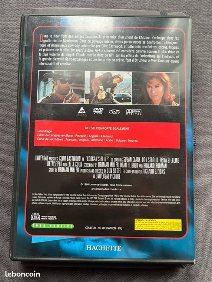Vends DVD du film « Un shérif à New York » avec Clint Eastwood. Le boîtier est en très bon état général. Le DVD présente une petite marque mais fonctionne parfaitement. Il pèse 100g. Idéal pour les amateurs de cinéma, fans de Clint Eastwood ou collectionneurs.