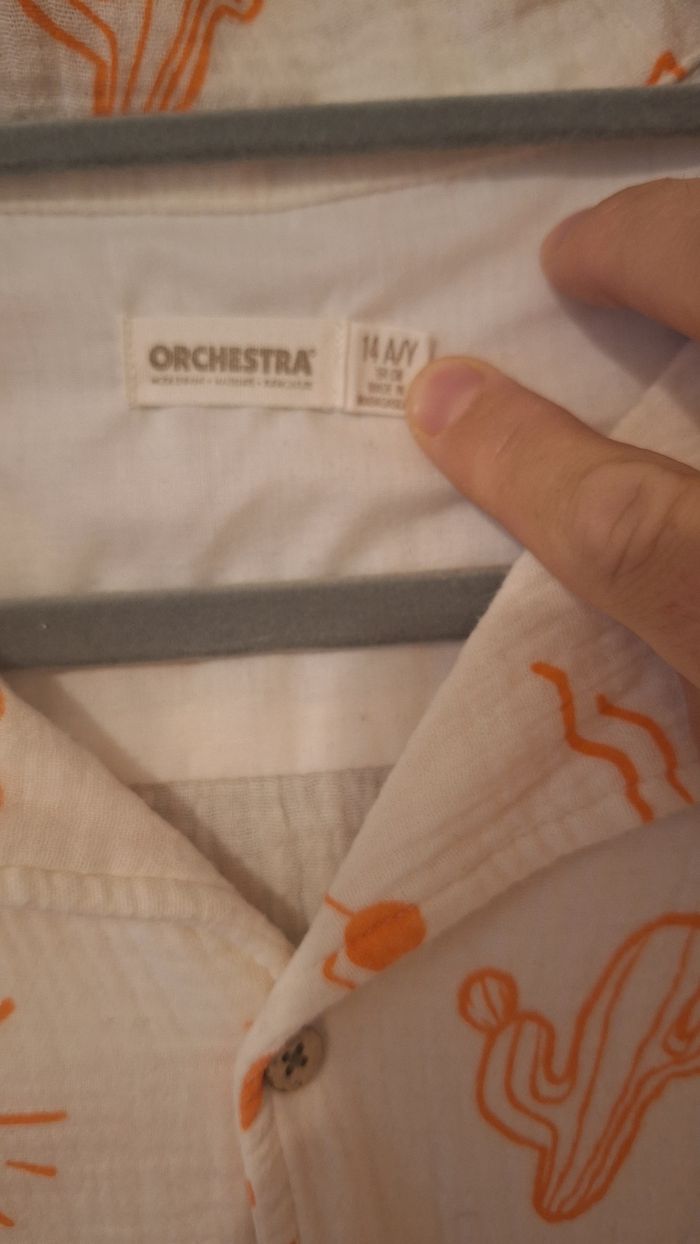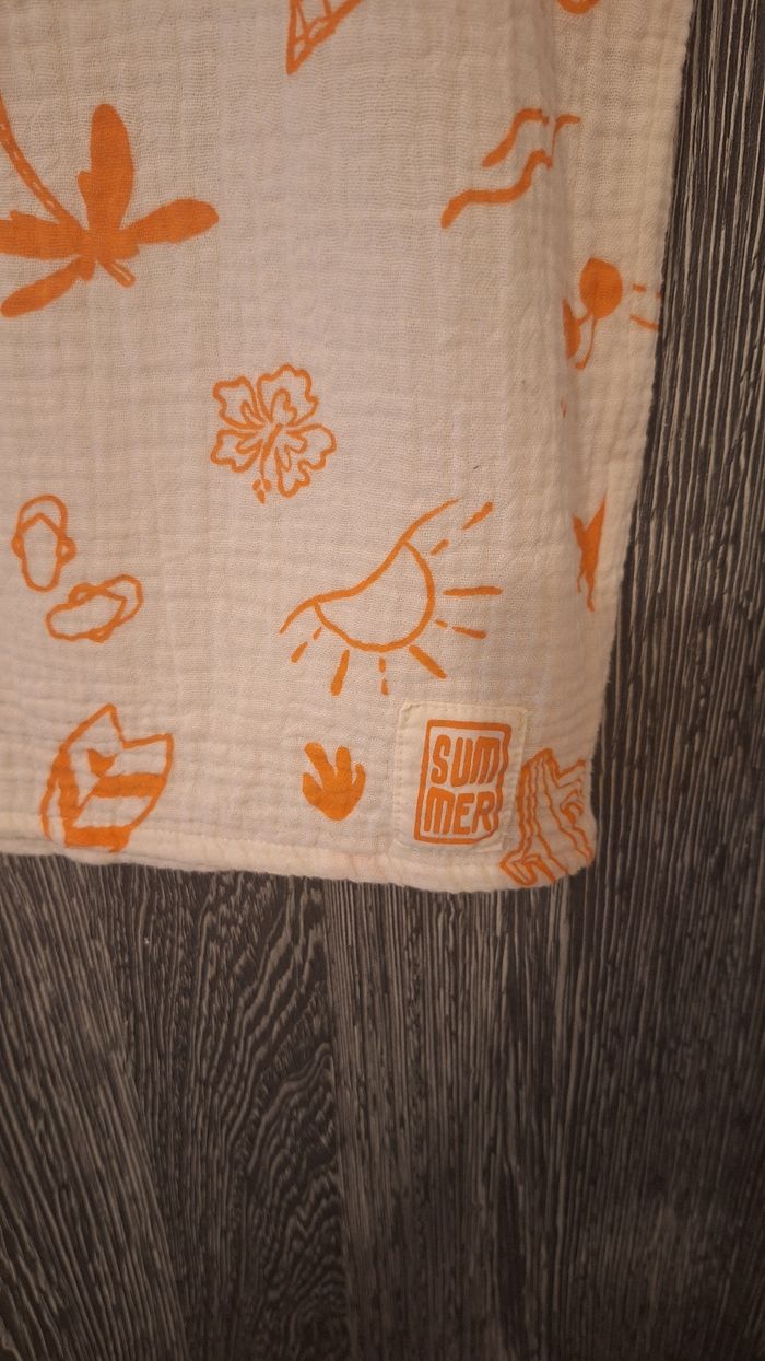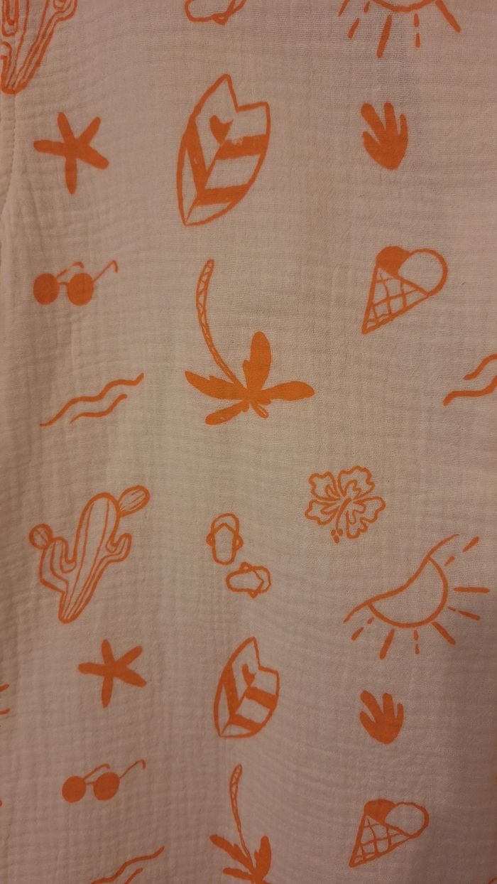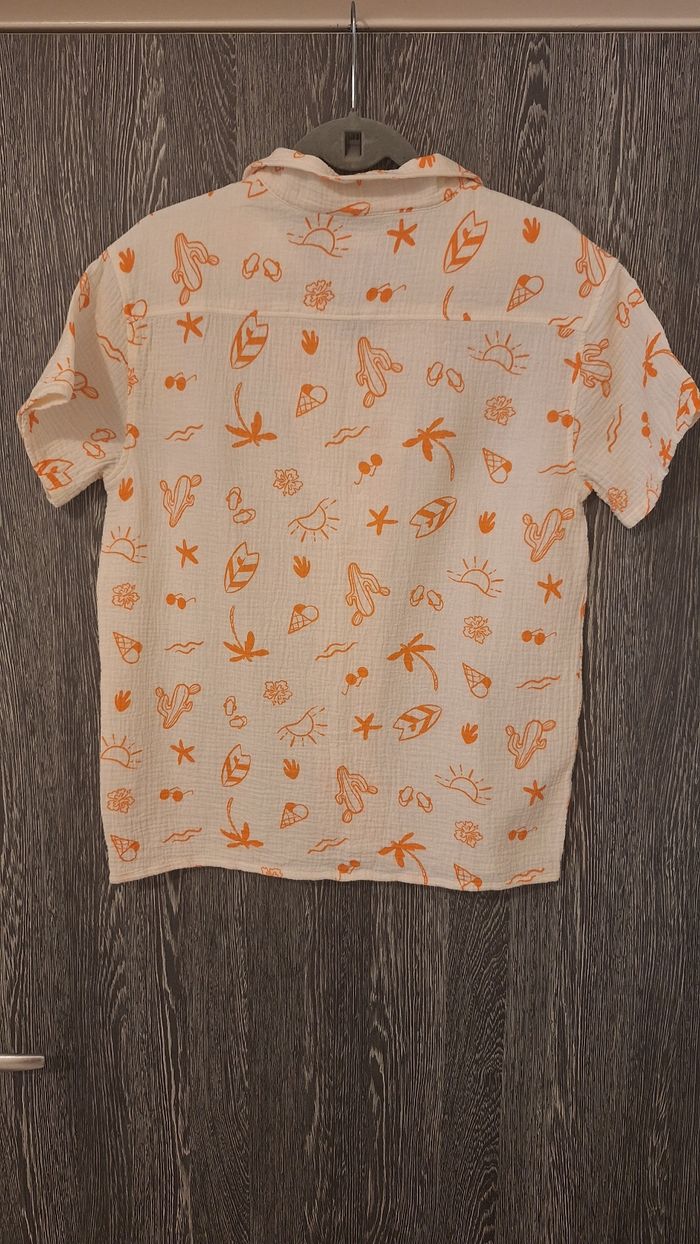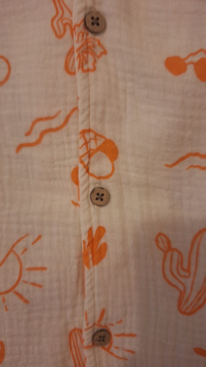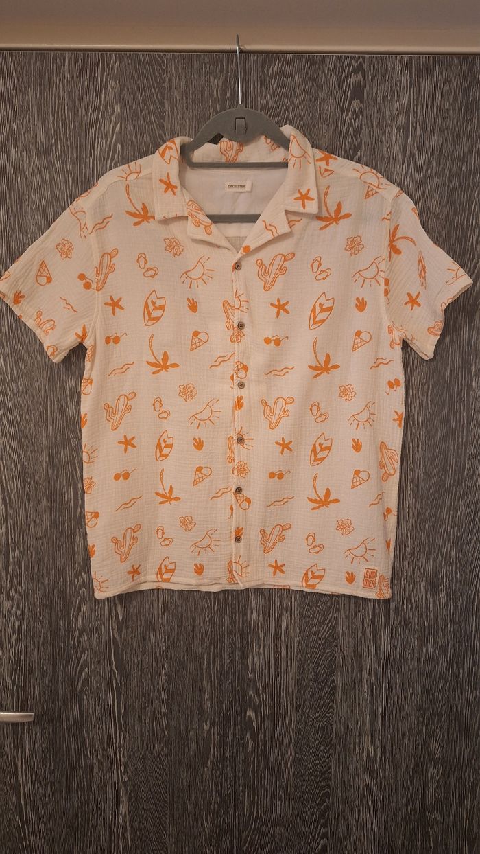 Bonjour ✴️Je vends cette chemise manches courtes neuve ✴️De la marque Orchestra ✴️Coloris blanc cassé ✴️Imprimé fantaisie esprit vacances d'été all-over orange ✴️Col cubain. Ouverture boutonnée à l'avant,Boutons coco. ✴️Étiquette tissée ton sur ton "Summer" dans le coin inférieur gauche. ✴️100% en gaze de coton