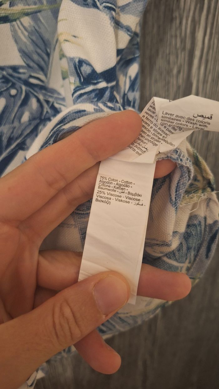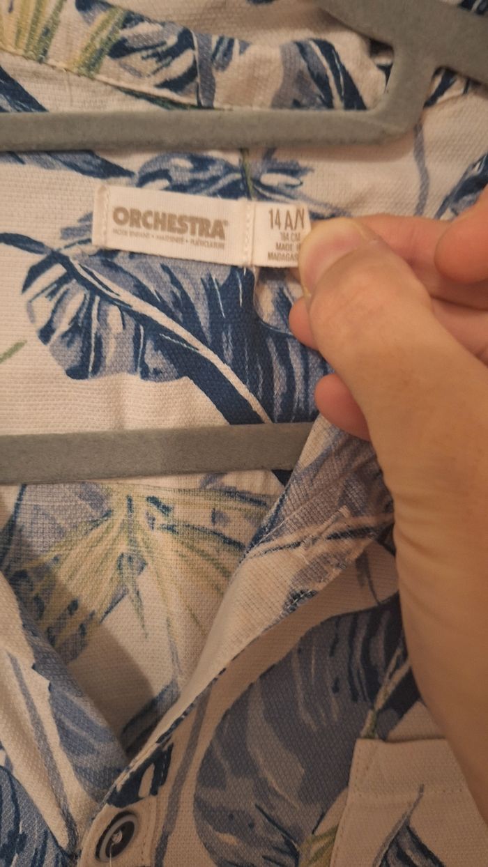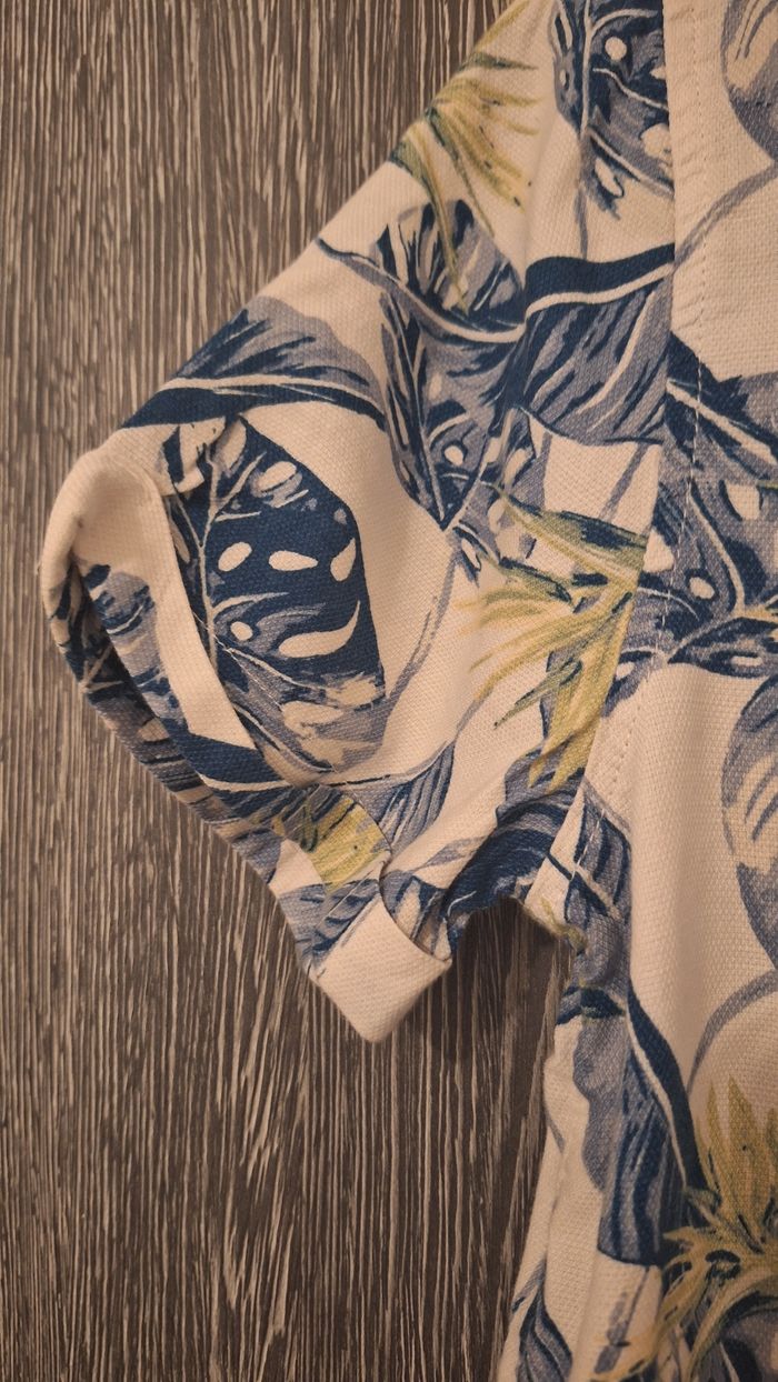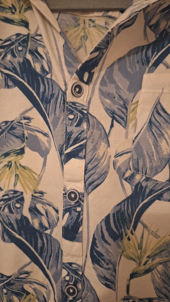 Bonjour ✴️Je vends cette chemise manches courtes neuve ✴️De la marque Orchestra ✴️Coloris blanc cassé ✴️Imprimé végétal all-over bleu et jaune ✴️Col cubain. Ouverture boutonnée à l'avant ✴️75% coton et 25% viscose