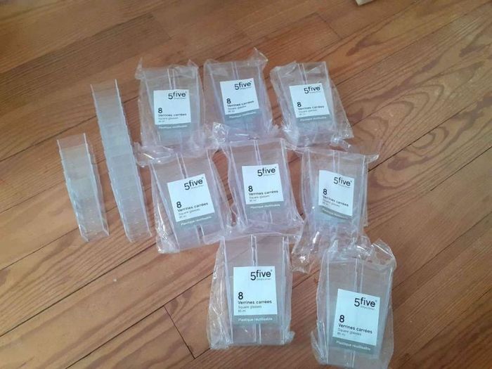 Vend 8 paquets de 8 verrines chacun. 2 euros le paquets. Et un lot de verrines non emballé. 1.50 euros le lot. Carrés, hautes, plastiques. #FêteHappy71120