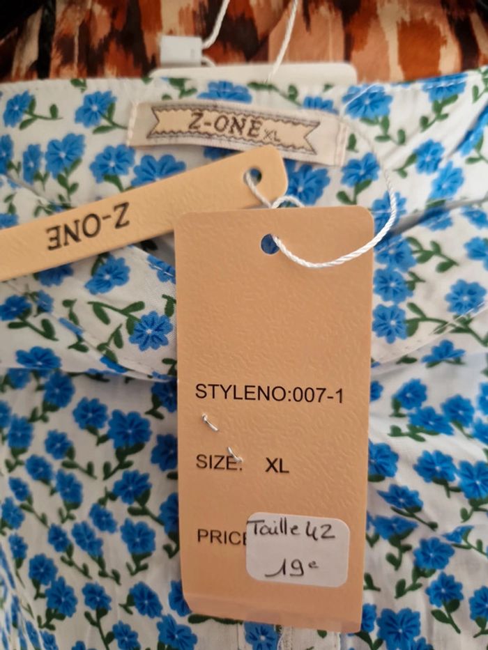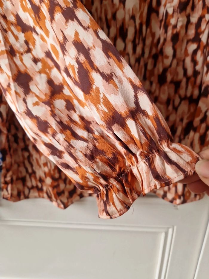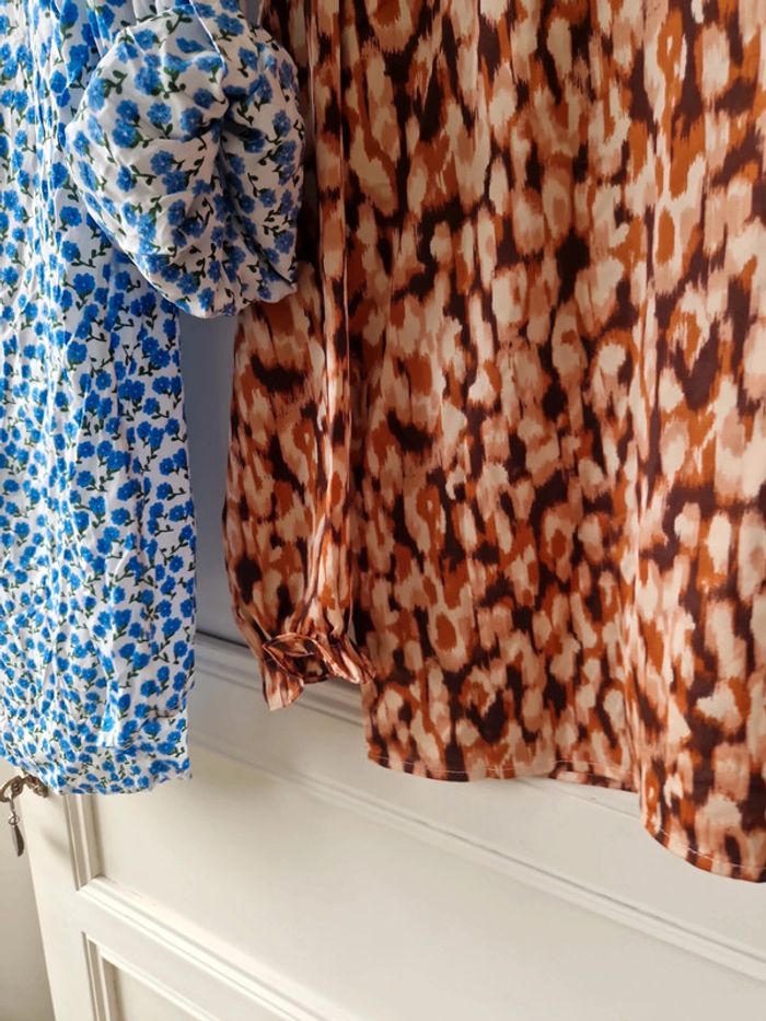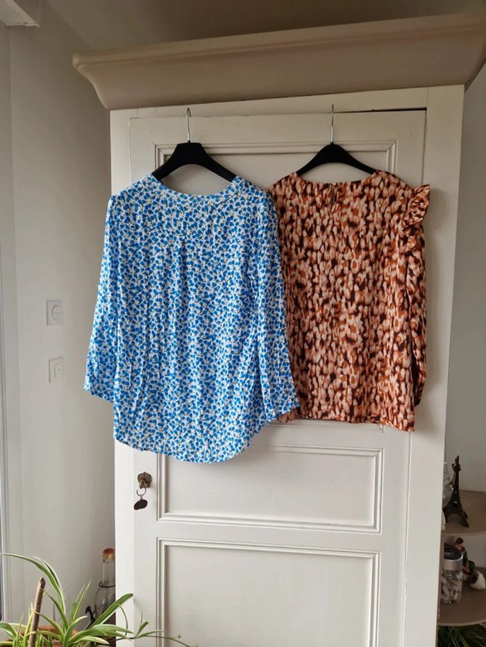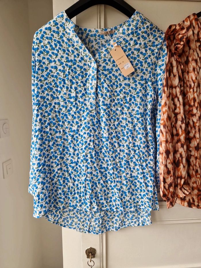 Lot de deux blouses neuves avec étiquettes 🏷. Une blouse motifs léopard 🐆 manches longues resserrées en bas avec un volant. Volant dentelle également sur les épaules. Fermeture par un petit bouton. 100% polyester Blouse motifs liberty fleurs bleues. Manches longues avec une pattes pour retrousser les manches. Petite boutonnière devant avec un décolleté en V. Blouse 100% viscose. #ellaben_blousesfemmes #ellaben_grandestailles