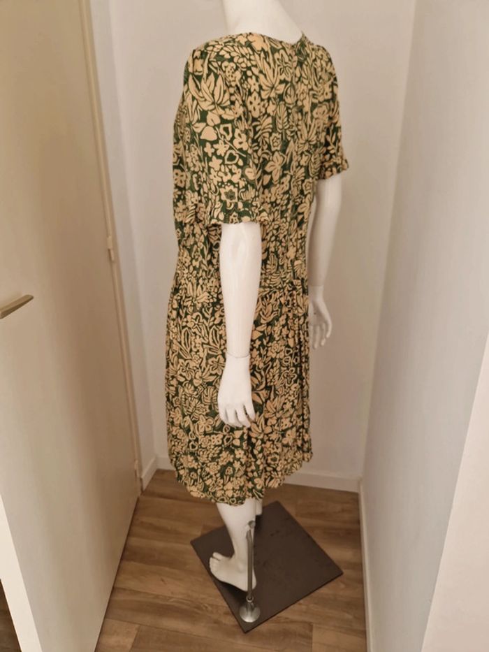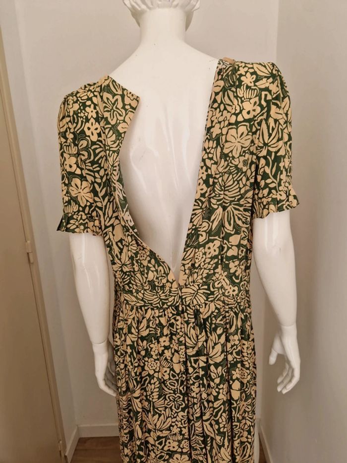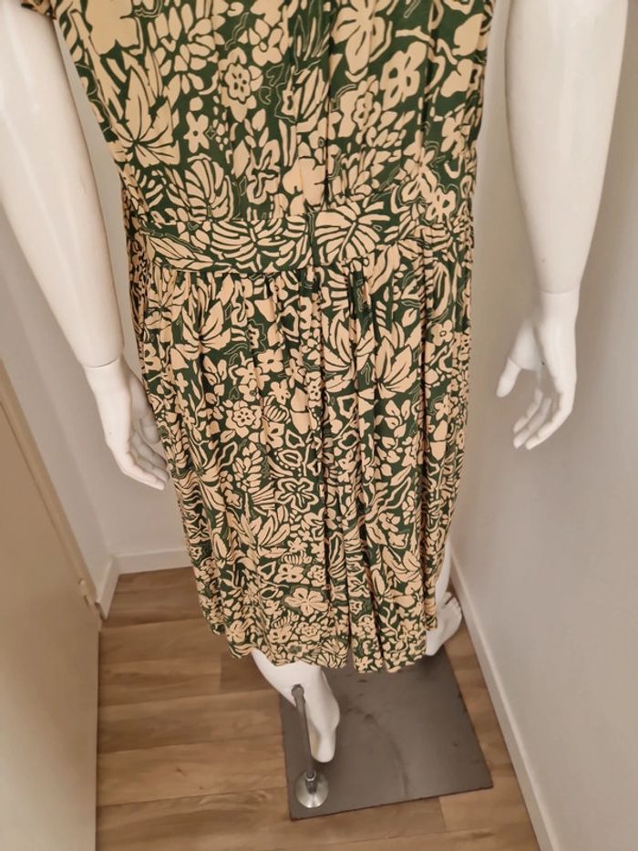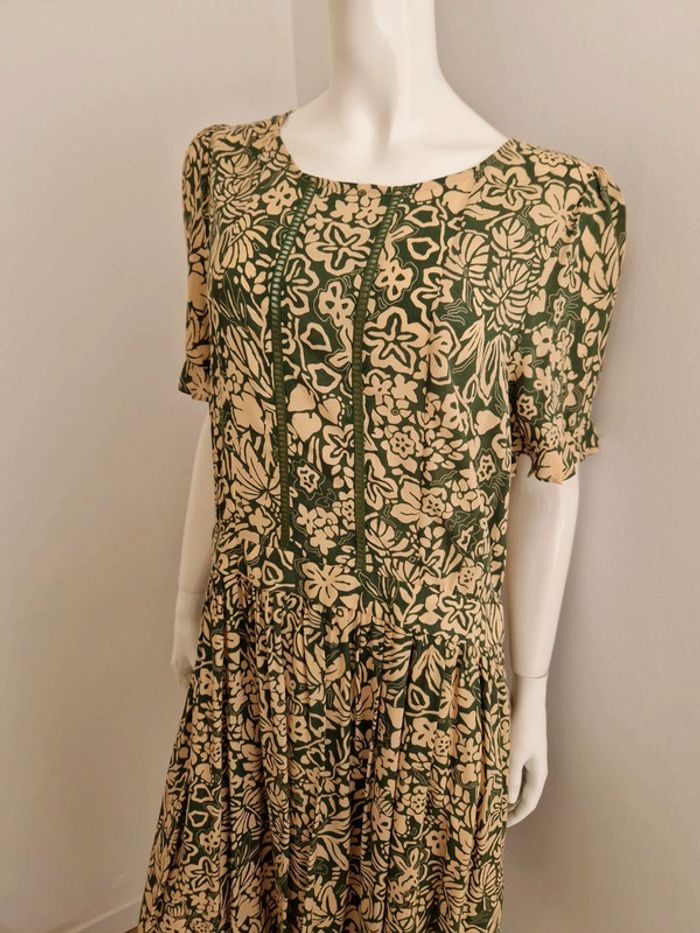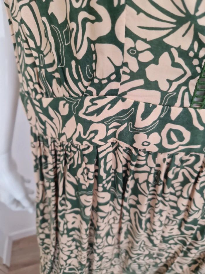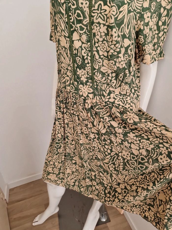 Jolie robe maxi à motifs floraux verts sur fond crème. Manches courtes avec un petit volant. Ceinture lâche à la taille. Deux rangées de dentelle verte sur la poitrine, Encolure ronde. Jupe doublée Fermeture invisible dans le dos. Très fluide avec un tissus soyeux 100% viscose #ellaben_robes #ellaben_grandestailles Les réductions sont activés sur les lots alors nésitez pas à consulter mes autres annonces.