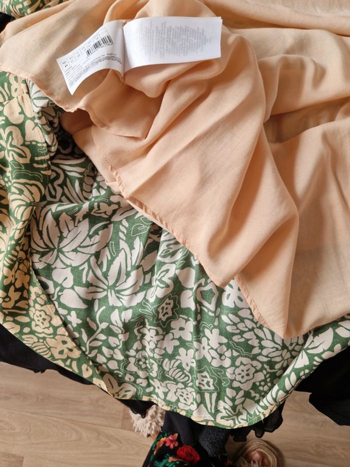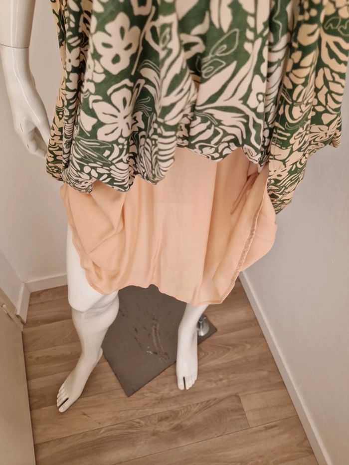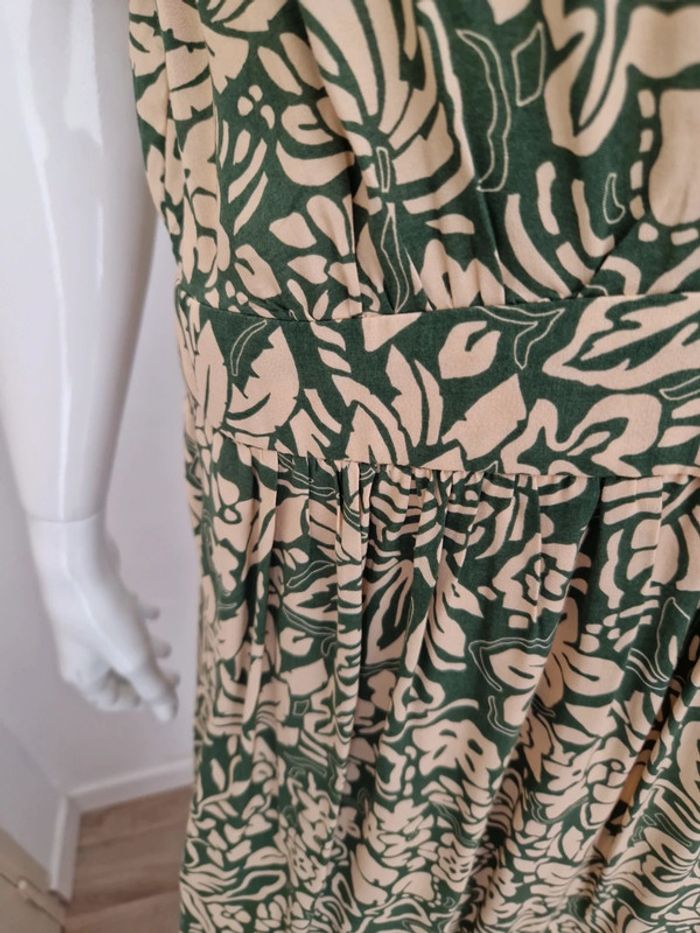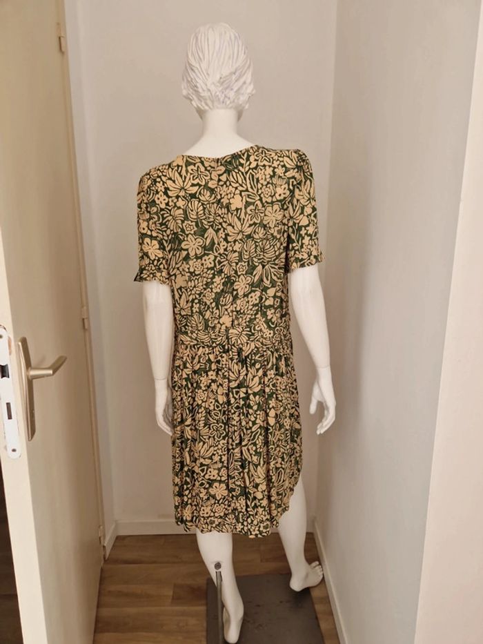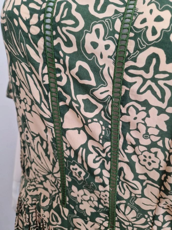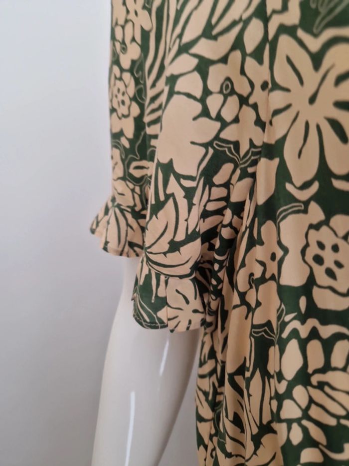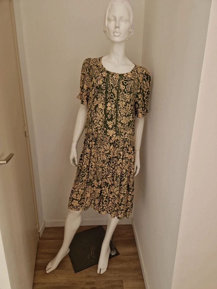 Jolie robe maxi à motifs floraux verts sur fond crème. Manches courtes avec un petit volant. Ceinture lâche à la taille. Deux rangées de dentelle verte sur la poitrine, Encolure ronde. Jupe doublée Fermeture invisible dans le dos. Très fluide avec un tissus soyeux 100% viscose #ellaben_robes #ellaben_grandestailles Les réductions sont activés sur les lots alors nésitez pas à consulter mes autres annonces.