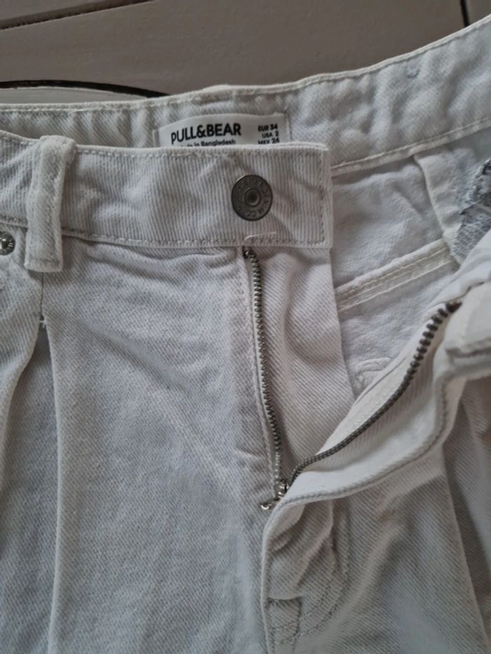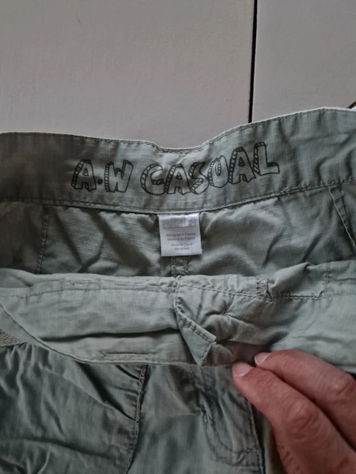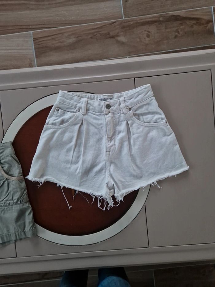 Deux shorts différents dans ce lot. Un short en jean blanc Pull&bear. Bouton métallique et fermeture éclair. Deux poches plaquées a la taille idem derrière. Extrémités effrangés. 100% coton. Taille 34. Un short kaki fermeture par une double rangée de boutons et un zip. Deux poches plaquées devant et deux autres derrière avec des boutons. Petite couture (trois points) à refaire au niveau du zip. Le prix tient compte de ce défaut. Marque A.W Casual. Lot INDISSOCIABLE #ellaben_shortsfemmes #ellaben_enfants