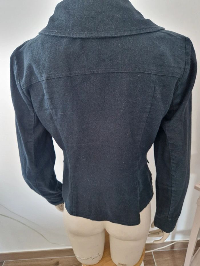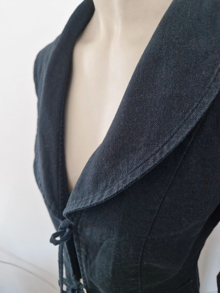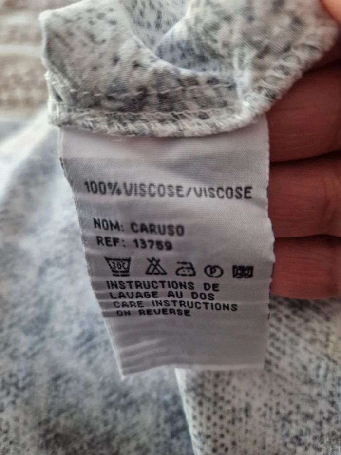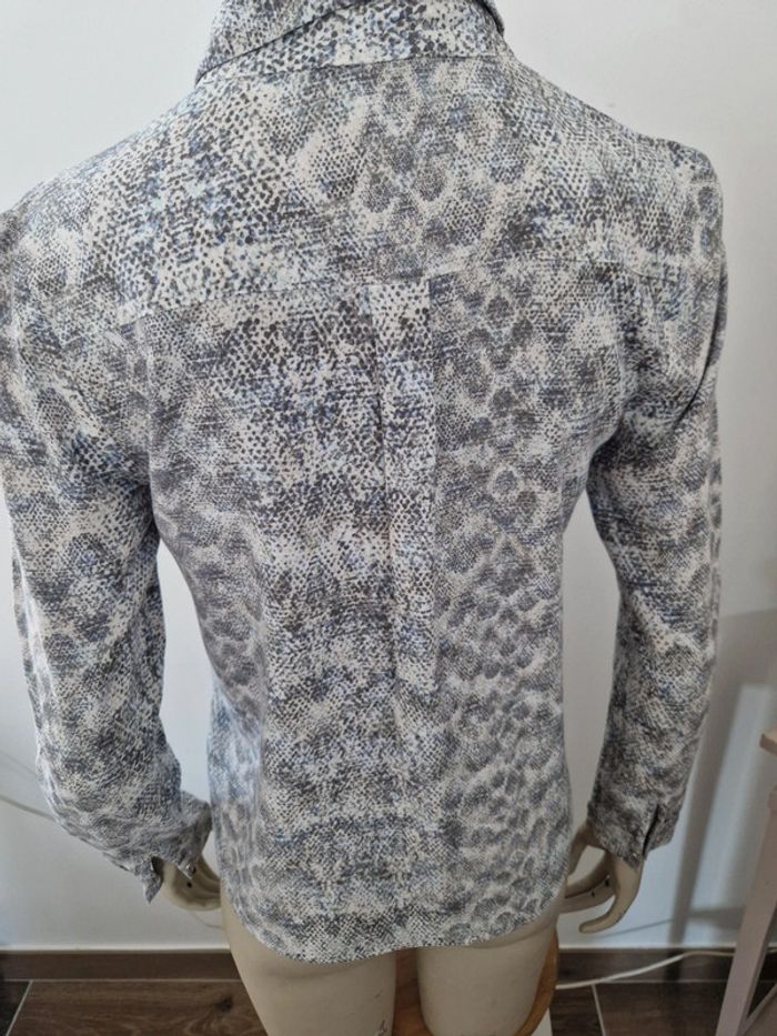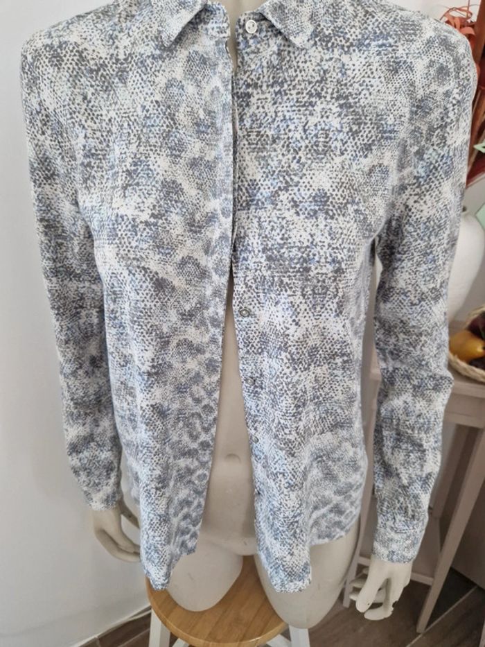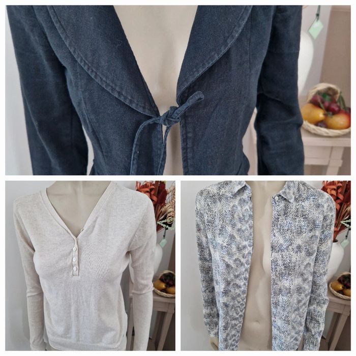 Une chemise légère motifs peaux de serpent. Manches longues et entièrement boutonnée devant. Chemise Sud Express taille 36. 100 viscose Gilet près du corps décolleté en V devant et derrière, manches longues. Marque On step taille 36 .Gilet 100% coton. Veste noire 🖤 avec un grand col. Fermeture par deux lacets. Deux poches avec boutons sur les côtés. Marque Mim taille 36 .55% lin et 45% viscose. Lot indissociable . Prix du lot complet #ellaben_chemisefemme #ellaben_pullsfemme #ellaben_vestesfemme