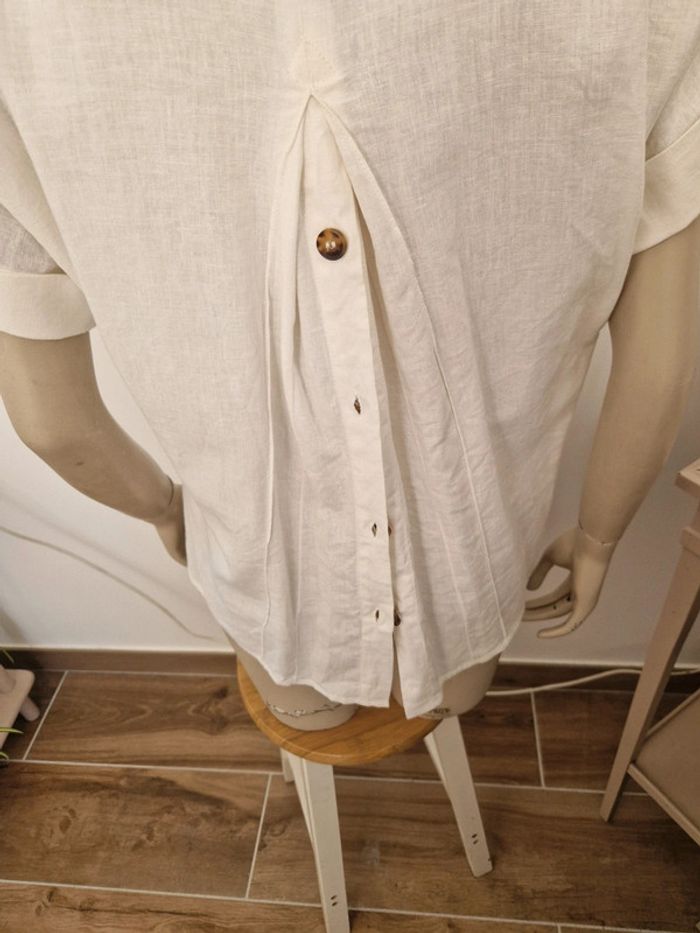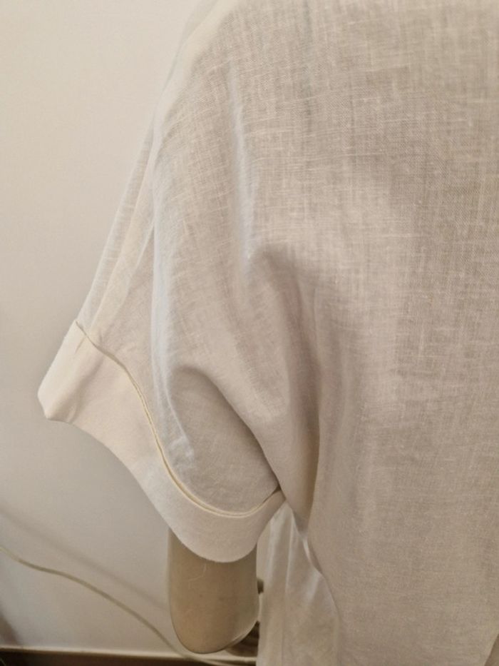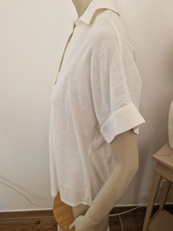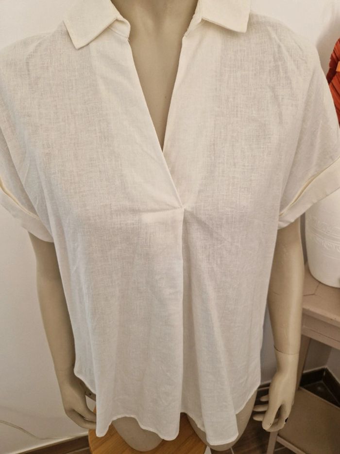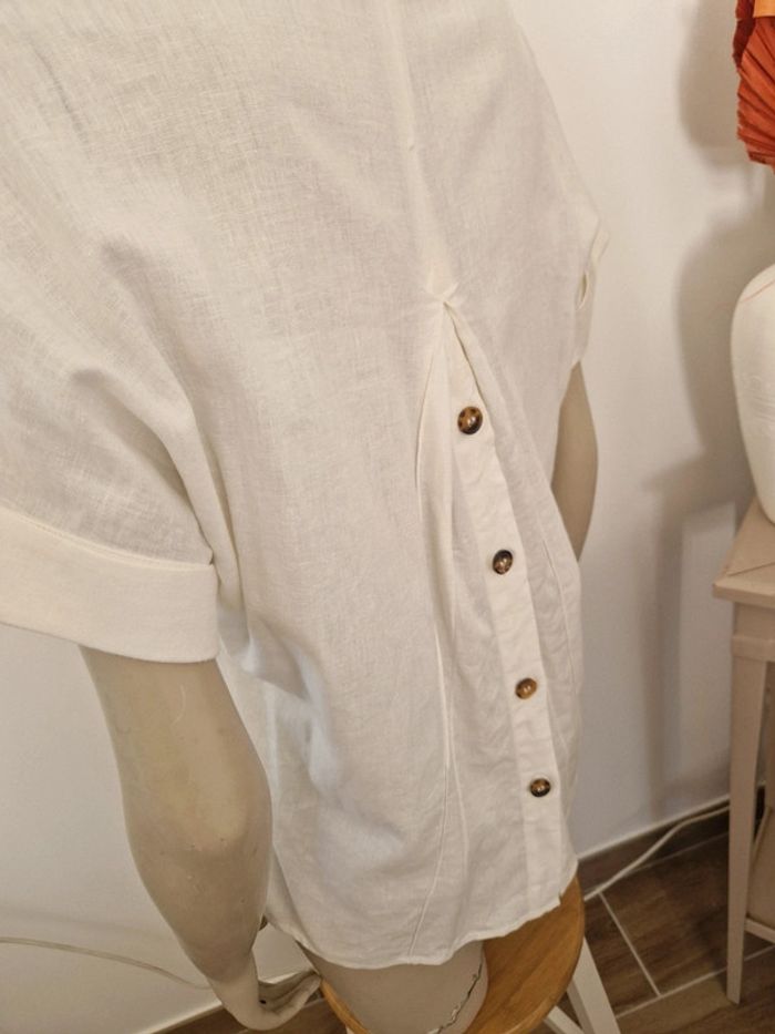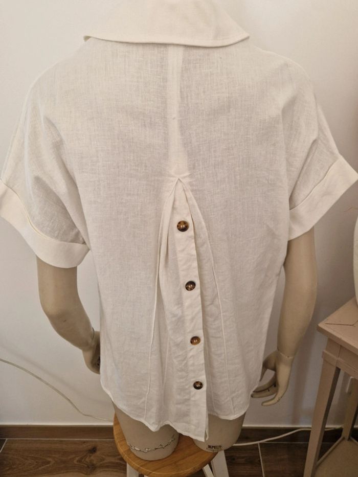 Joli blous/chemise original. Manches courtes avec un petit revers. Plis devant et ouverture boutonnée dans le dos. Décolleté en V avec un col. #ellaben_blousesfemmes #ellaben_chemisefemme #ellaben_blanc