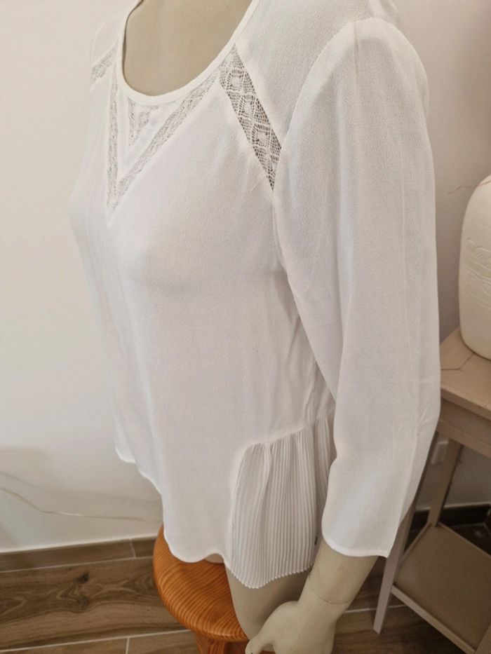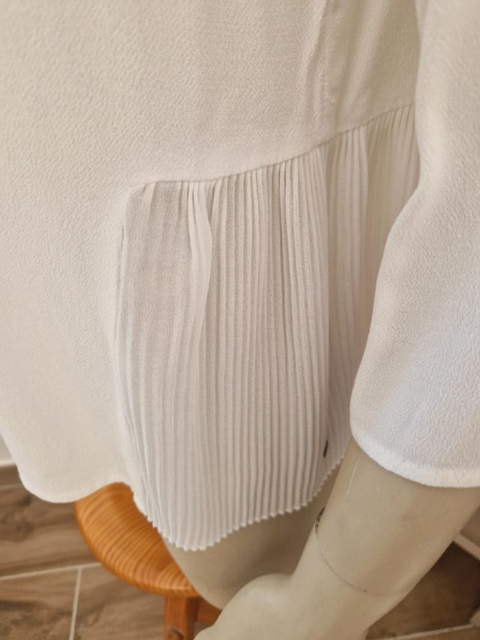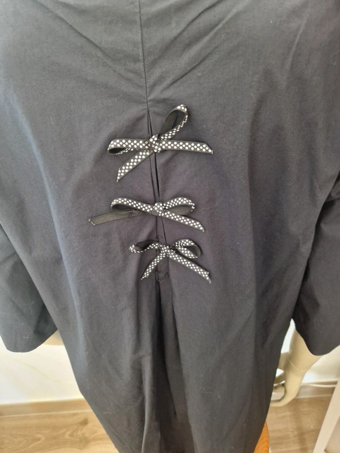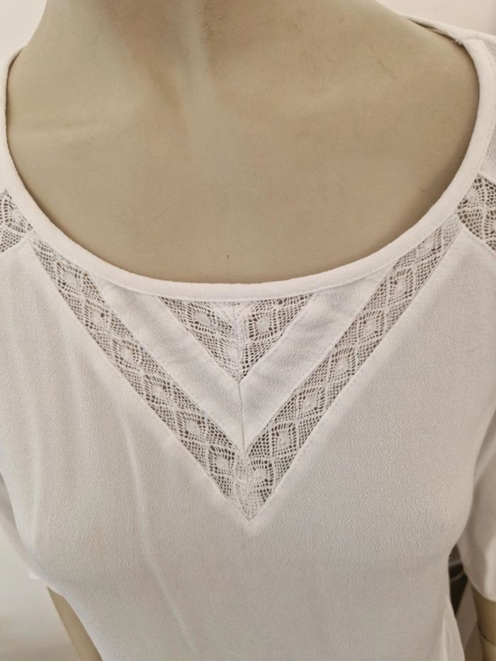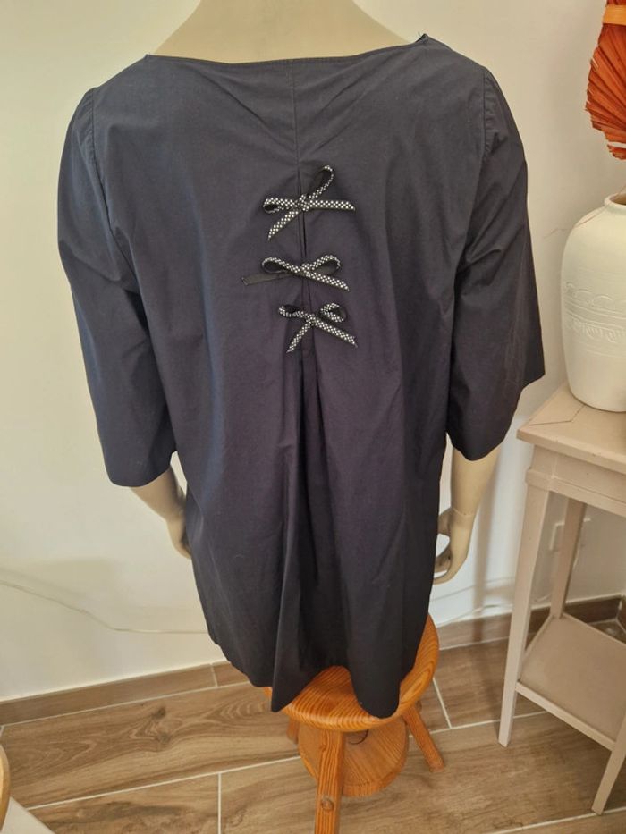 Jolie blouse longue fantaisie Noire unie devant et dans le dos une rangée de noeuds à pois blanc qui donne un côté original à cette blouse. Manches trois quarts. Décolleté en arrondi. Deux poches latérales.Marque Cos Jolie blouse blanche avec dentelle aux épaules et sur la poitrine. Encolure ronde. Manches trois quarts Volant à plis qui part d'un côté et fait le tour. Très fluide et agréable pour les beaux jours Marque Bonobo #ellaben_blousesfemmes #ellaben_blanc