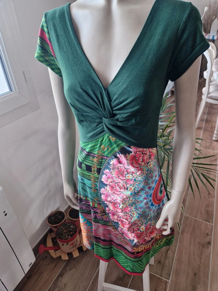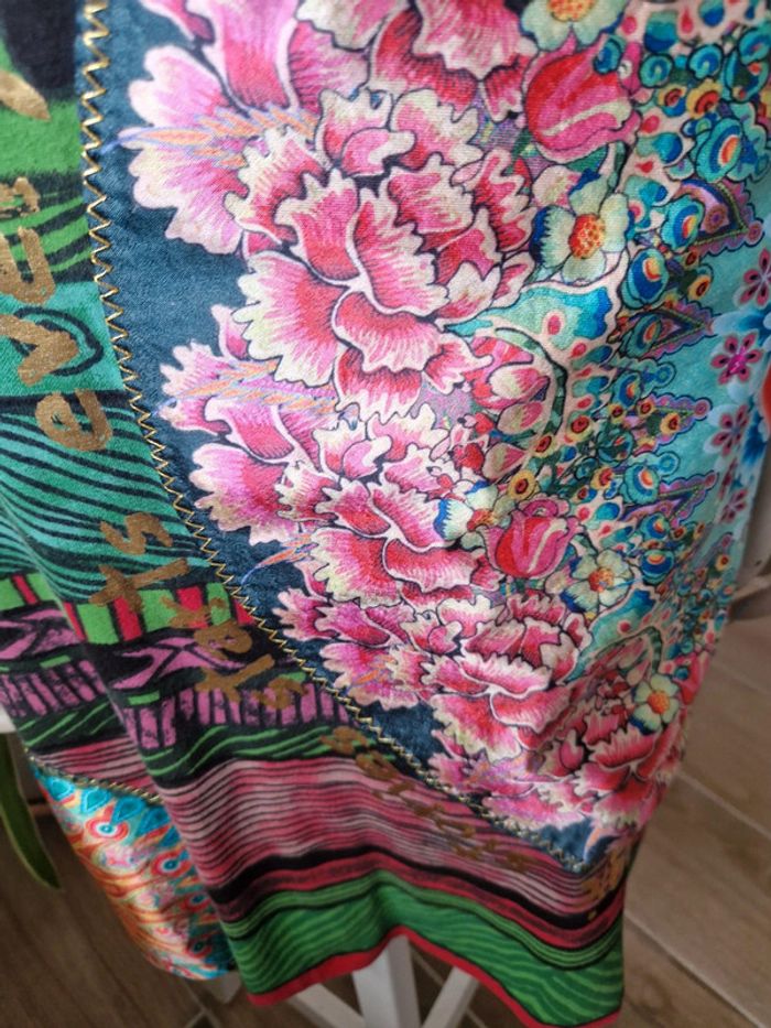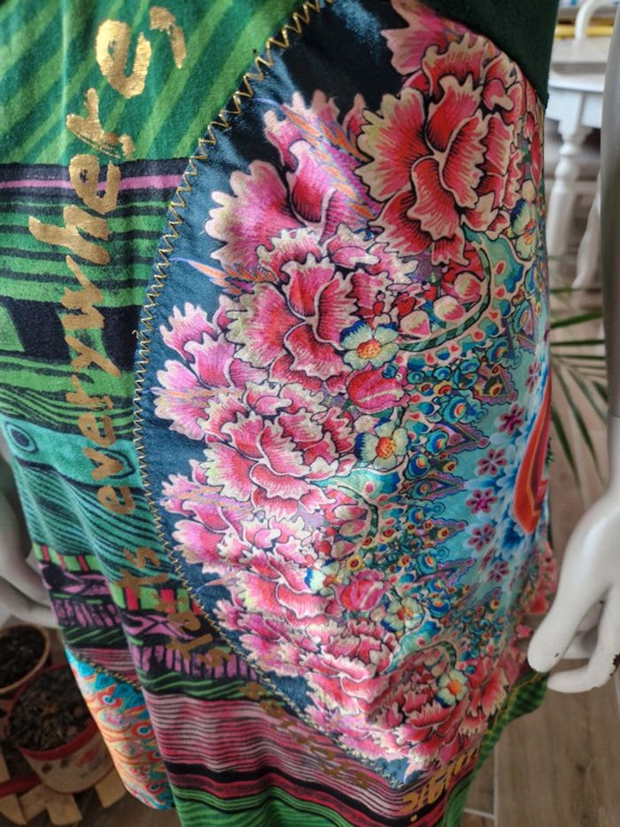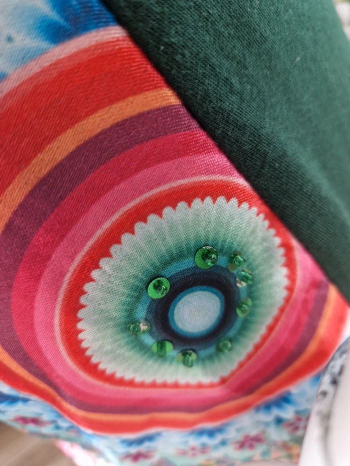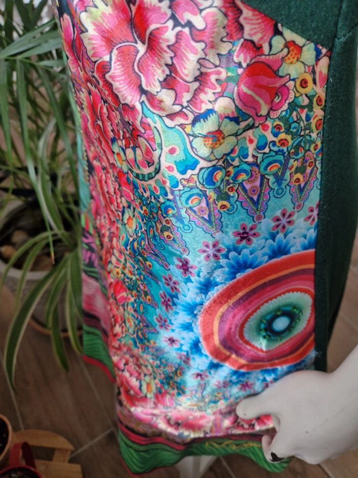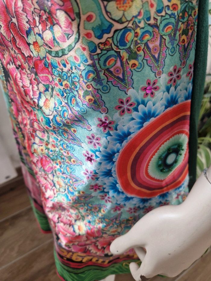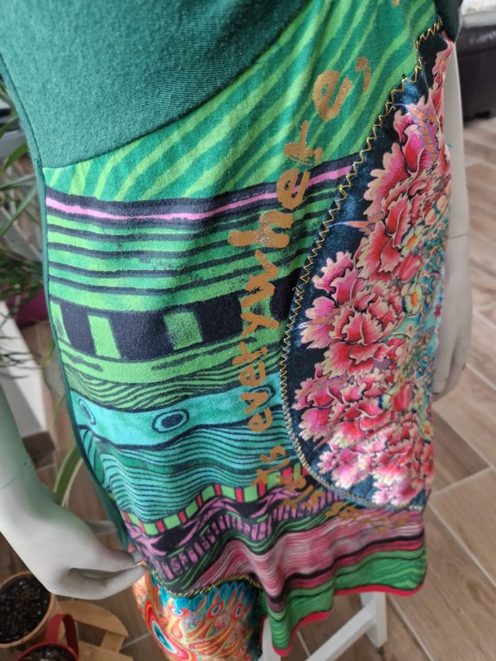 Jolie robe colorée avec deux décolleté en V. Celui de devant est fait à partir d'un noeud celui de derrière laisse entrevoir le dos. Superbe motifs de couleurs avec des lettres dorés et des perles. Manches courtes. Dos de la robe avec des motifs ton sur ton vers le haut. #ellaben_robes