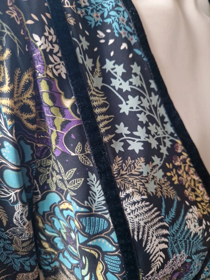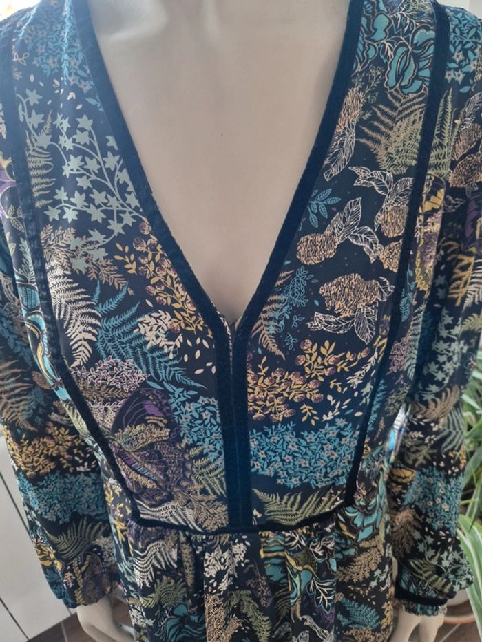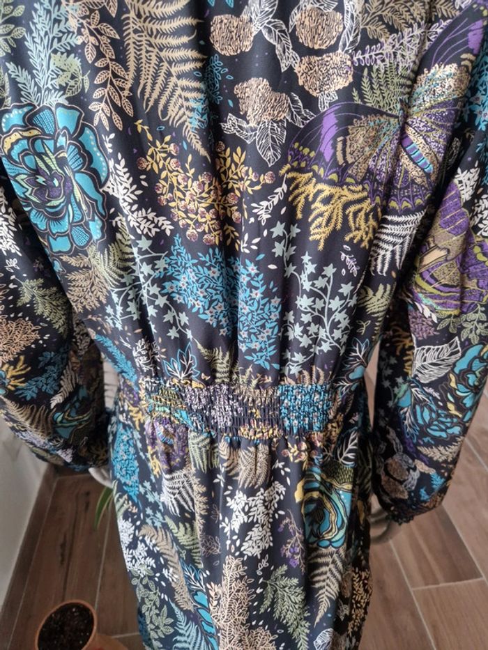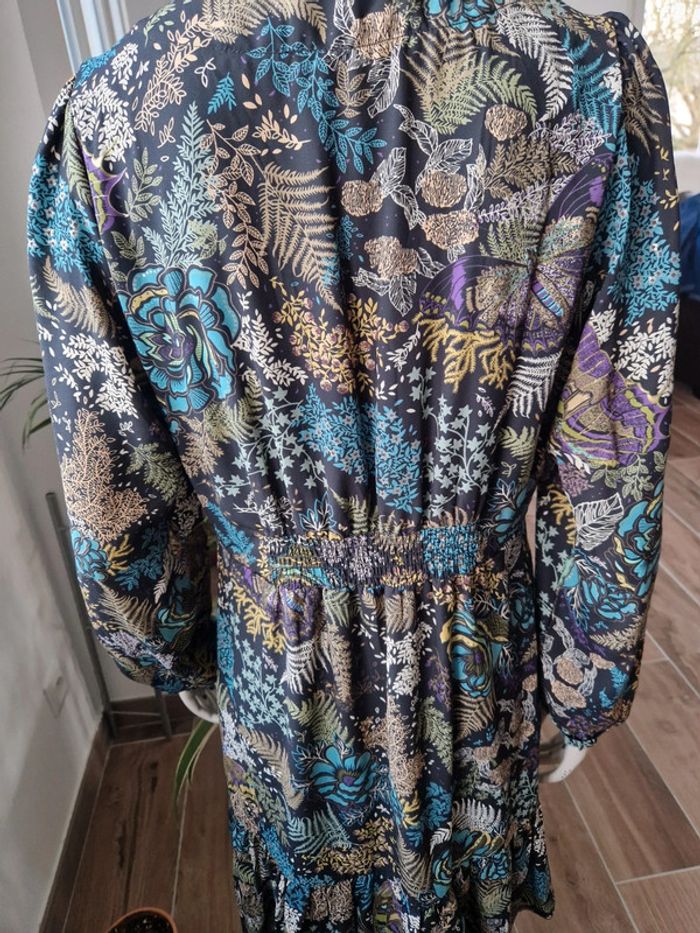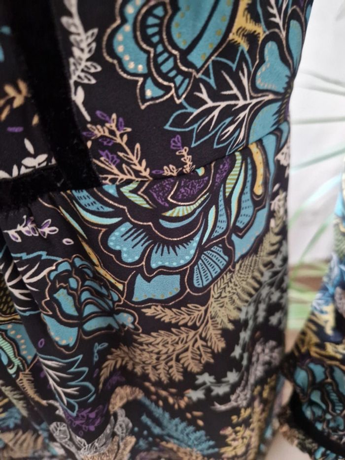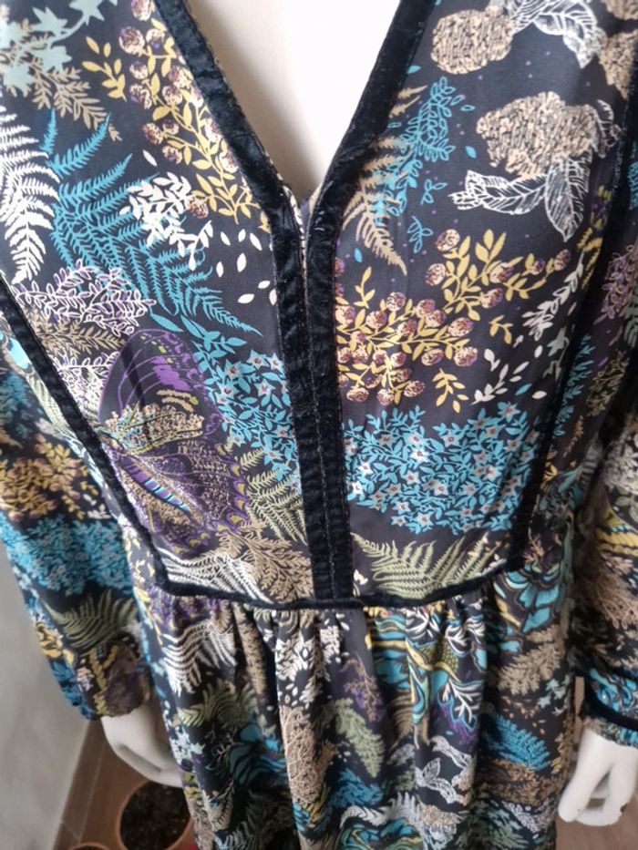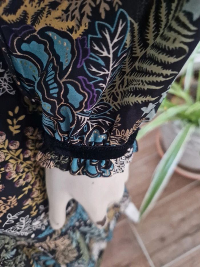 Superbe robe mi longue dans les tons vert et noir. Manches longues resserrées à l'extrémité. Décolleté en V bordé d'un ruban noir ⚫️. Ruban noir que l'ont retrouve à plusieurs endroits sur la robe. Robe très fluide. Robe 👗 entièrement doublée.