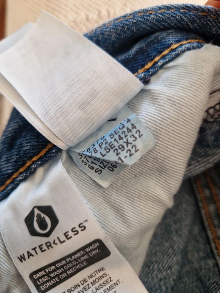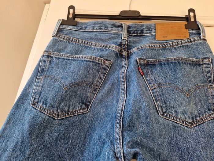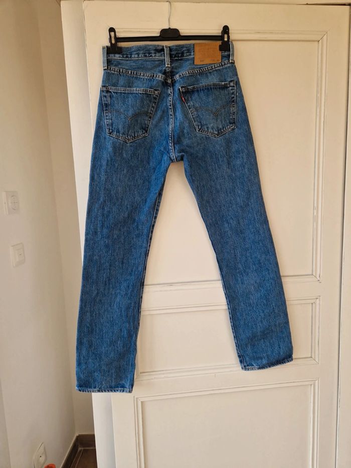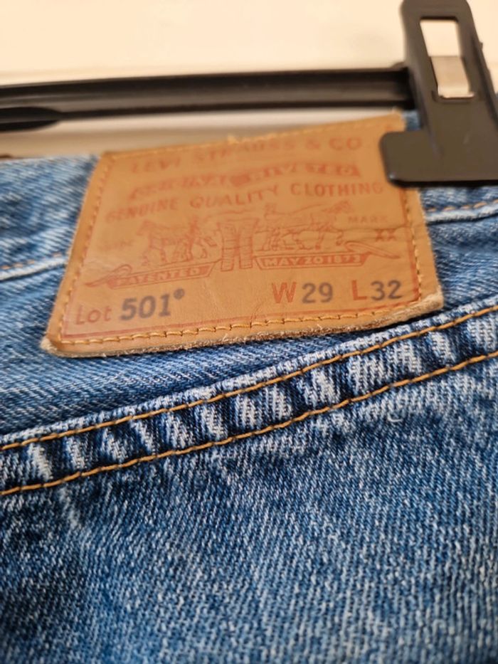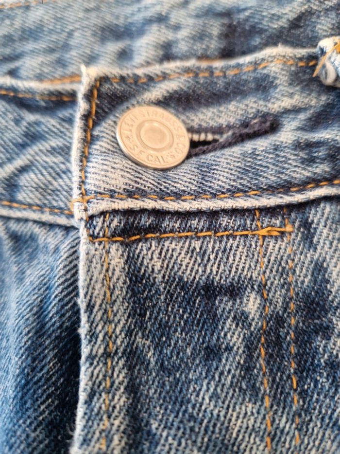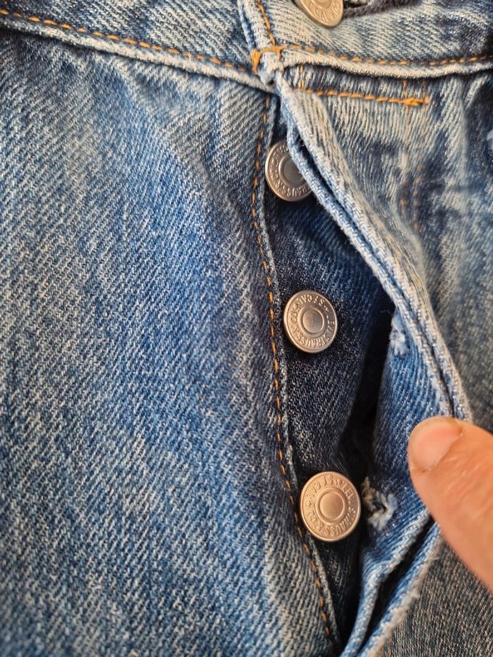 Ancien jeans 👖 Levis premium modèle droit. Fermeture par une rangée de boutons métalliques au nom de la marque. Quatres poches plaquées plus une poche tickets de métro avec des rivets . Inscription de la marque derrière au niveau de la ceinture. Levis 501 w29 L 32. #ellaben_jeans #ellaben_pantalonfemme