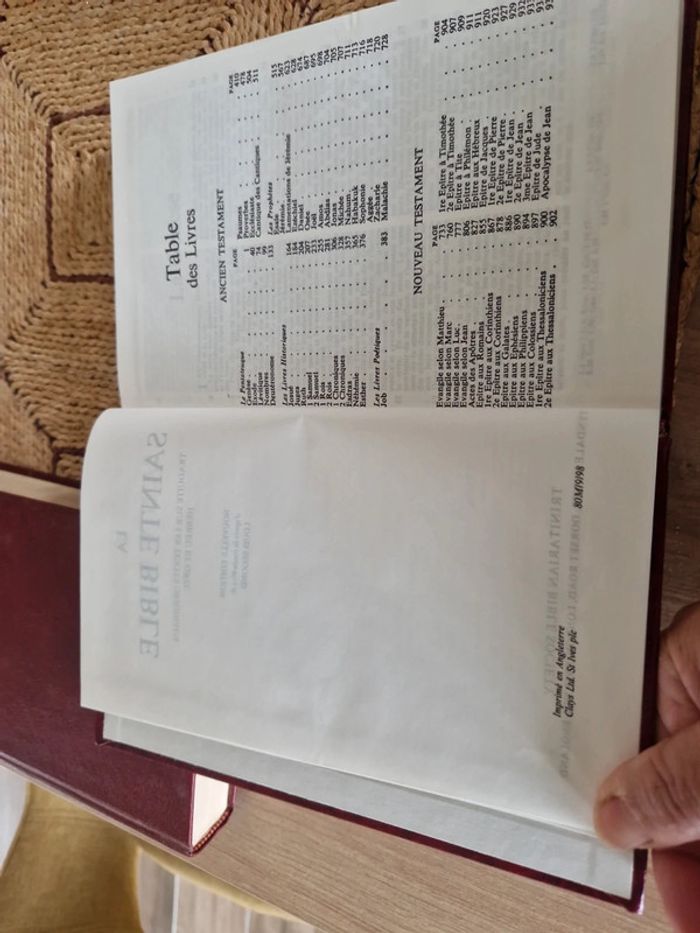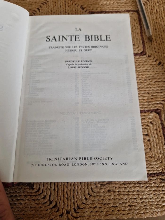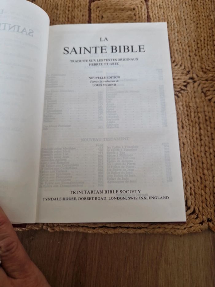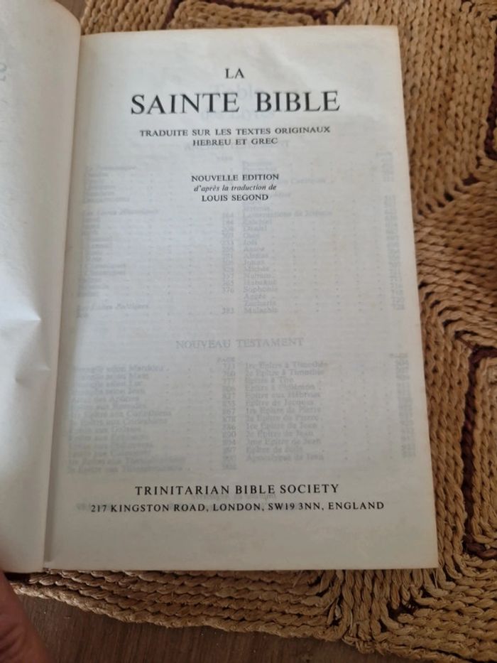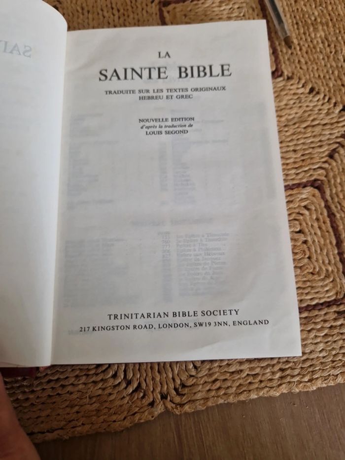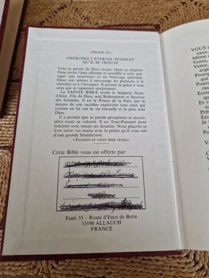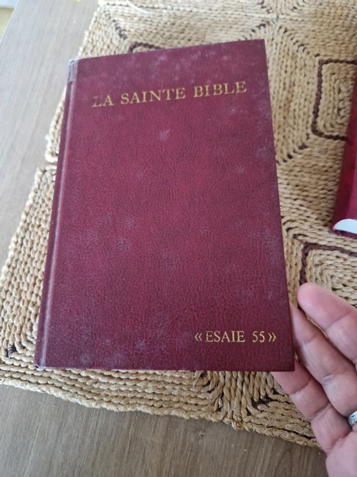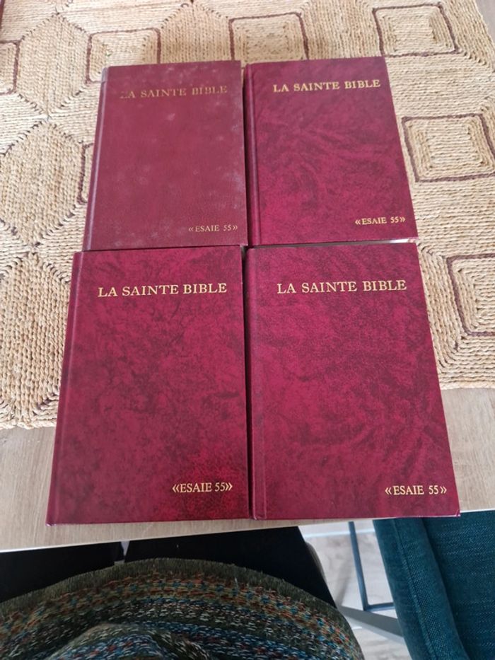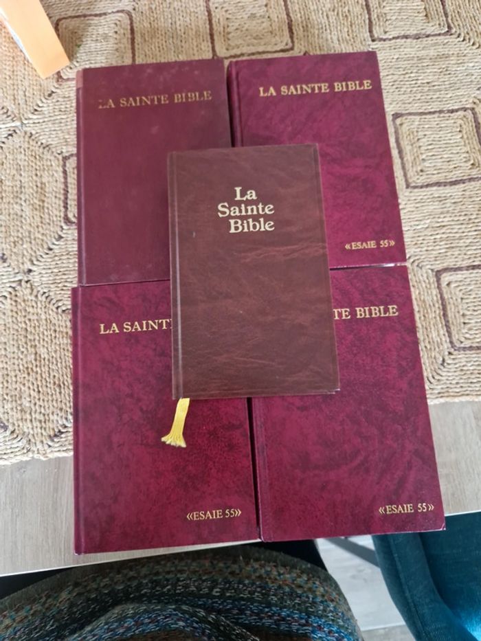 Lot de 5 bibles. 4 Sainte bible "Esaie 55" Différentes dates et différents états. 1 sainte bible qui comprend l'ancien et le nouveau testament traduit des textes originaux par J.N Darby. Bible &publications chrétiennes 2020. Neuf. Sainte bible " Esaie55" traduite sur les textes originaux Hébreux et Grec. Nouvelle édition d'après la traduction de Louis Segond. Trinitarian bible society. Année 98. Neuf Année 86 première page écrite. Année 91 neuf Année 89 bon état . Vente au détail ou au lot . Le prix affiché sur l'annonce est pour la bible J.N Darby. Les bibles Louis Segond le prix varie selon l'état de 12 à 15€ #ellaben_livres