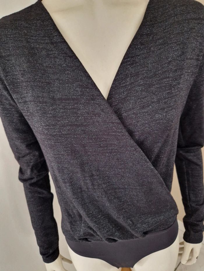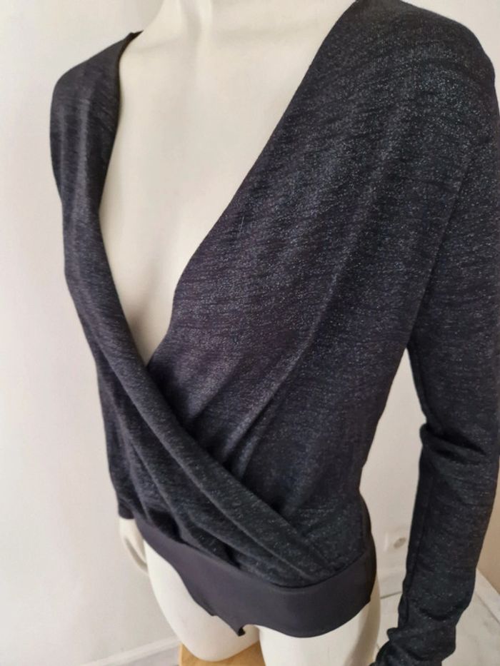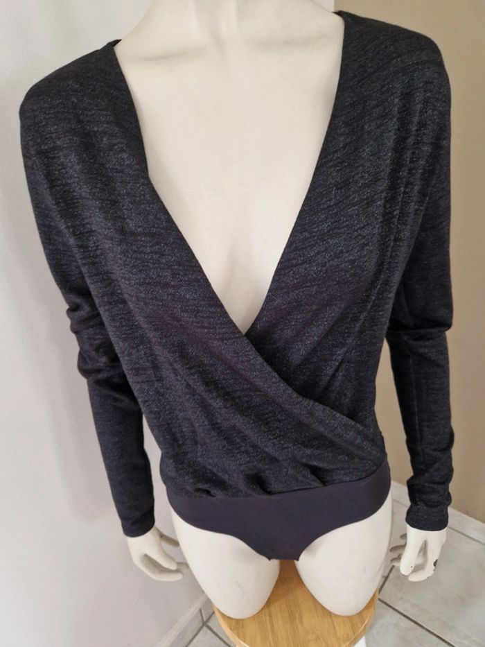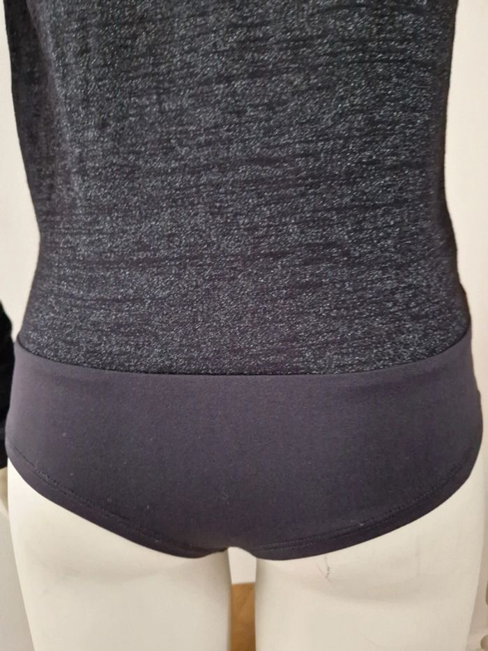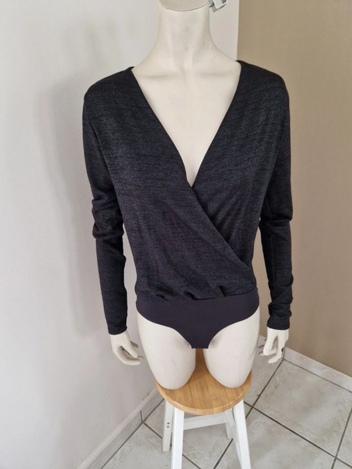 Joli body manches longues avec un décolleté croisé plongeant. Fermeture par deux boutons pressions en matière plastique . Tissus avec des fils métallique argentés viscose et élasthanne. #ellaben_lingeries