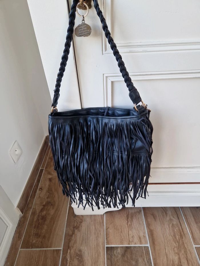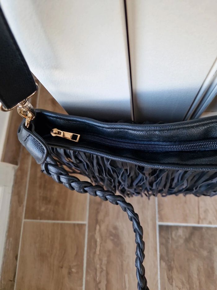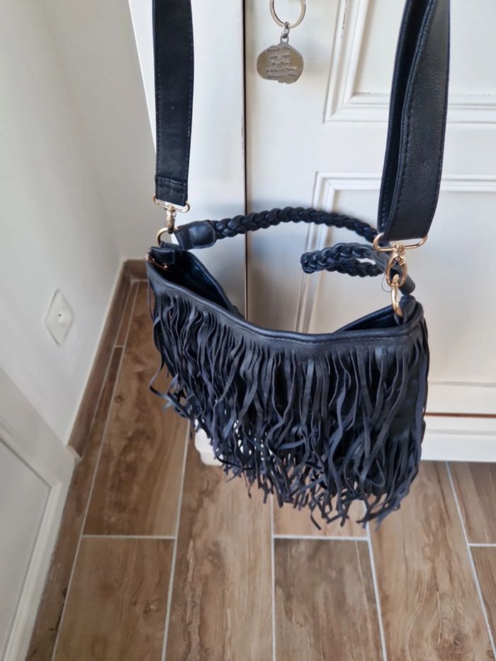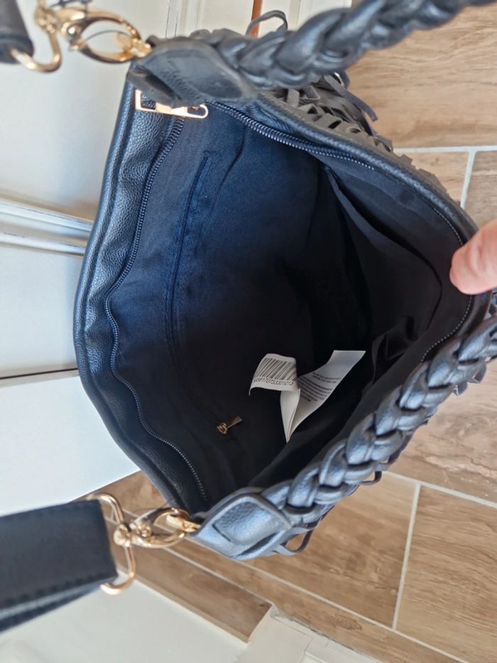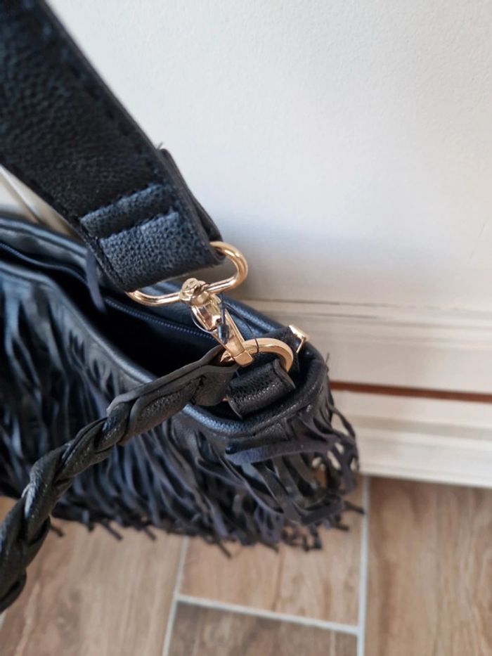 Joli sac 👜 noir 🖤avec des franges des deux côtés. Deux ances l'une est complètement Tressée et I'autre est plus grande avec des mousquetons. Elle est amovible et réglable. Grande fermeture éclair centrale. A l'intérieur une poche zippée et deux autres sans fermeture, 100 % Polyuréthane Dimensions 34×32cm #ellaben_sacs