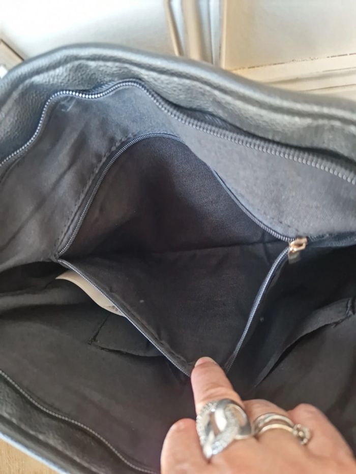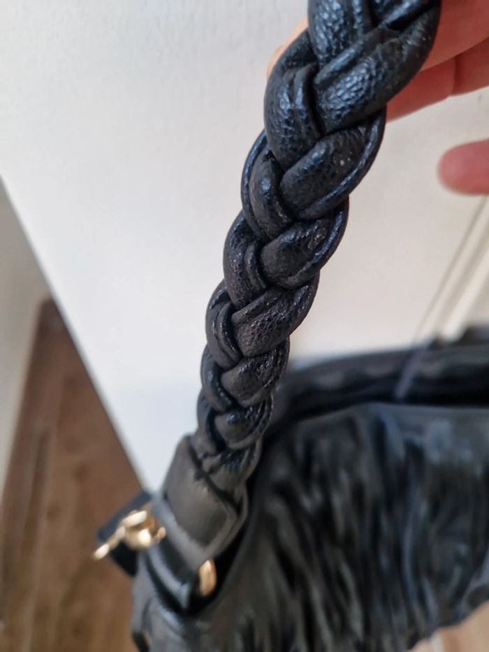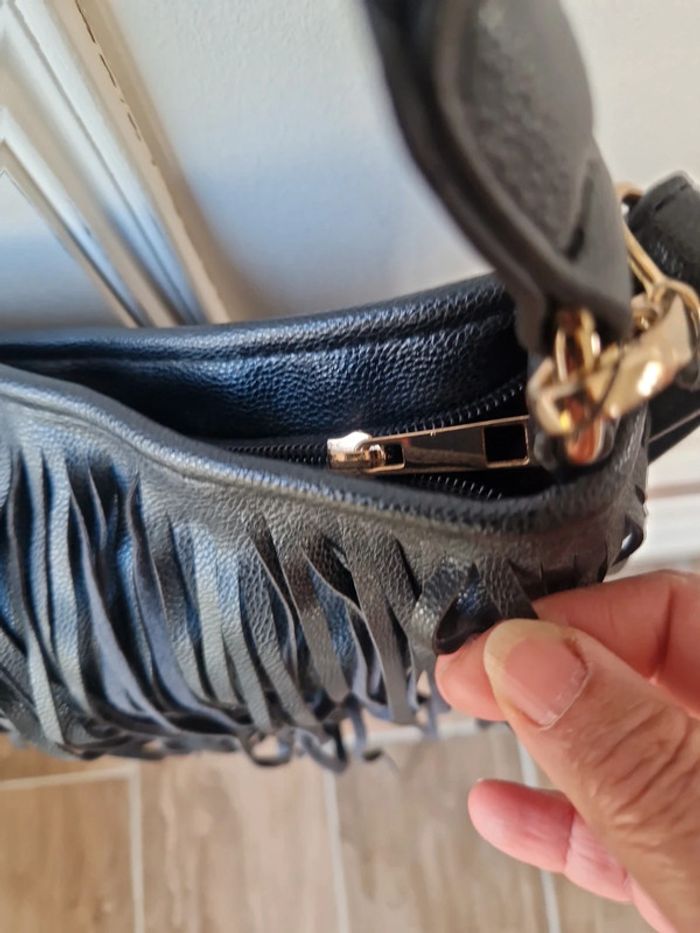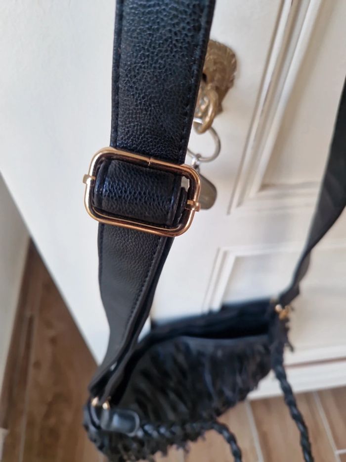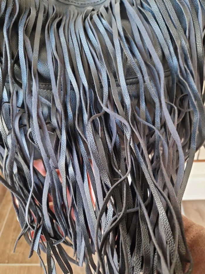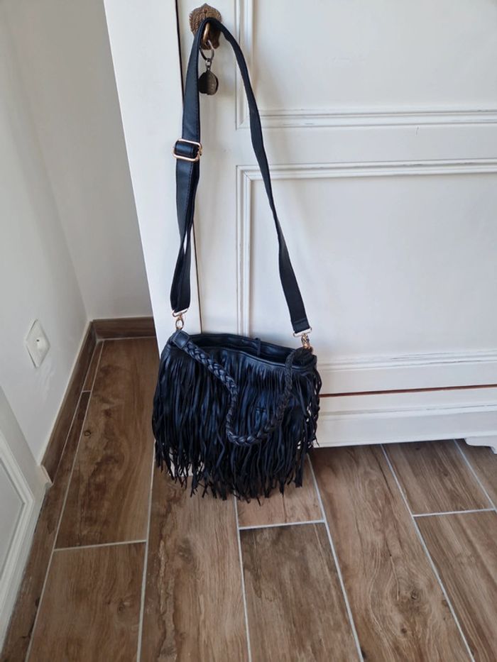 Joli sac 👜 noir 🖤avec des franges des deux côtés. Deux ances l'une est complètement Tressée et I'autre est plus grande avec des mousquetons. Elle est amovible et réglable. Grande fermeture éclair centrale. A l'intérieur une poche zippée et deux autres sans fermeture, 100 % Polyuréthane Dimensions 34×32cm #ellaben_sacs