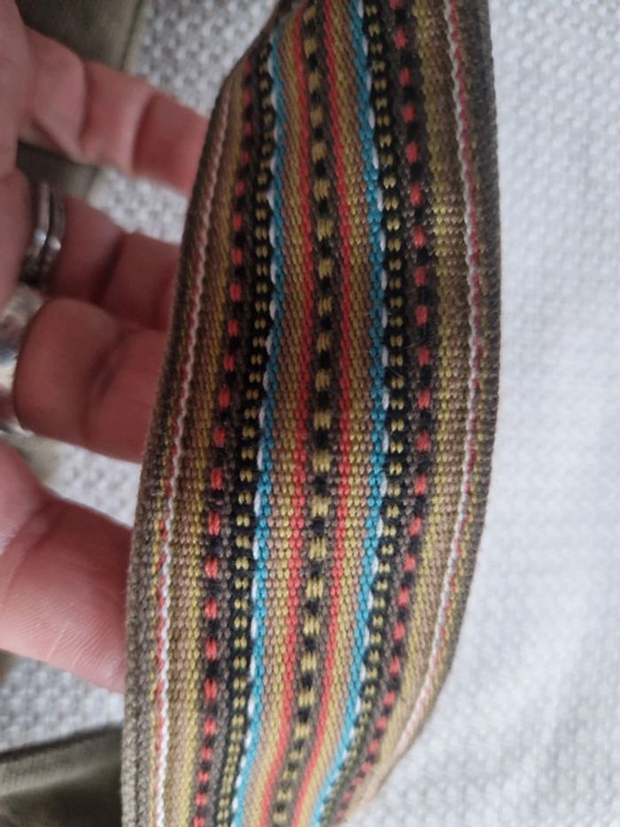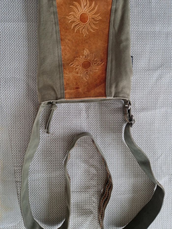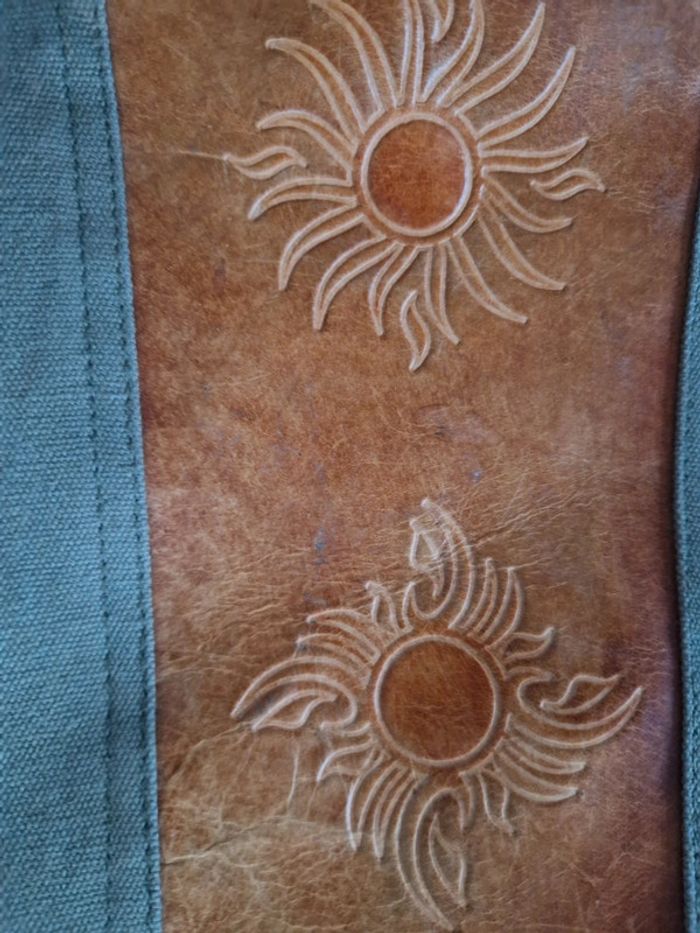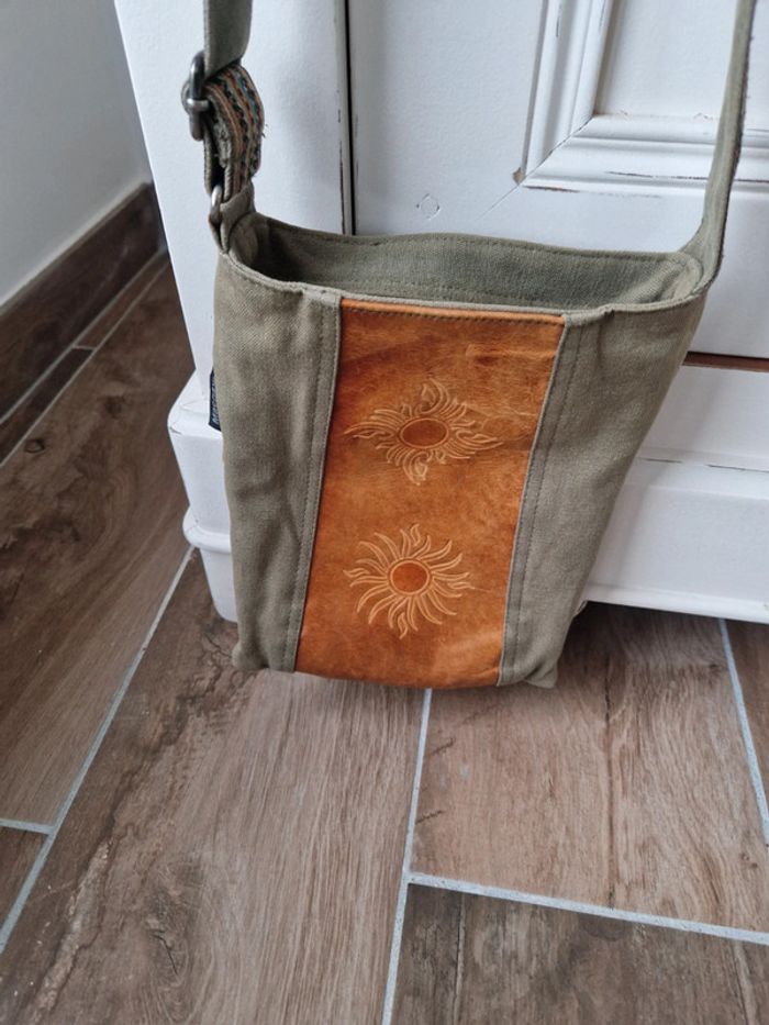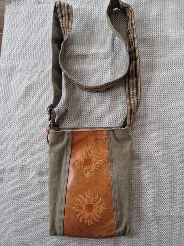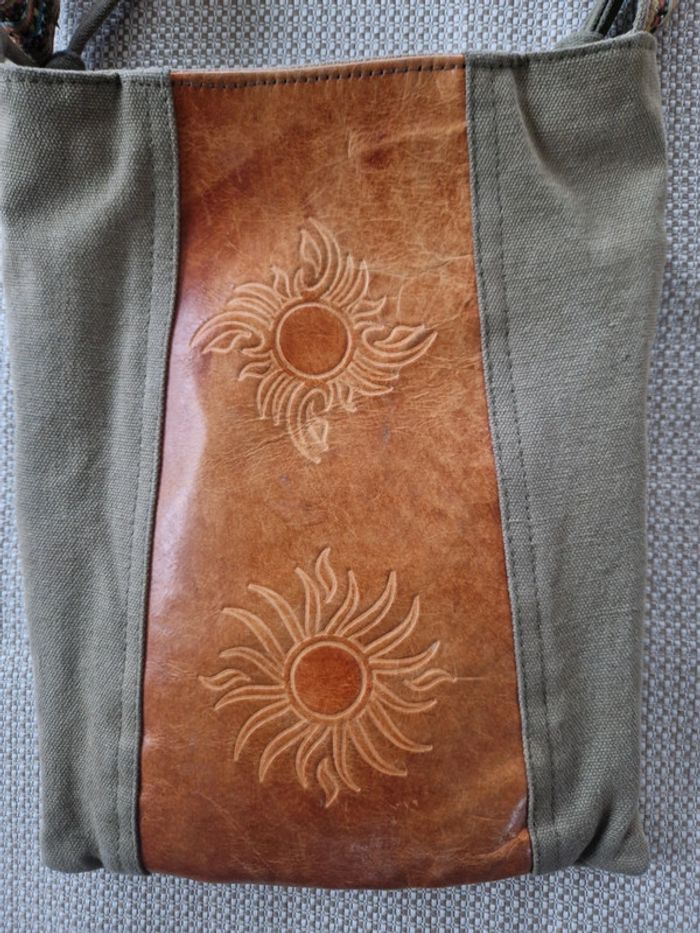 Jolie sacoche bi matière cuir et coton. Longue bandoulière réglable . Une partie extérieur en cuir avec motifs et le reste en coton épais. Pochette extérieure avec fermeture éclair idem avec l'intérieur. Fermeture centrale. Dimensions 26×21 cm #ellaben_sacs #ellaben_sacoches