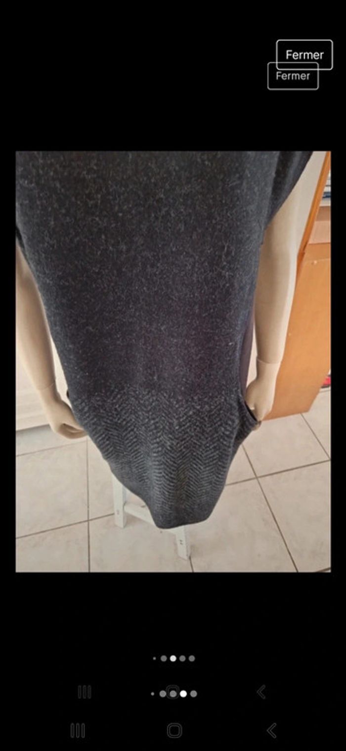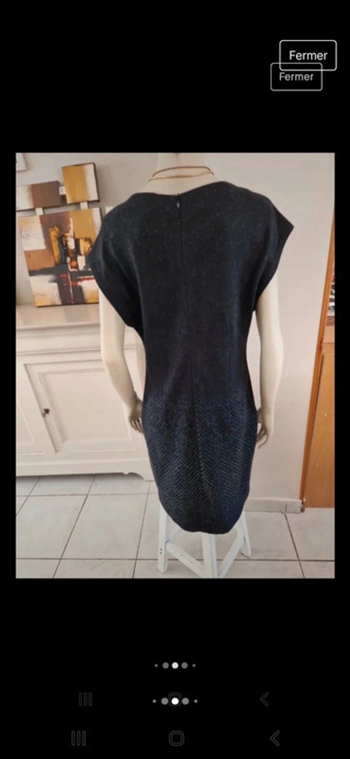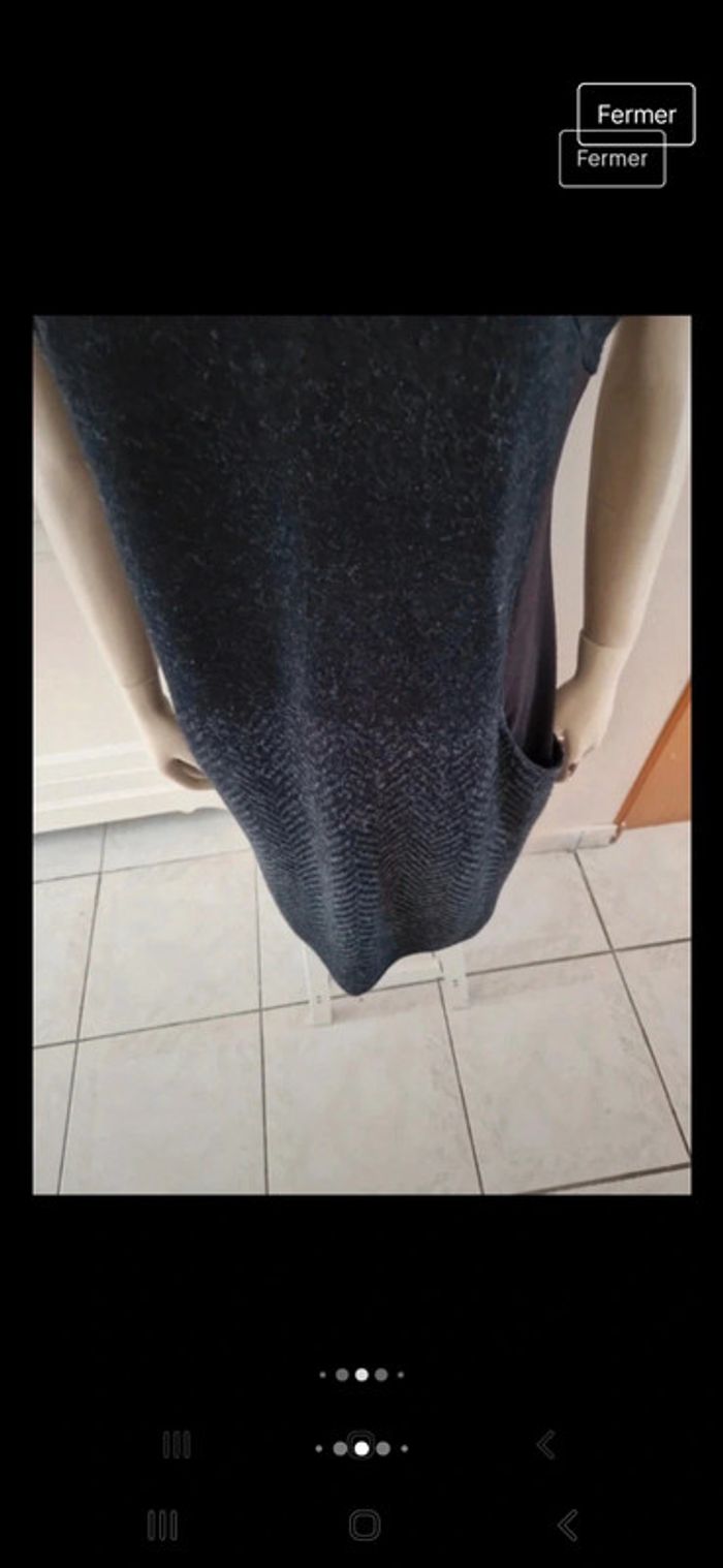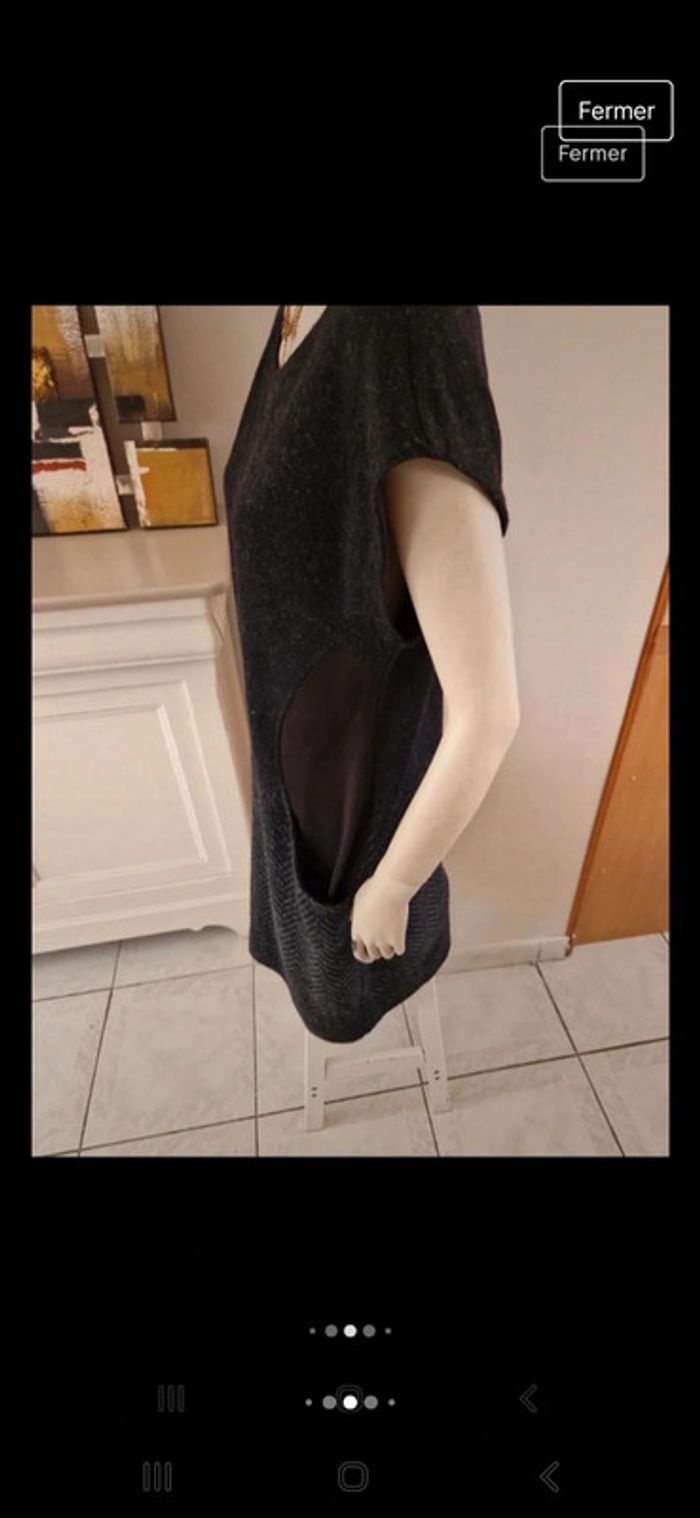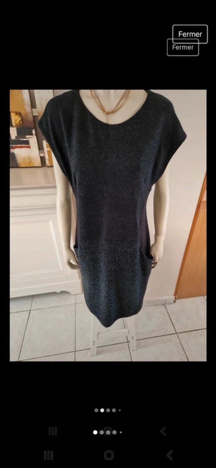 Jolie robe sans manches double matière, Encolure ronde. Deux poches à la taille. Le haut est a motifs unie noir moucheté et le bas motifs chevrons dans les mêmes tons. Confortable et agréable à porté .Tissu hiver. Taille 4 pour cette marque. #ellaben_robes #ellaben_robesnoire #ellaben_grandestailles Le tableau en fond d'écran est également en vente.
