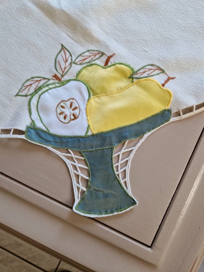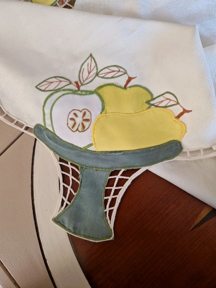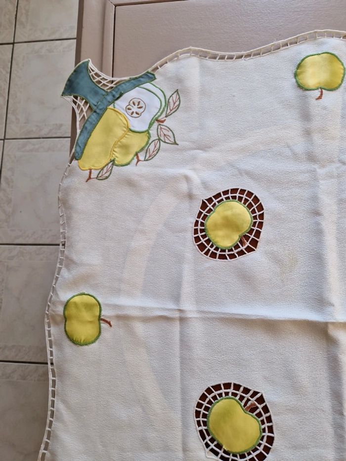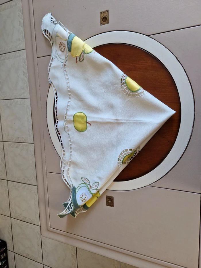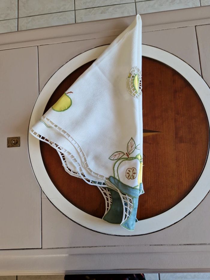 Jolie nappe brodée de différents motifs notamment des pommes vertes. Article très ancien. Dimensions 85×85 cm. #ellaben_lingedemaison