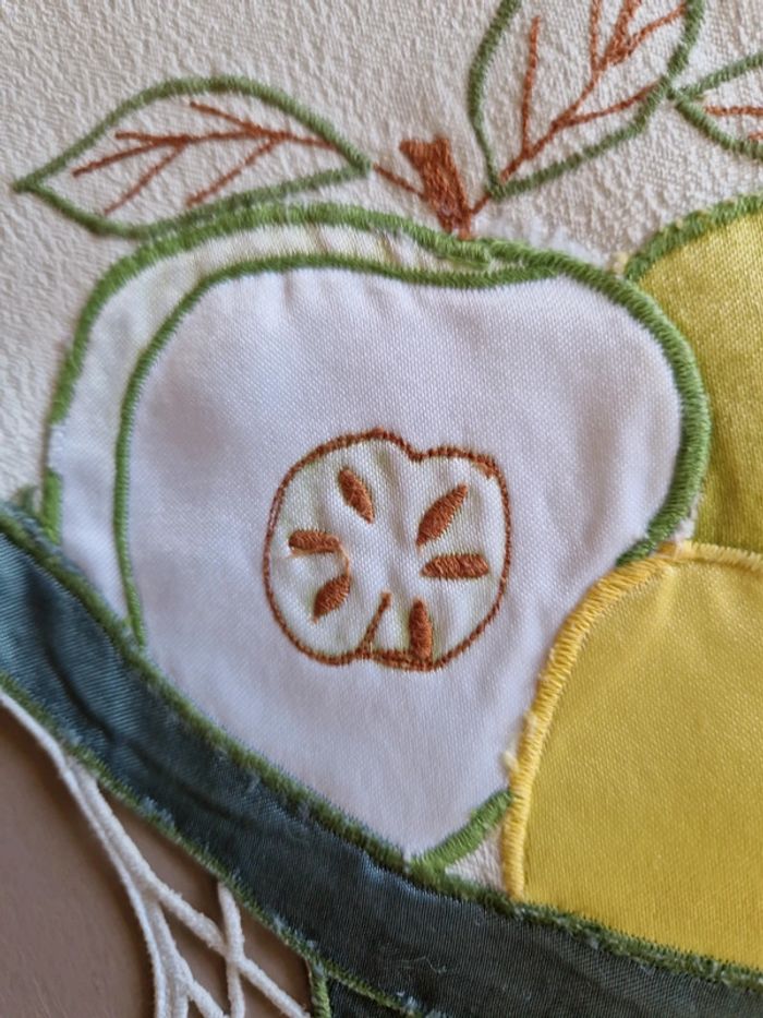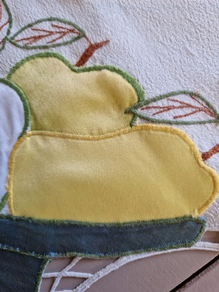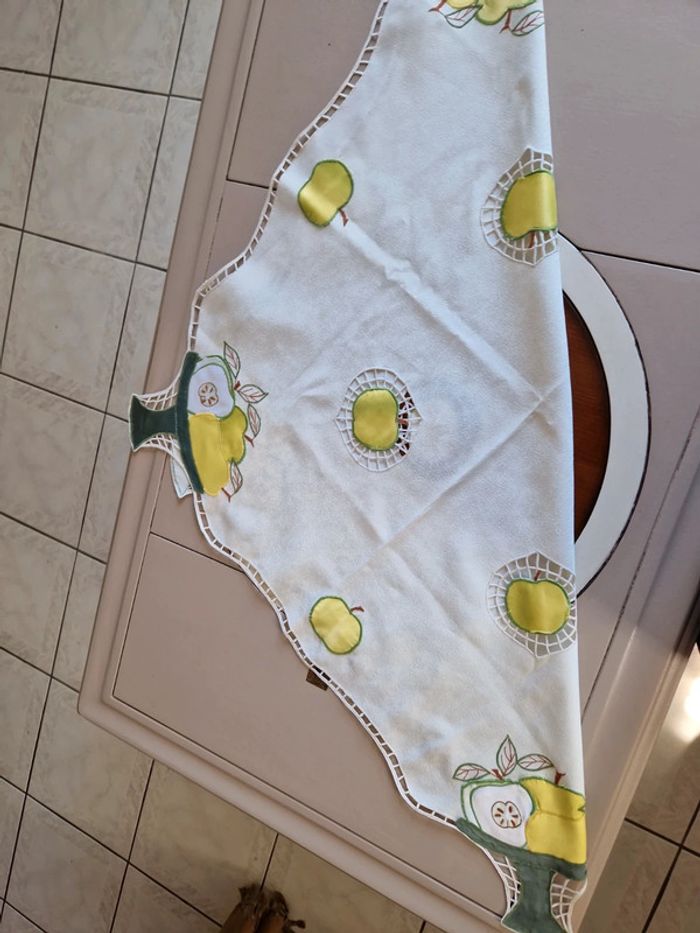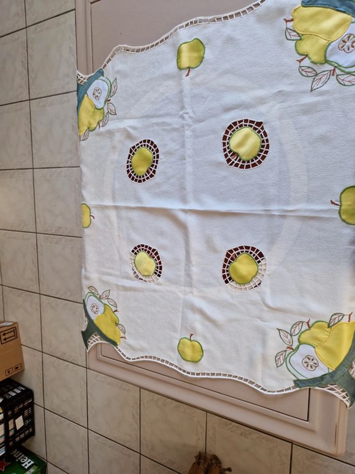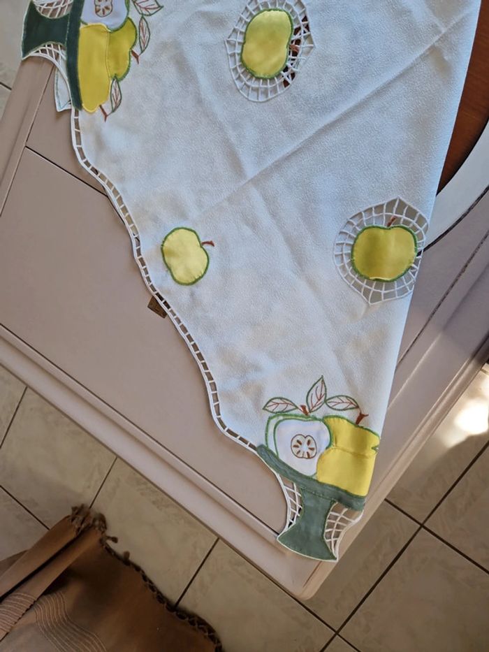 Jolie nappe brodée de différents motifs notamment des pommes vertes. Article très ancien. Dimensions 85×85 cm. #ellaben_lingedemaison