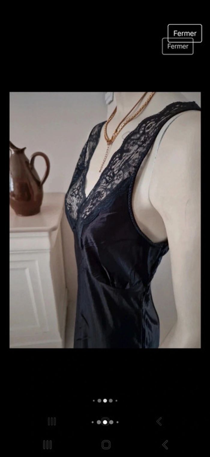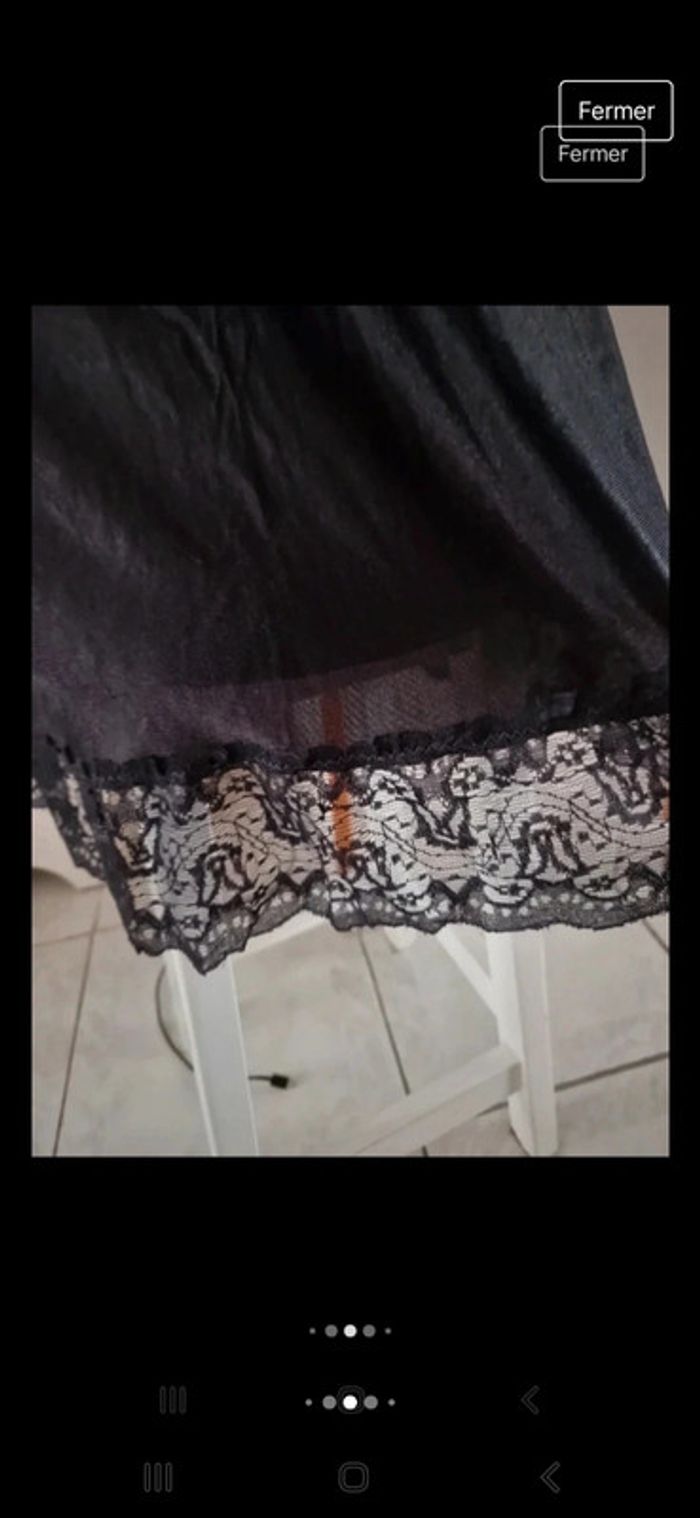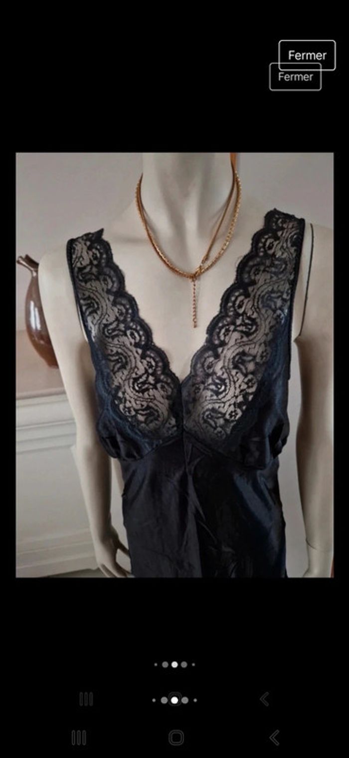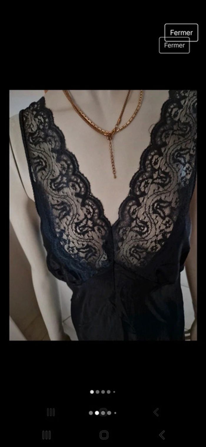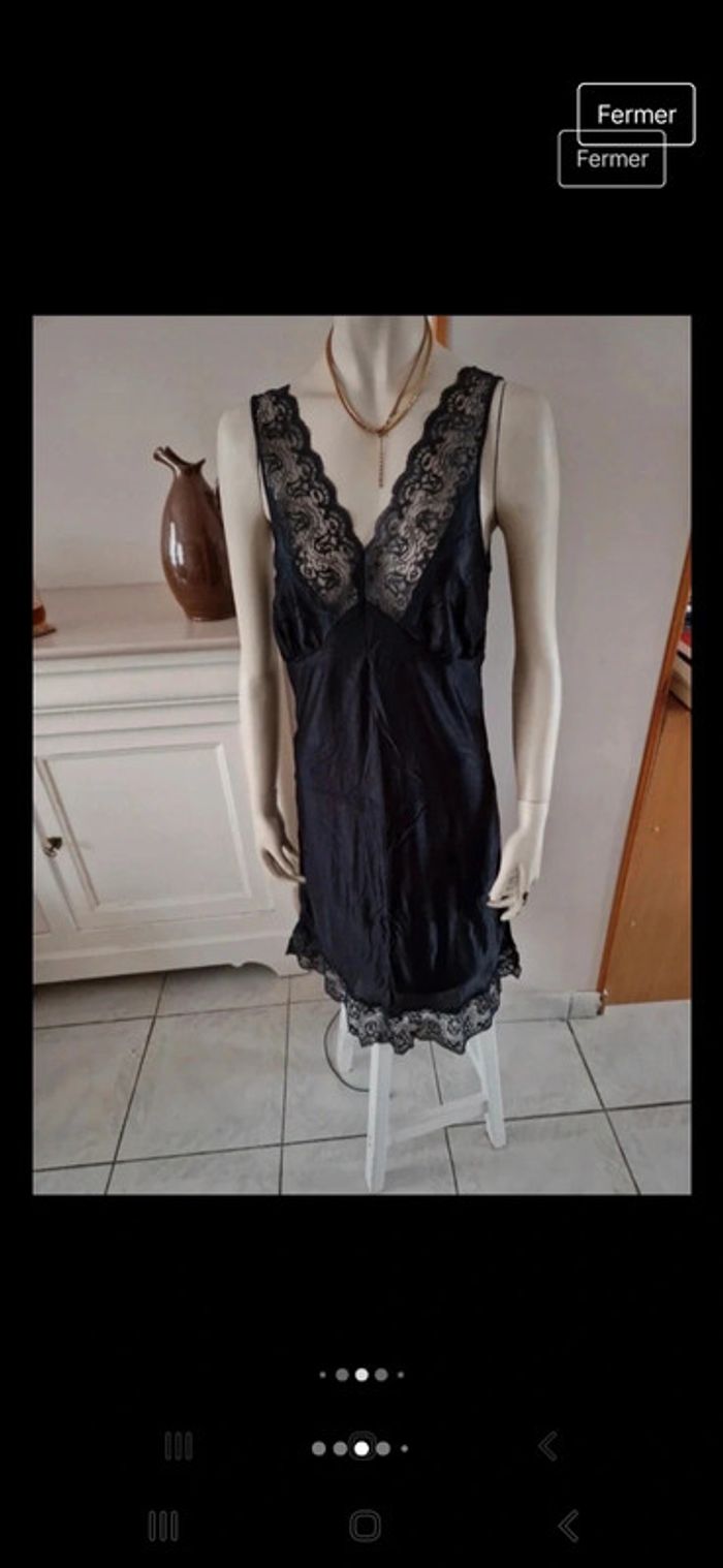 Deux chemises de nuit satiné. L'une rose à manches bouffantes et dentelle. La seconde noir décolleté en V devant et derrière tout en dentelles. Sur le bas de la nuisette un volant en dentelle vient ajouter un petit côté romantique La rose est en très bon état et la noire neuve. Taille 38/40 #ellaben_pyjama