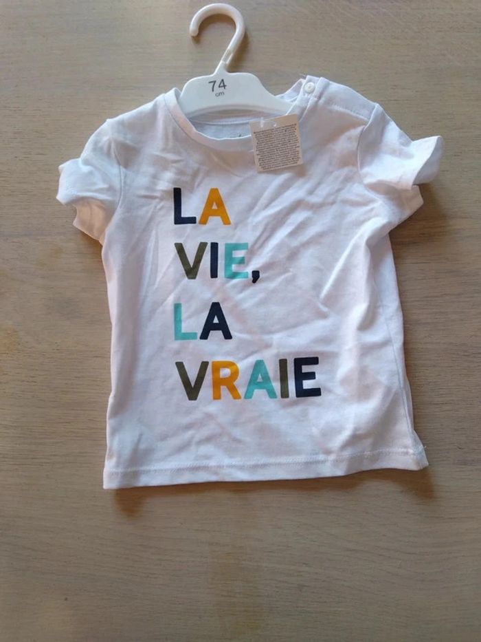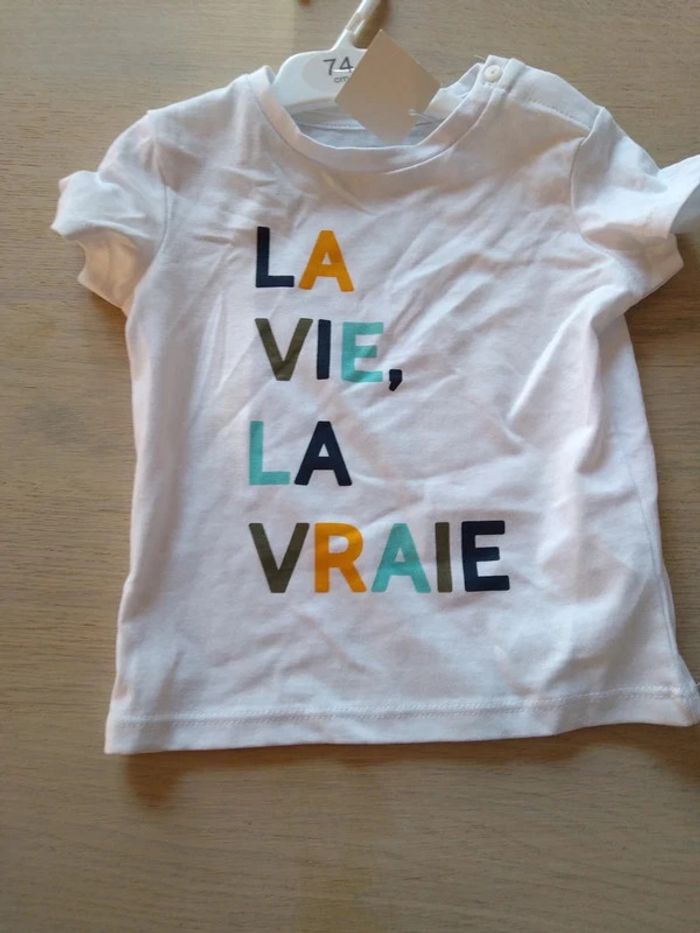 Tee-shirt blanc à manches courtes. Message en couleur "La vie, la vraie" Coton organique. Neuf, avec étiquette. Taille 74cm 12 mois #marine4932garçon12mois Réductions activées !