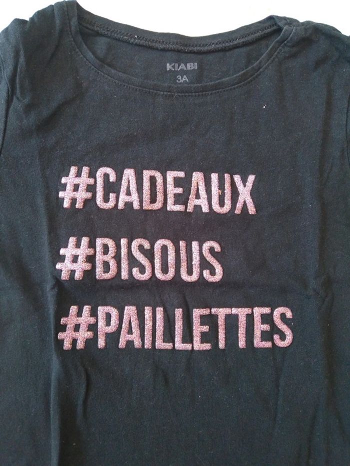 Tee-shirt noir à manches longues. #CADEAUX #BISOUS #PAILLETTES Écrits en lettres irisées, brillantes et en relief. Coton Taille 3 ans #marine4932fille3ans